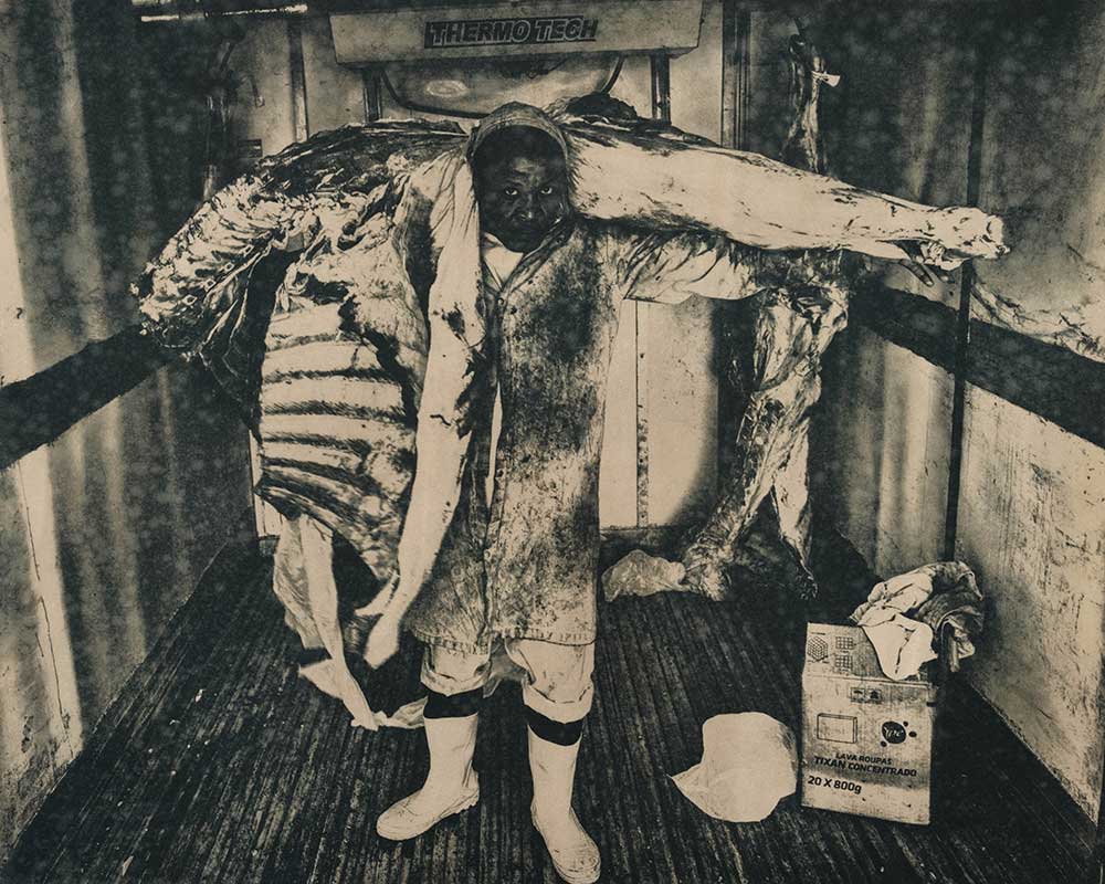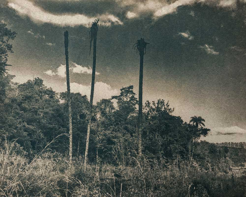This project consists of coffee-stained cyanotypes, created using one of the first photographic processes developed in the mid-19th century. The principal active ingredient is iron salts, evoking the area known as the “Iron Triangle” where this imagery was captured. The state contains the world’s richest veins of iron ore, and mining comprises much of its economic activity today. Slavery was essential to the gold mining cycle that began in the 17th century and preceded the current iron industry. While Brazil abolished slavery in 1888—the last country in the Americas to do so—its systems and structures persist to this day.