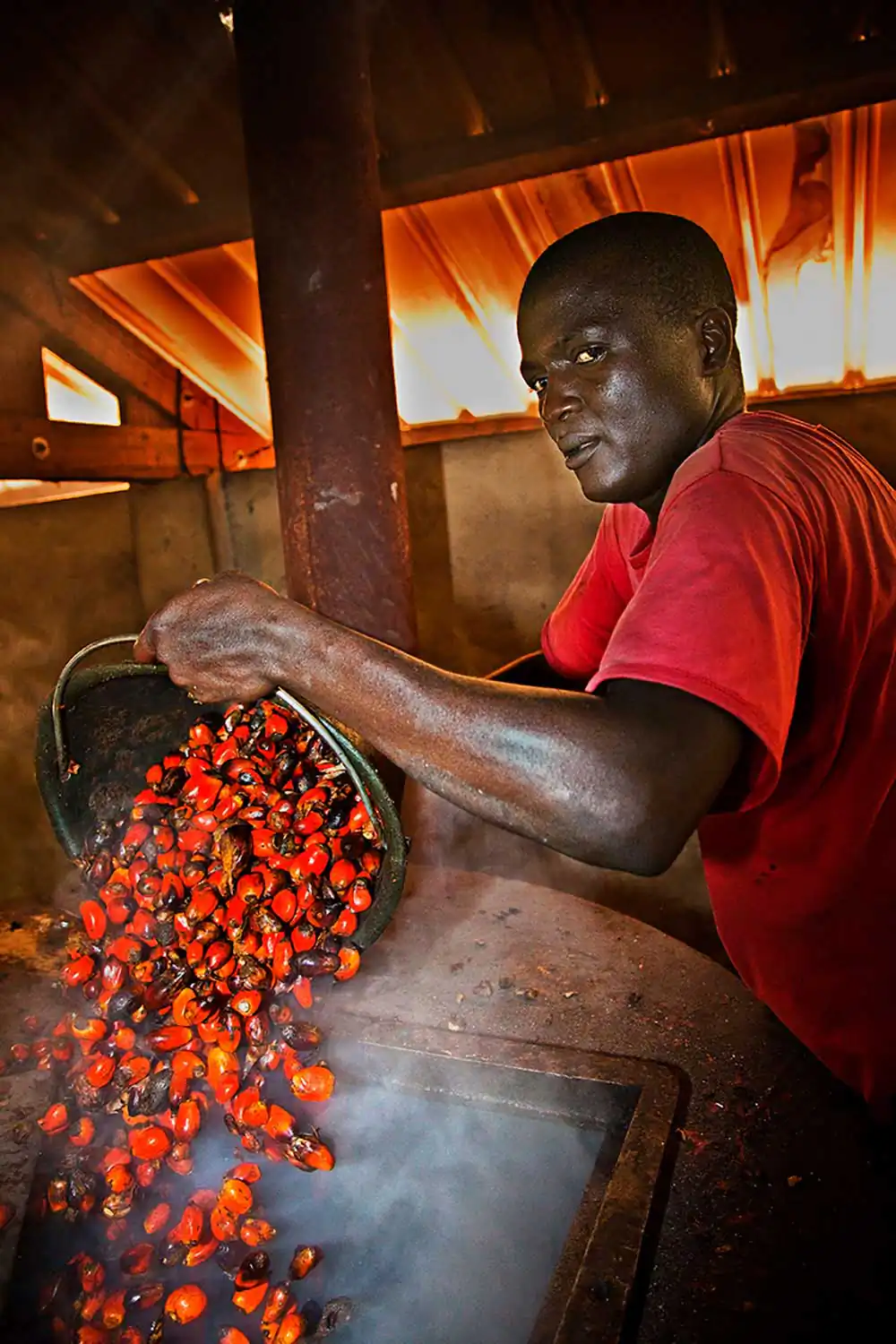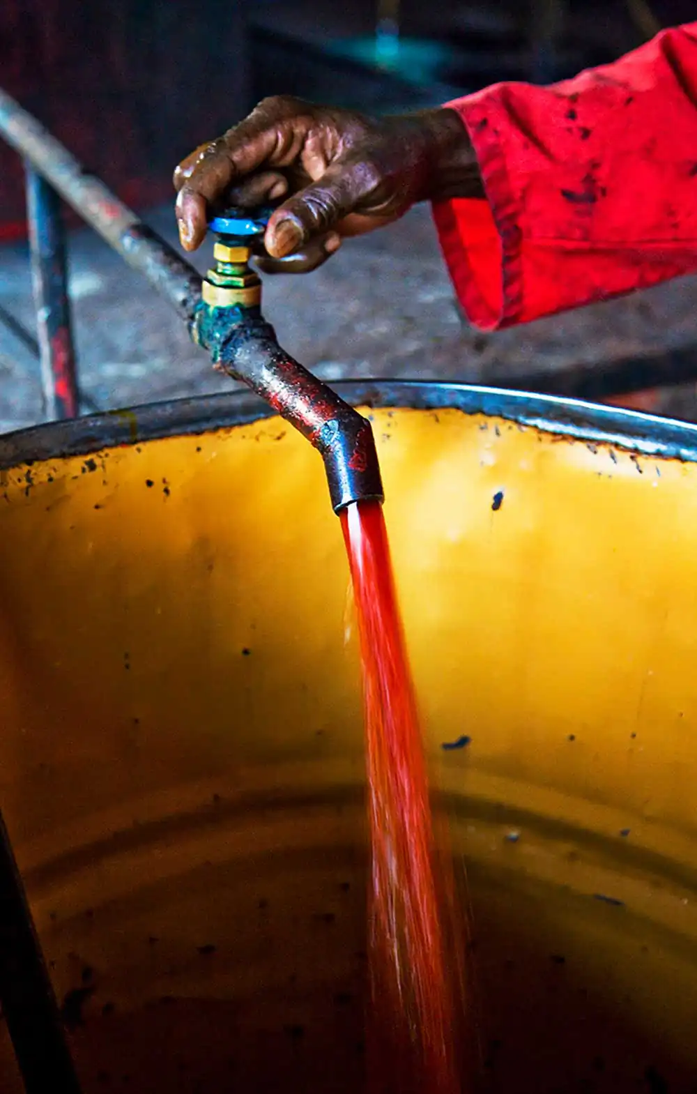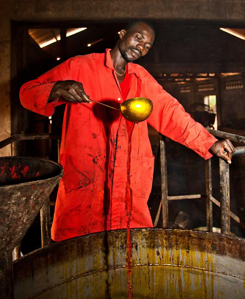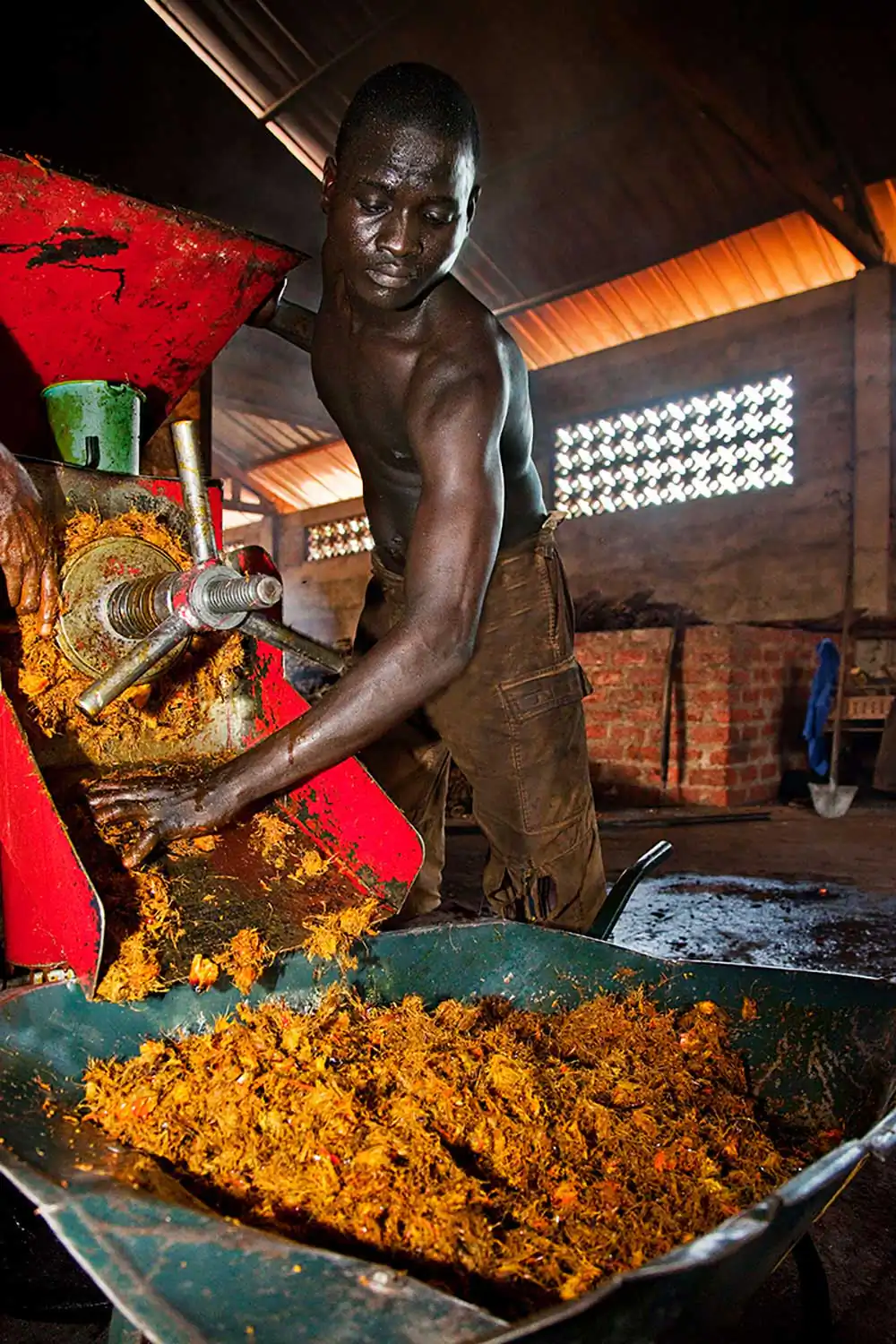 Each plant produces several clusters of dates which, black when unripe, turn orange red at the end of ripening. They are then collected and processed with an almost completely manual process to produce a reddish and viscous oil with an intense flavor. Today rudimentary machines are used, but for part of the work, the favorite tool remains the machete. It is a long and heavy cutlass that in Africa is responsible for many massacres and mutilations, but which here, fortunately, is used only as a tool. After cleaning, the dates are steamed in a large tank until they soften and begin to exude oil. Subsequently a screw press squeezes the pulp producing crude oil which is collected in a basin.