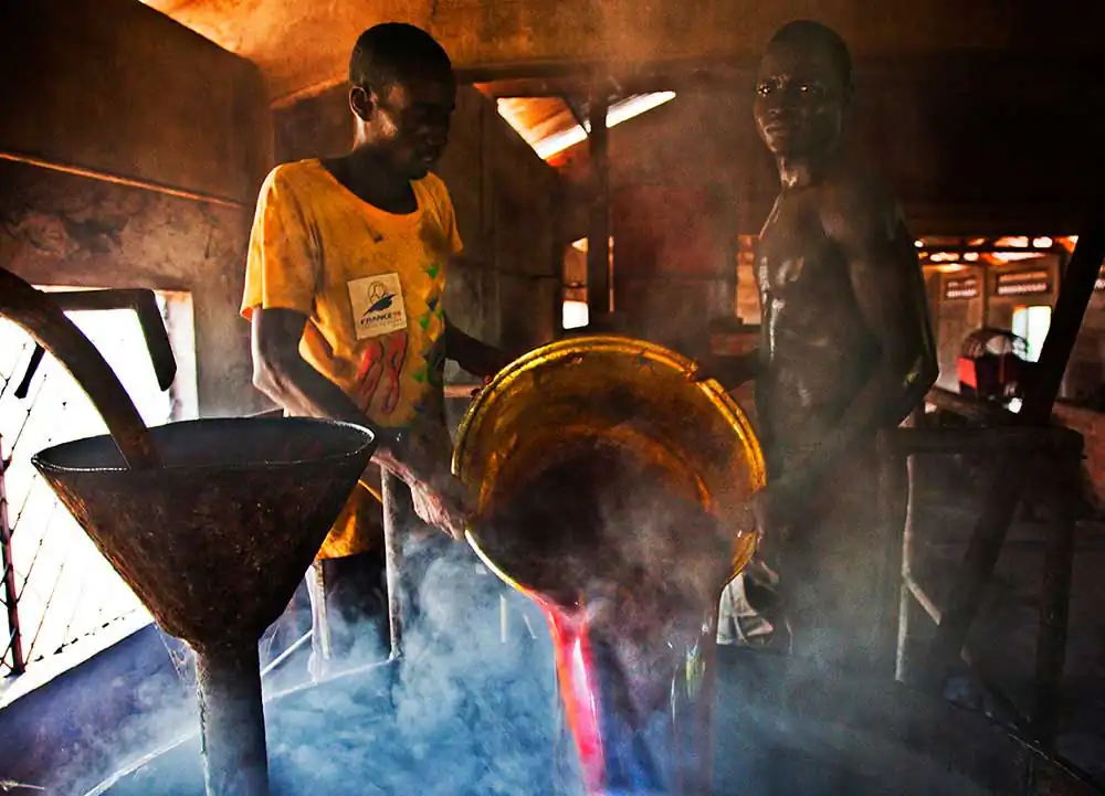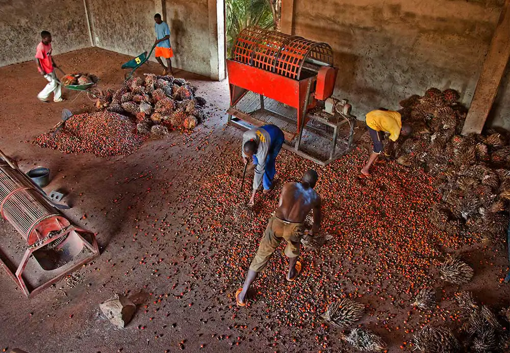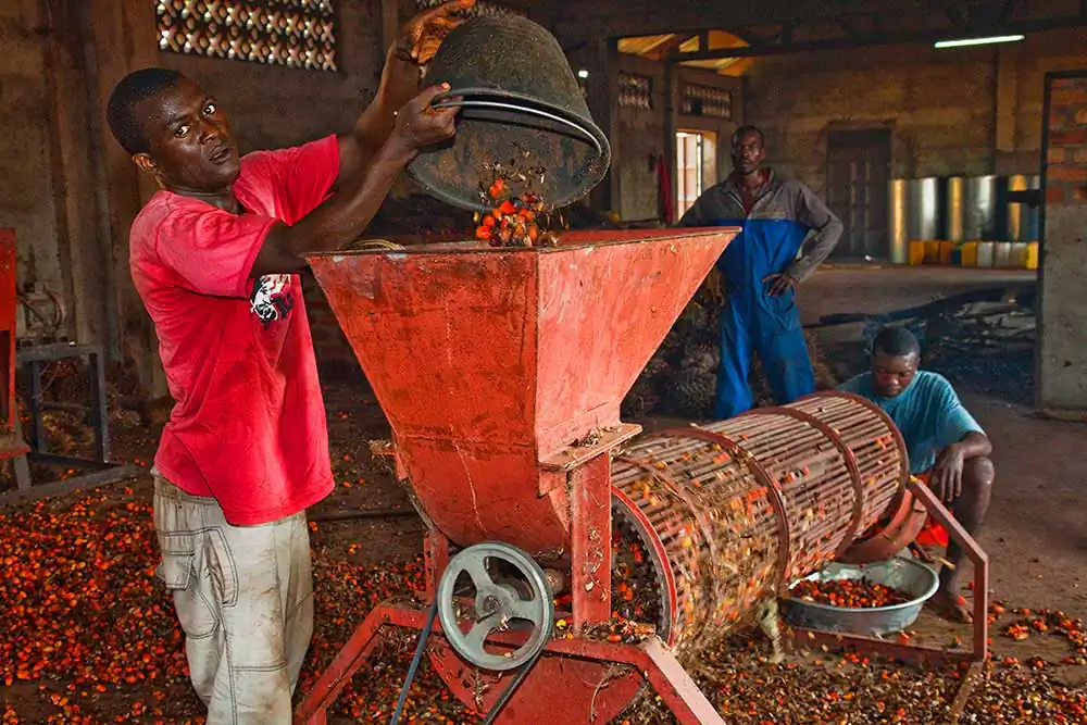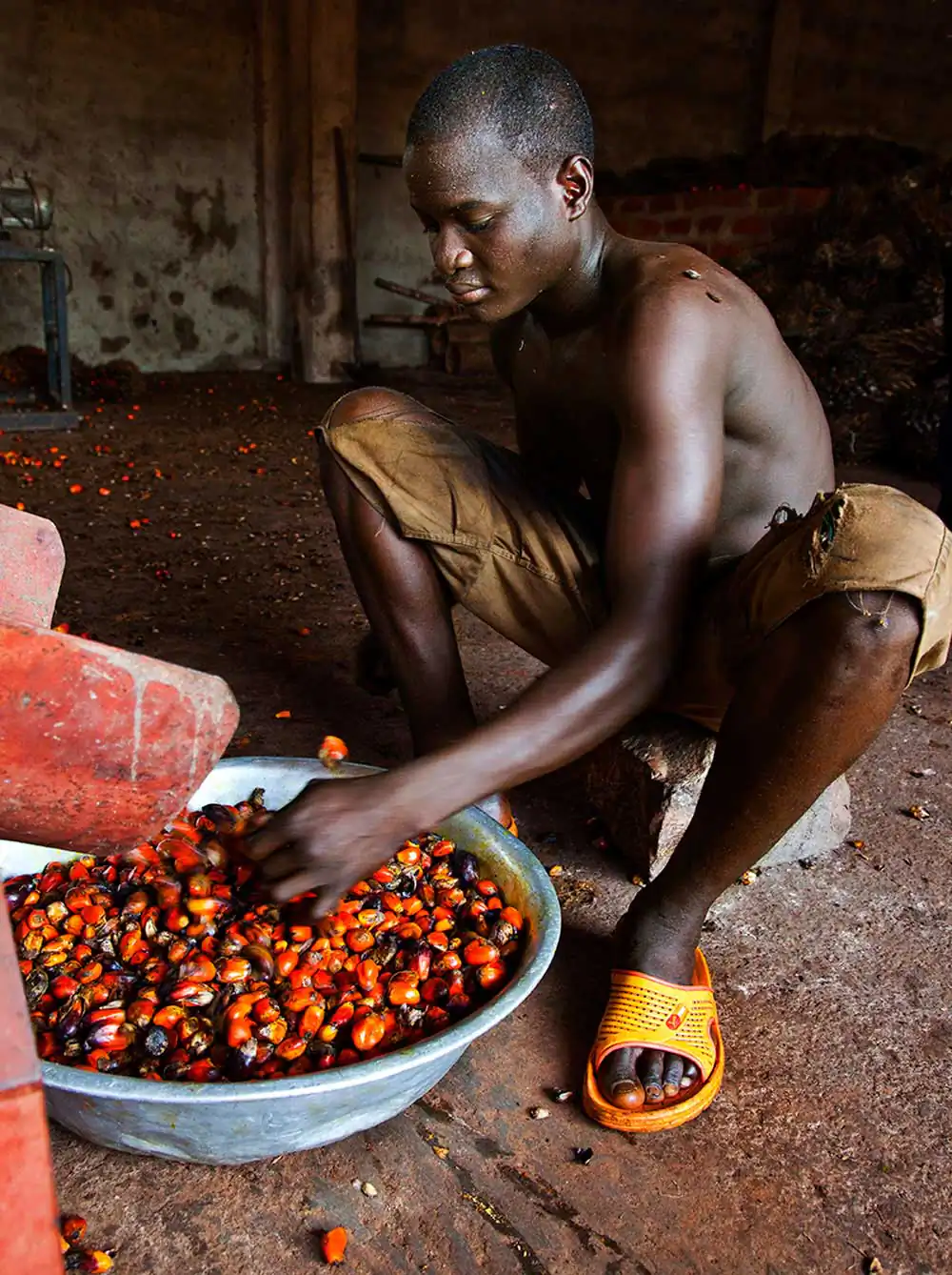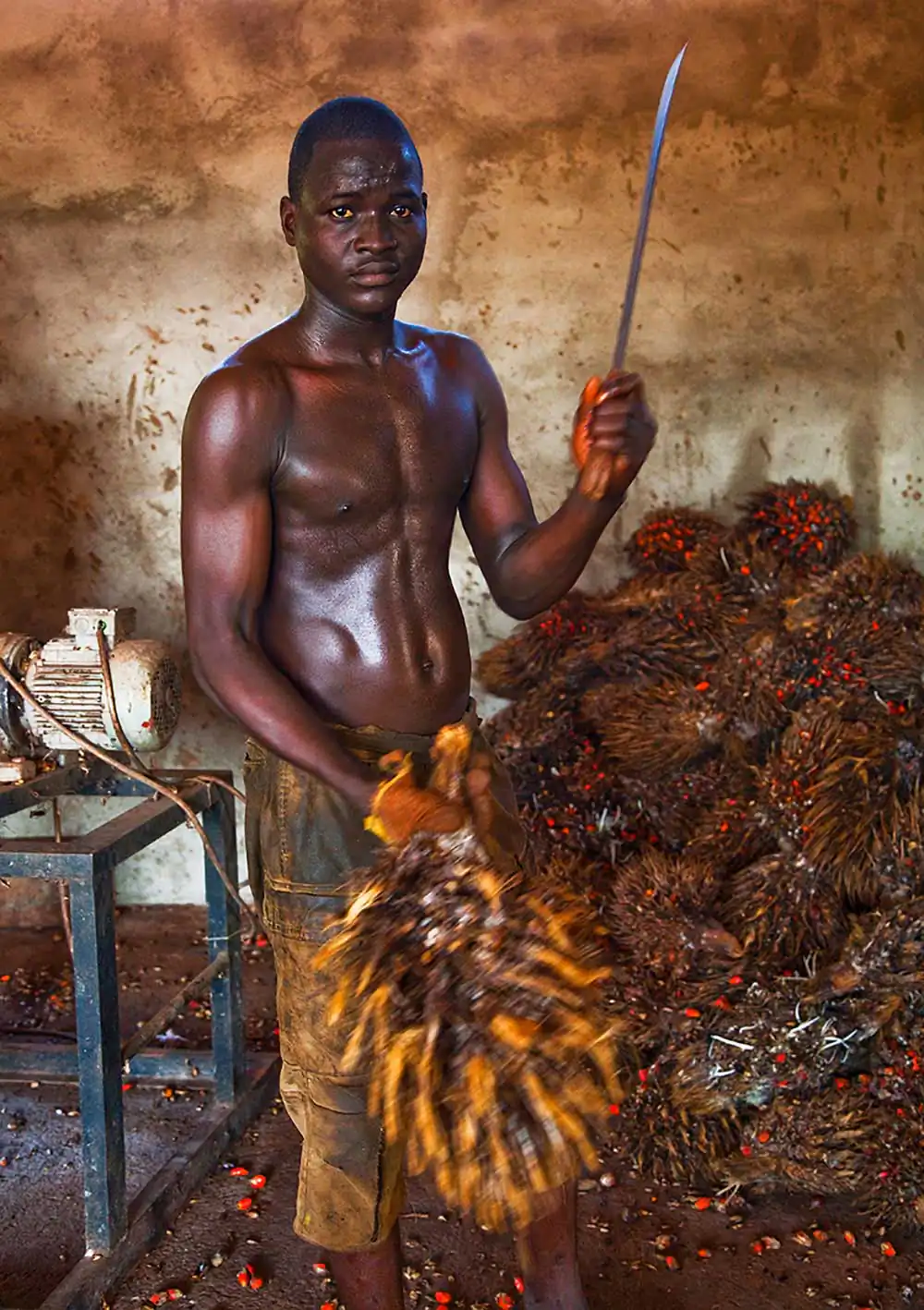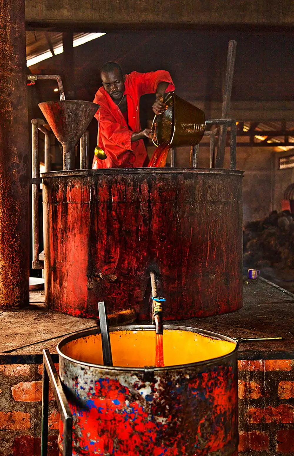 Each plant produces several clusters of dates which, black when unripe, turn orange red at the end of ripening. They are then collected and processed with an almost completely manual process to produce a reddish and viscous oil with an intense flavor. Today rudimentary machines are used, but for part of the work, the favorite tool remains the machete. It is a long and heavy cutlass that in Africa is responsible for many massacres and mutilations, but which here, fortunately, is used only as a tool. After cleaning, the dates are steamed in a large tank until they soften and begin to exude oil. Subsequently a screw press squeezes the pulp producing crude oil which is collected in a basin.