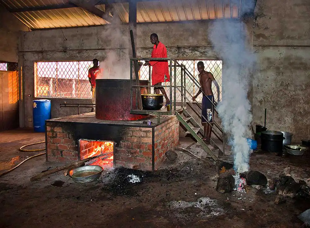 The proceeds are then poured into a second boiler and cooked for hours with a little water. During this process the crude oil cleanse itself of the heavier impurities that remain at the bottom of the container. Water is then added, causing stratification, until the lighter layer of oil is pushed to a tap placed on the side of the boiler. The finished product is thus percolated and collected in a metal drum. The process might be uninteresting, but what makes it spectacular is human participation. The work of the workers gives life and charm to the scene.