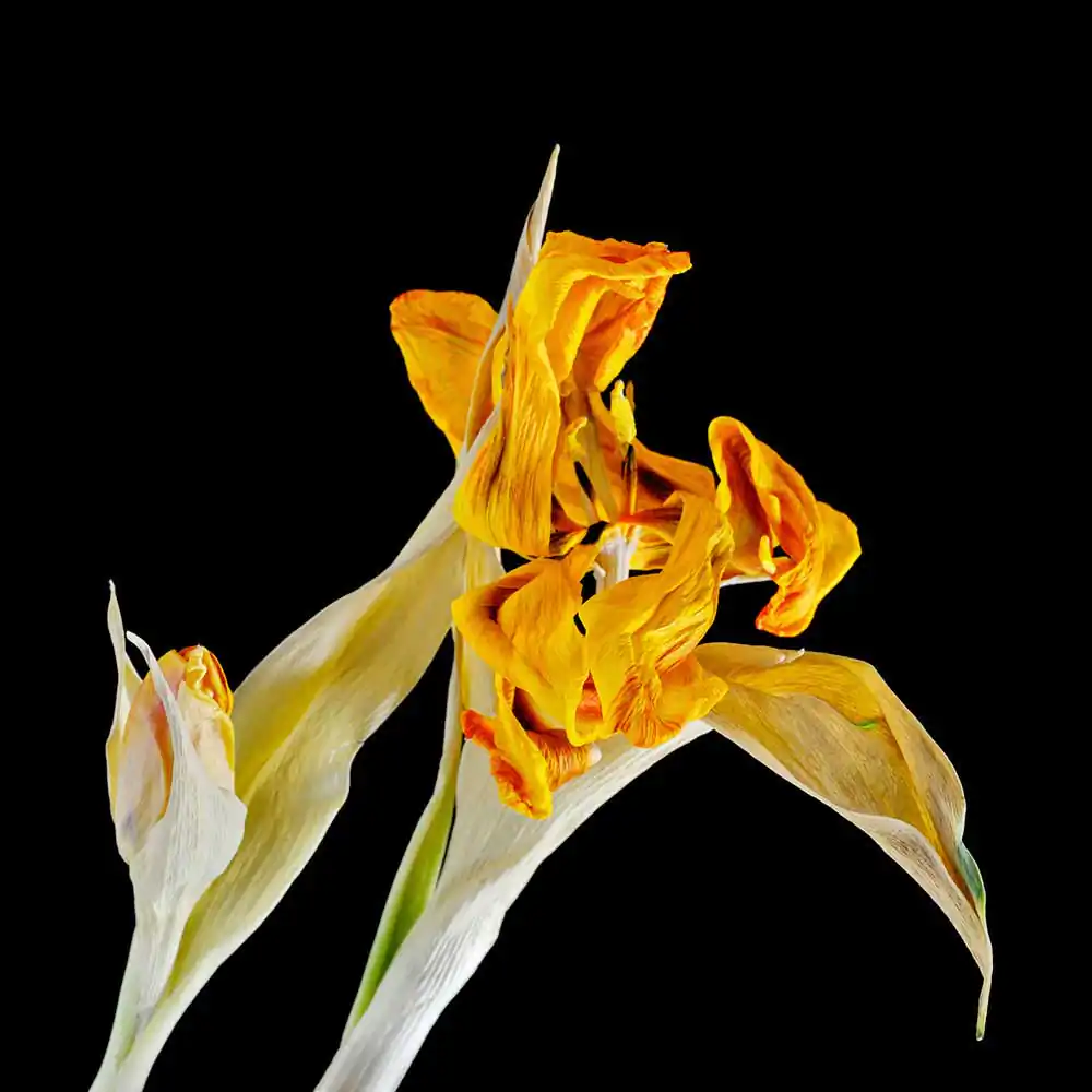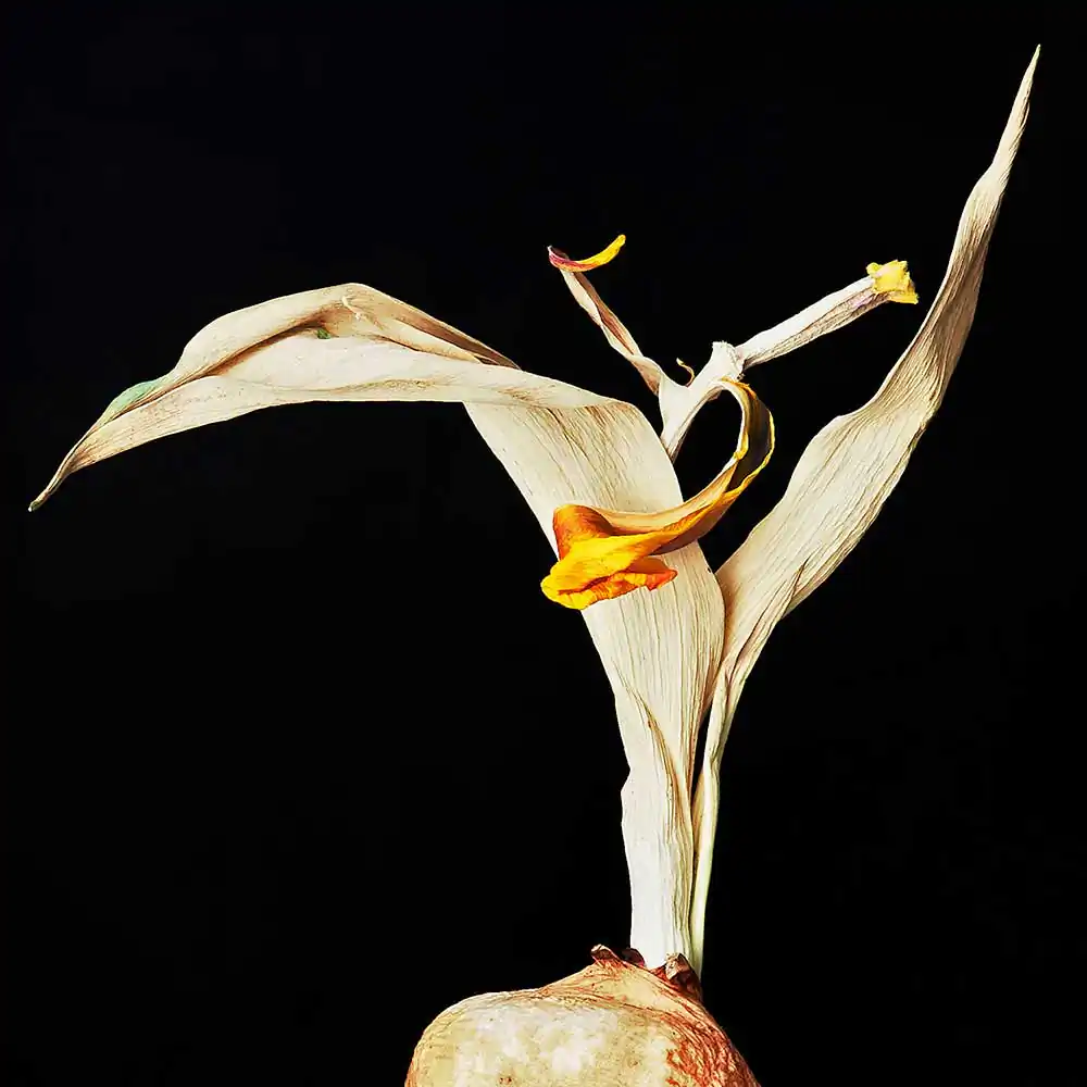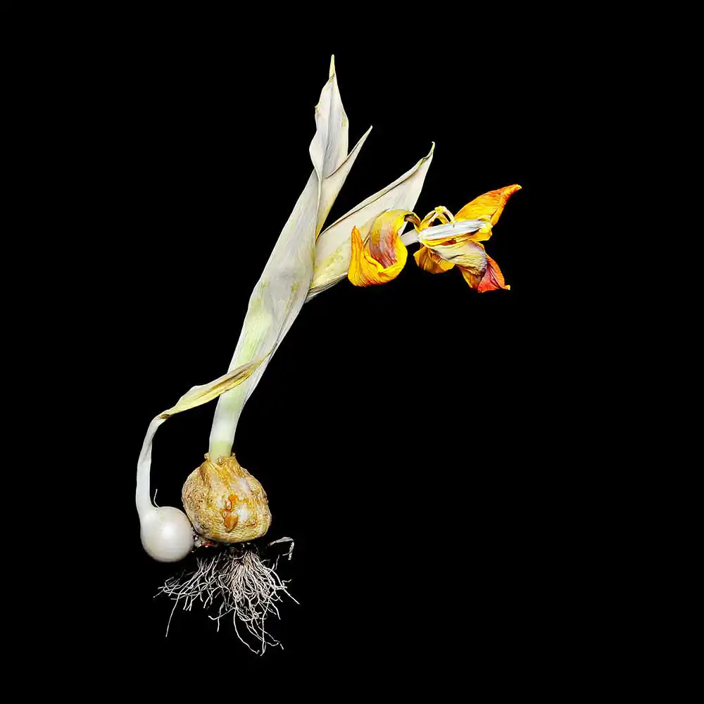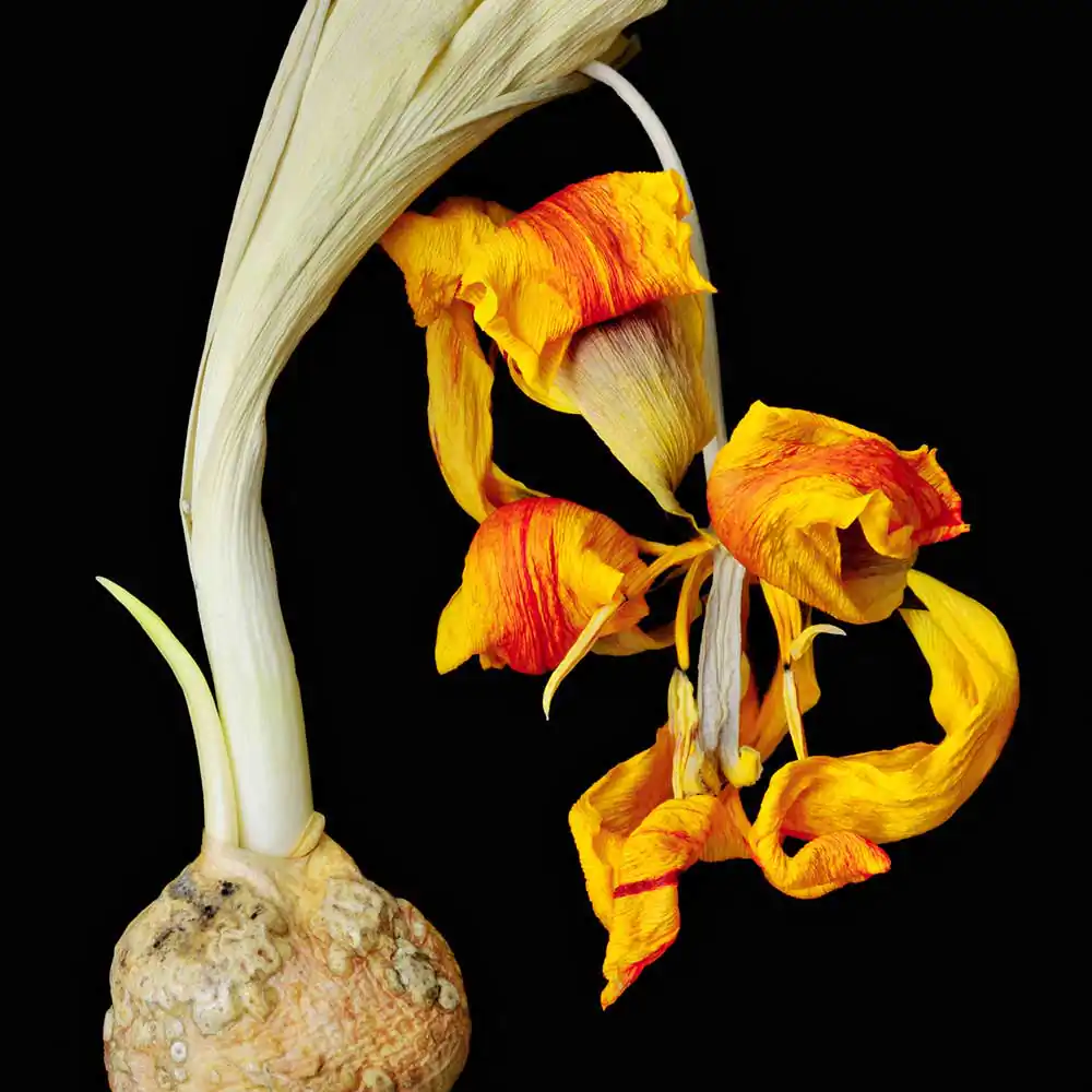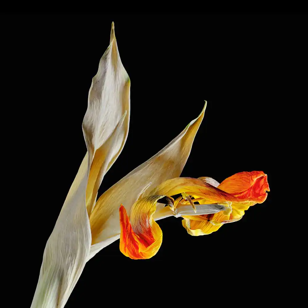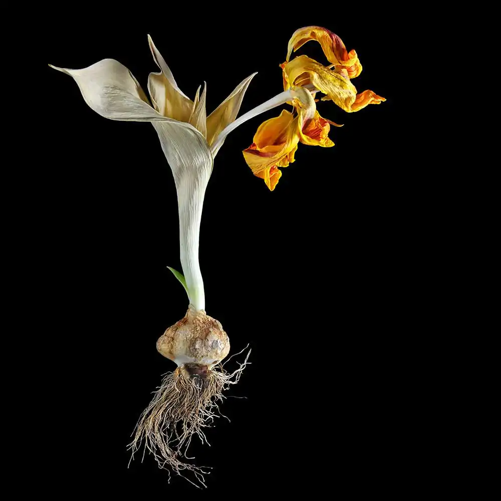 For this purpose the flowering tulips were deliberately no longer poured and placed in darkness. The gradual drying oft he plants changed the colours and structures oft he petals again and again. Dropped leaves were not replaced, so that each plant was given a typical appearance. After drying, the plants were carefully removed from the potting soil to photograph the whole plant and details.