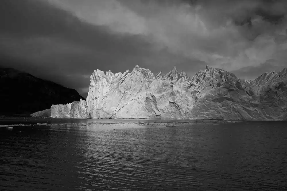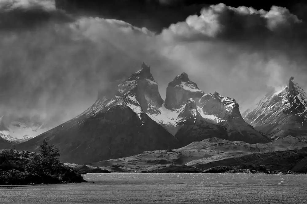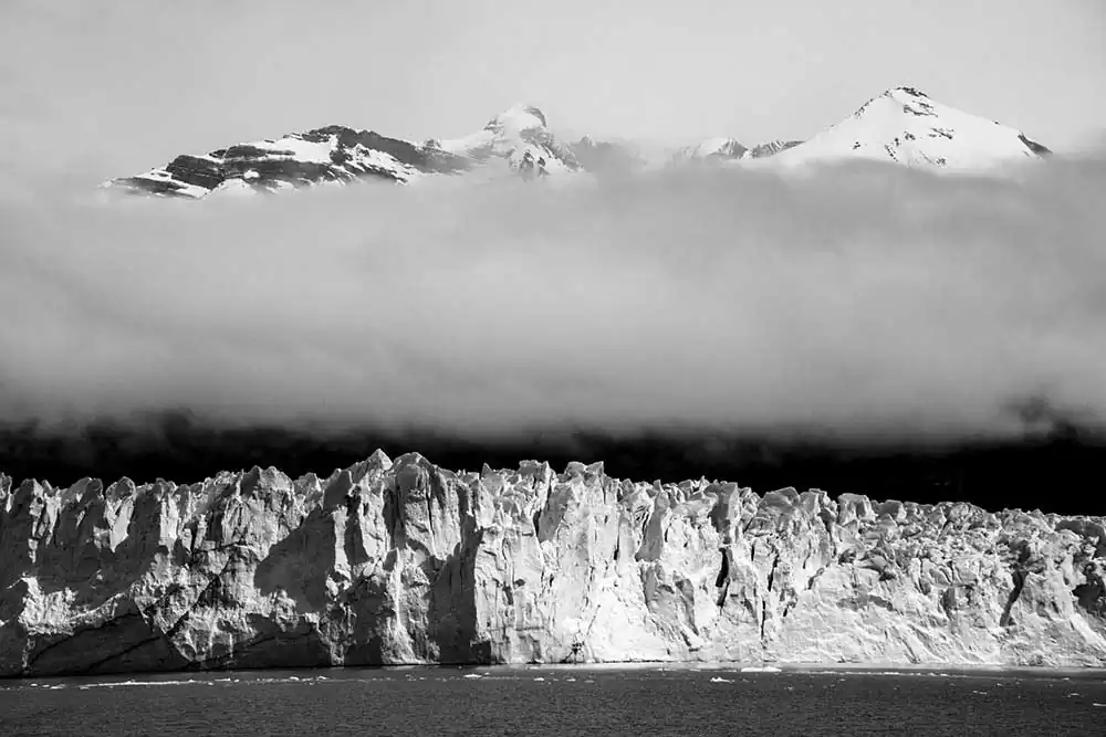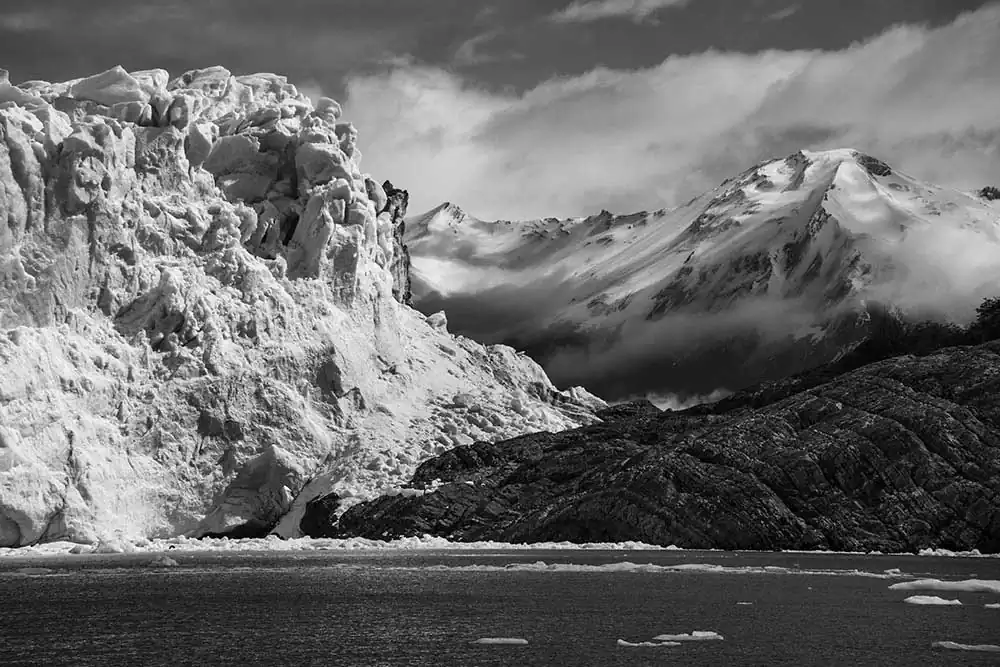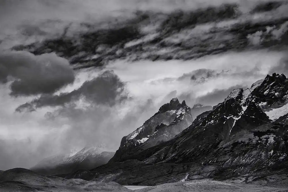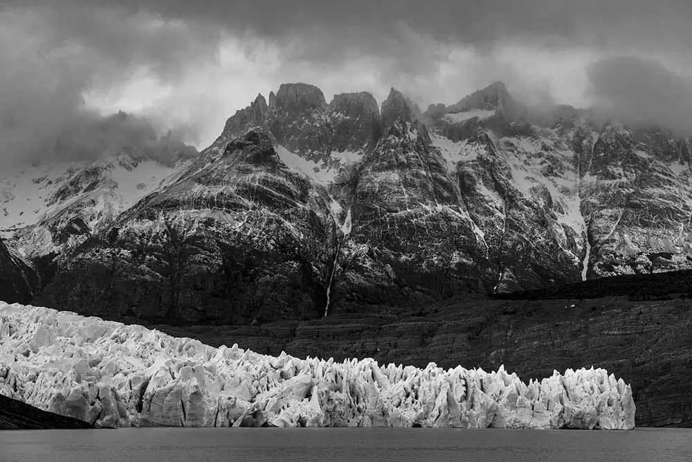 My experience with Patagonia began last November on the Argentina side of the Andes. It started in El Calafate in Los Glaciares National Park. These first images are of Perito Moreno, Upsala and Spegazzini Glaciers looming above us. The face of these glaciers soars to 300 ft above the water, and a staggering 500 ft below the surface in places. As you approach the glacier the chill of the blue ice is caught by the wind, dropping the temperature and making your eyes water. These glaciers are tremendous in size and scale, you can feel their age, although most of them are emblems of climate change, receding at a tremendous rate. I then traveled south 200 miles and crossed over the border to Chile and Torres del Paine in the heart of the Patagonia National Park of Chile. It is an unspoiled land, with sparse signs of man, few roads and fewer places of lodging. The Hotel Las Torres is an anchor on the famous “W” trekking trail of Patagonia. At the base of the Paine Masif, the famous Torres del Paine limestone towers rise up into the nearly ever-present clouds. The weather is as unpredictable as anywhere on the globe but the vistas were always breathtaking. The park feels untouched, a vast expanse of beauty that only attracts 115,000 visitors a year in its almost 1000 square miles. The majesty of this unspoiled land is unsurpassed and left me spell-bound at the beauty we were privileged to admire and absorb.Black & White seemed the only way to convey the untouched beauty of this magnificent land.