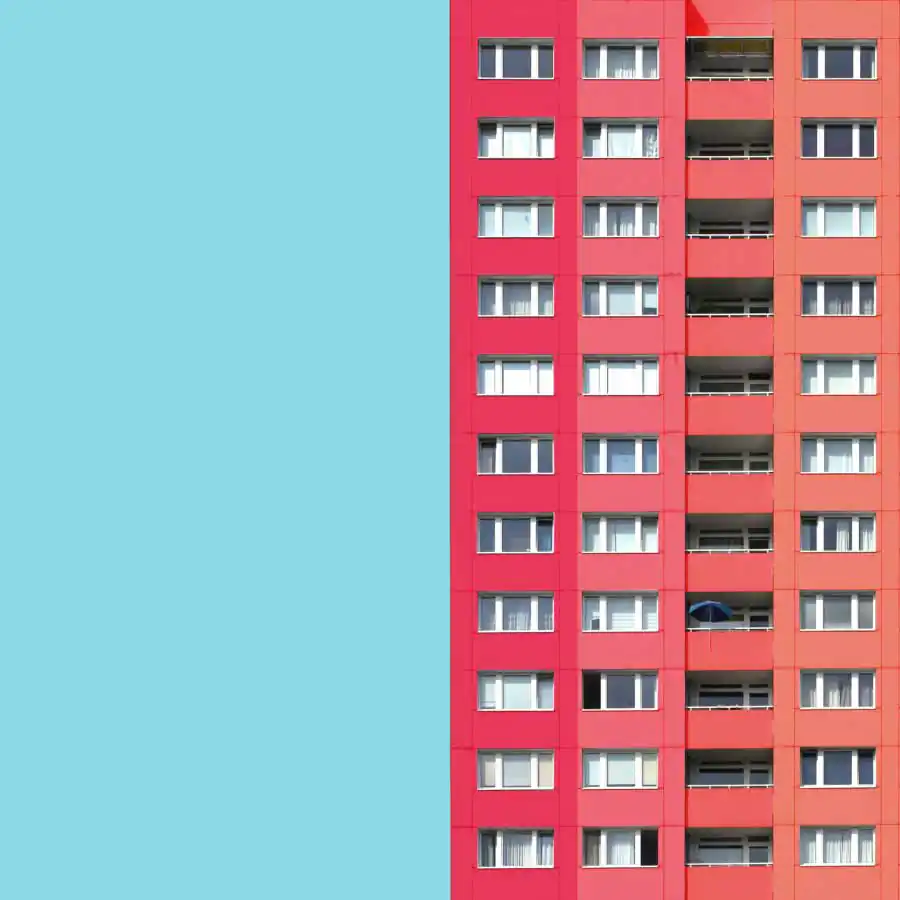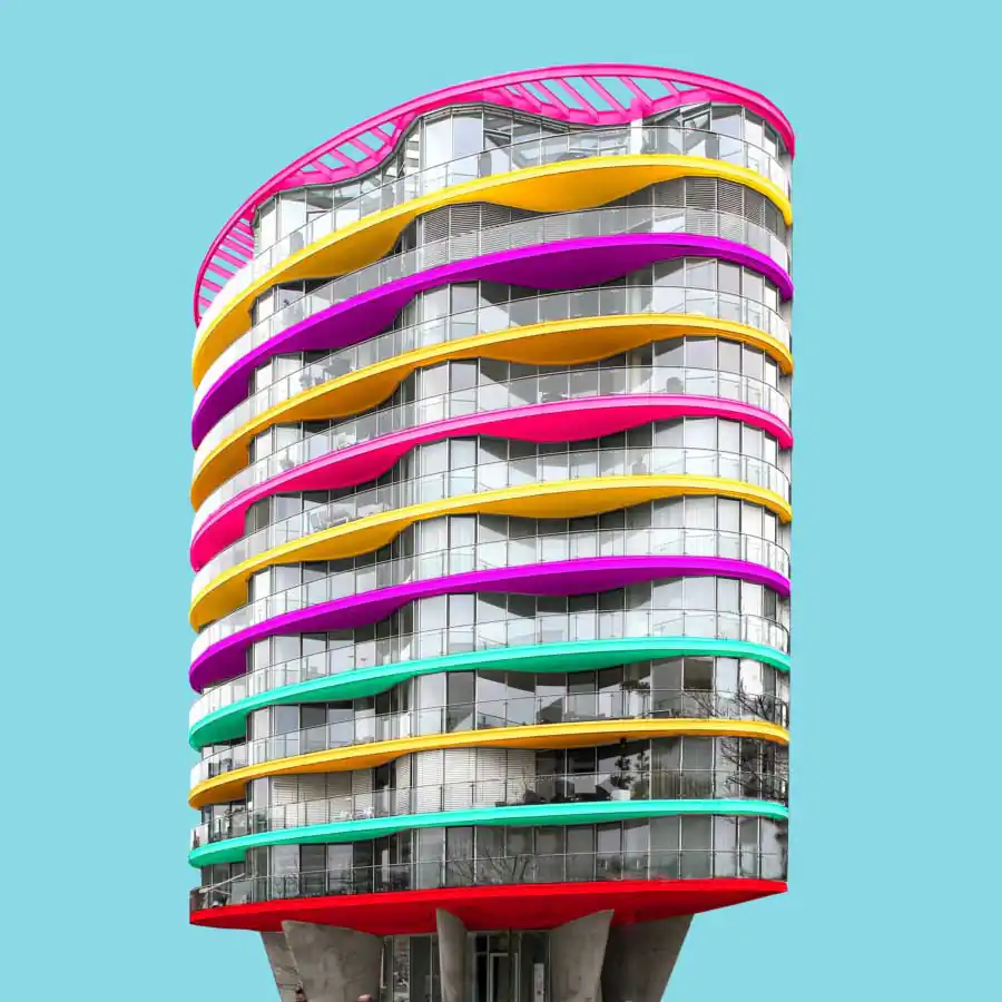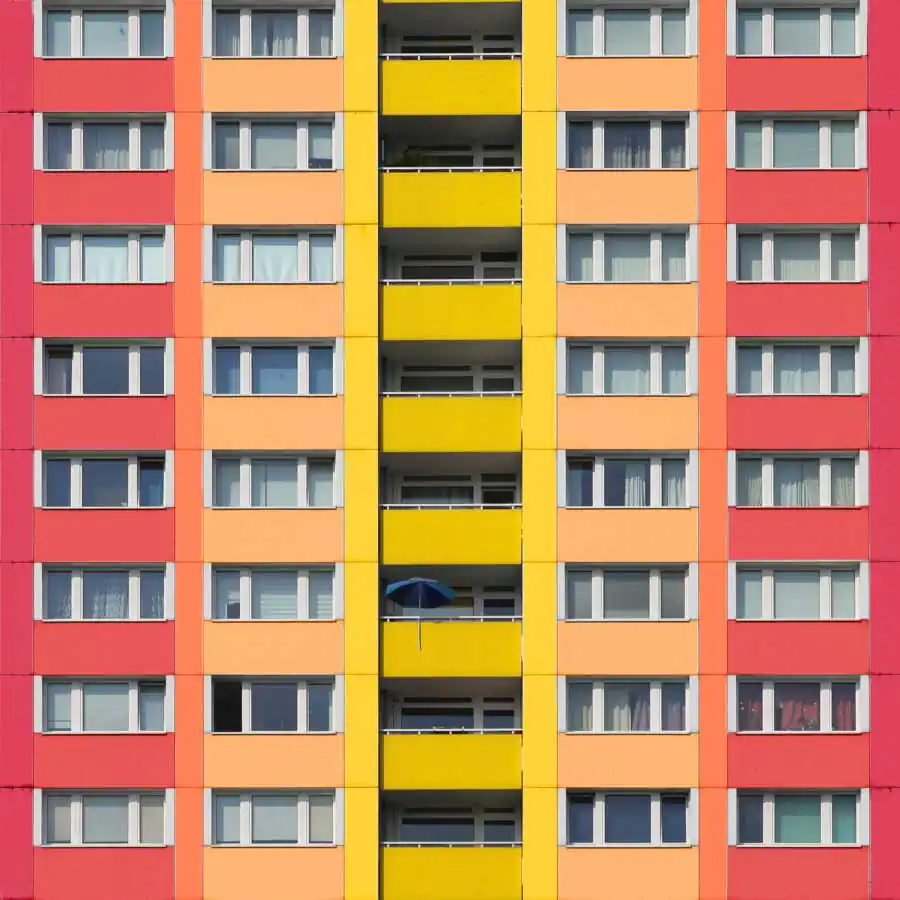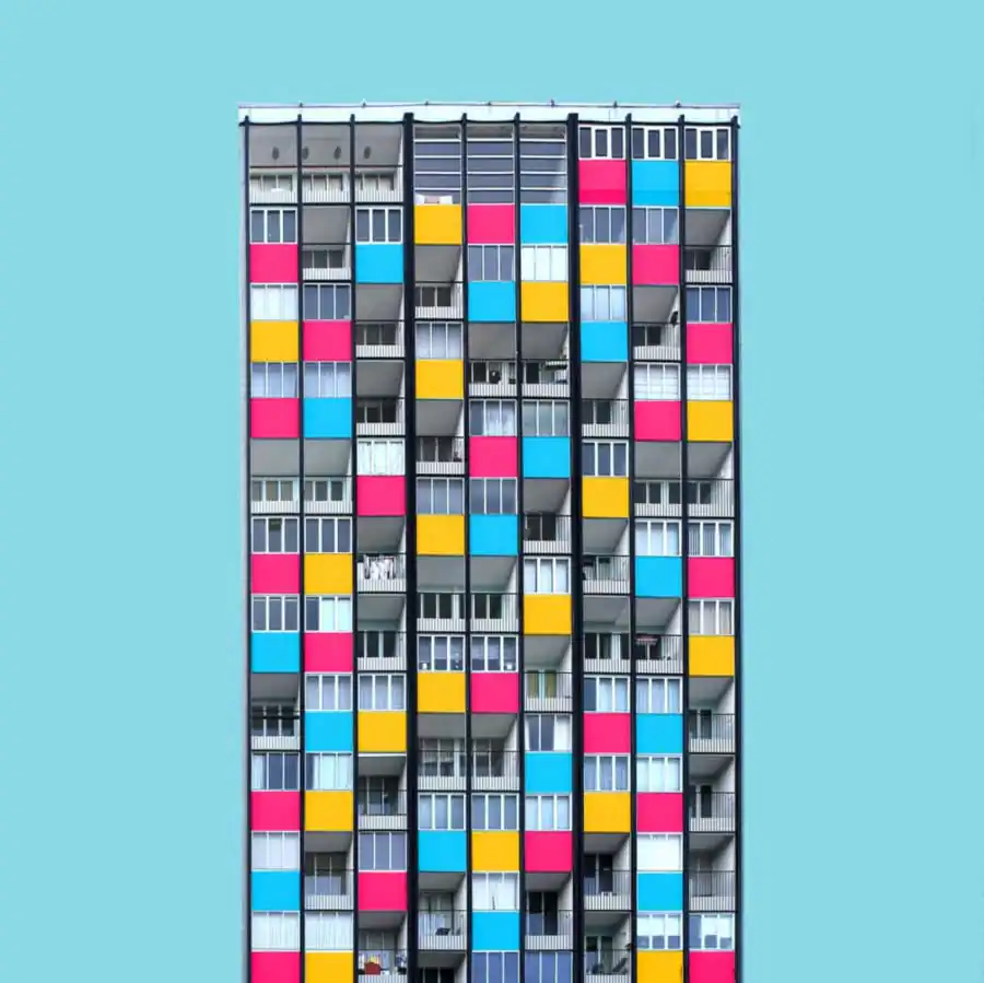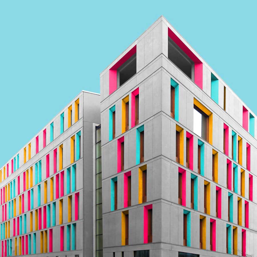 All the images have the same uniform blue background which acts as one of the characteristic elements of the series besides the colors. It focuses the viewers eye on the building itself and gives a good contrast to colored and the white areas of the buildings. When coloring the buildings he orientates on the structure of the buildings facade. For example elements like balconies, windows or other elements of the facade. His color palette includes colors which are rich of contrast to each other or colors which are defining a gradient. He takes the photos mainly with a wide angle lens and applies a perspective correction in the edit. So the vertical lines of the building are vertical in the image. That gives the images a sense of depth but also let the building seem somehow stoic. Then he cutes the buildings literally out of their environment which and adds the blue background. That gives the buildings a minimalistic look and reduces the content of the image in the colored building itself. With that he wants to show that the buildings do not have to be a structure which has to fit in any environment but also a piece of art which can also stand for itself. But in the reality also the buildings which are more interesting in its structure got ingested with their grayness by the boring cityscape. Coloring those buildings shall help the viewer to understand the artistic demanding modern architecture has or should have. Paul Eis understands his project as a critique on the contemporary architecture. Not in the lots of interesting in creative buildings which got developed but more on the often very uniformly luxury housing estates. These buildings mostly are build in a style of “neoclassicism”. And that trend of developing houses in that, for him very boring, style of architecture can be found in whole Germany and also in cities of other countries. For him it’s not understandable why a lot of people are buying those houses for that high prices. But that is probably because many people are not interested in architecture or a interesting cityscape. And even if the representative buildings like museums or universities are getting a more and more individual designs, many people wants to live in uniformly and, even if these are comfortable to live in, very boring houses. Paul Eis wants the people to think more about individual and interesting architecture.