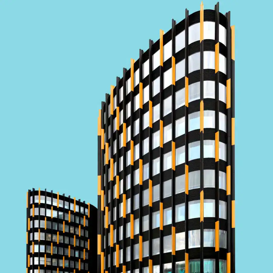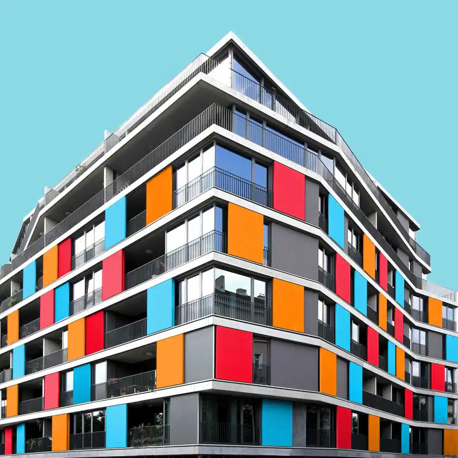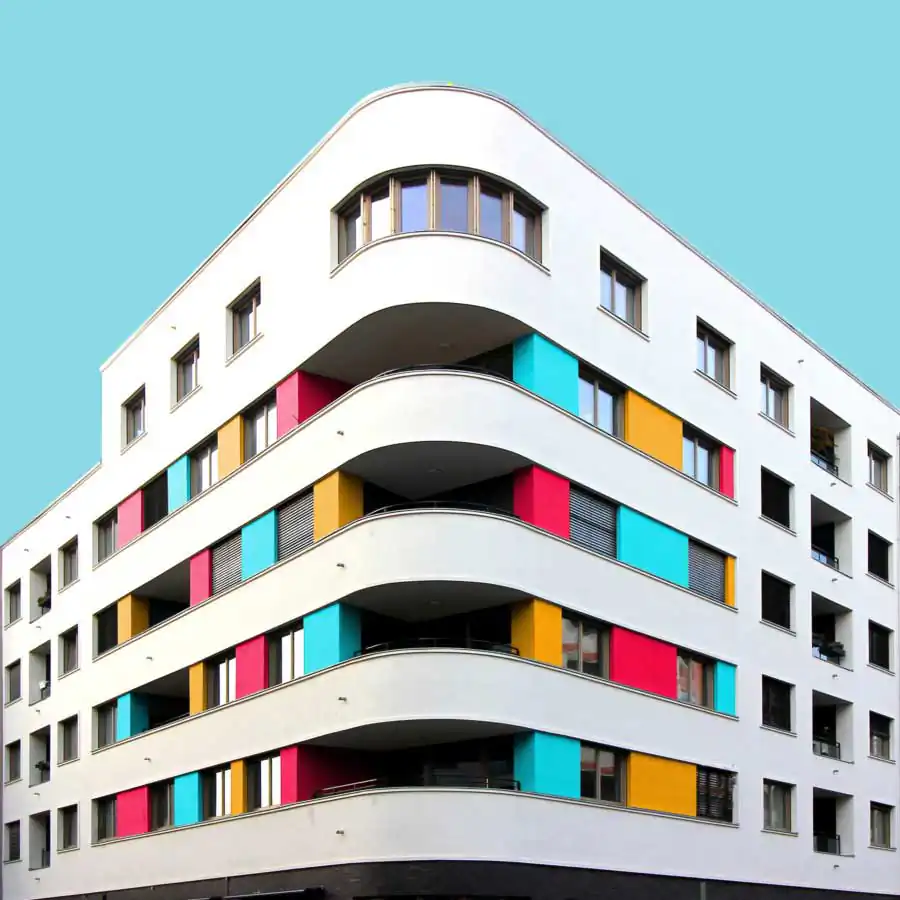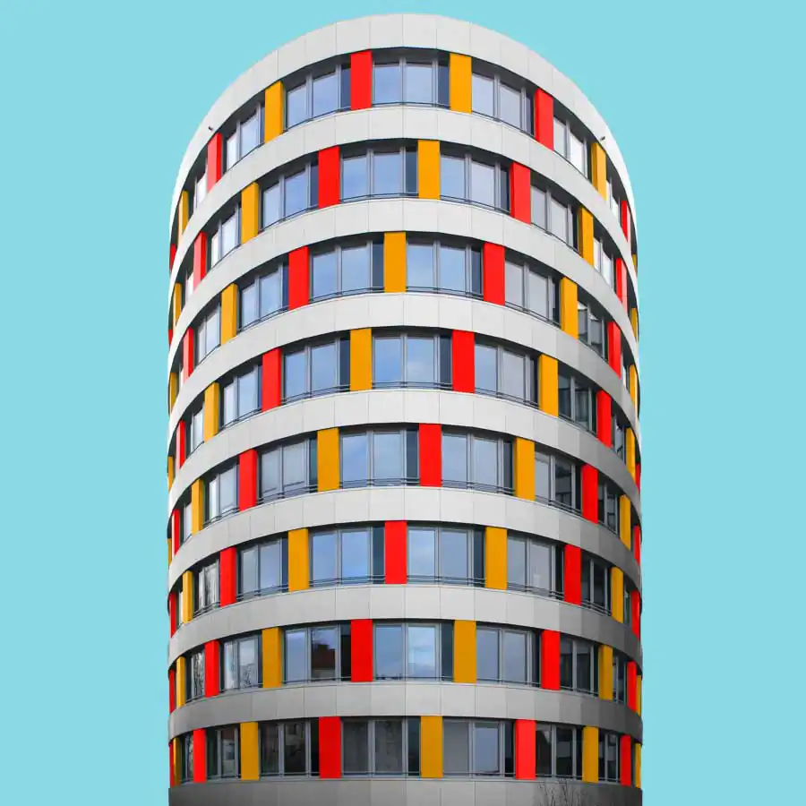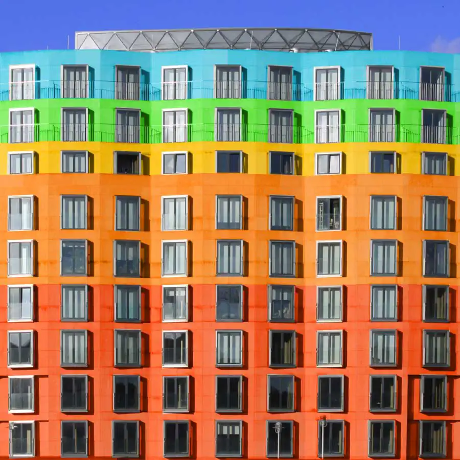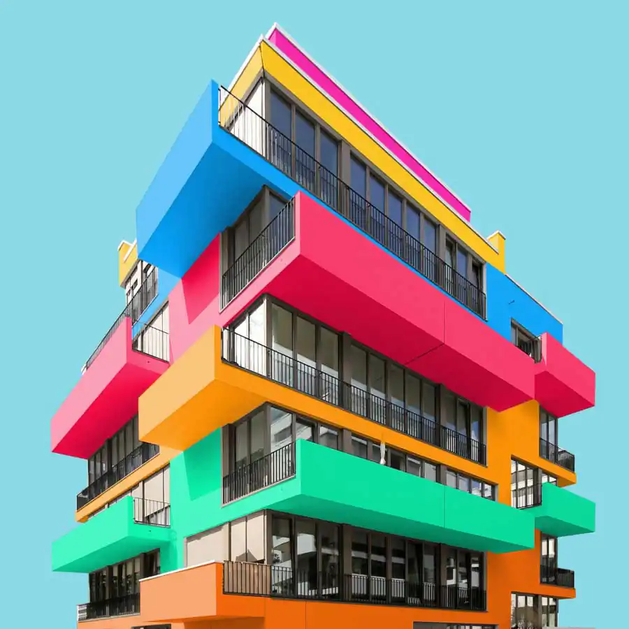 All the images have the same uniform blue background which acts as one of the characteristic elements of the series besides the colors. It focuses the viewers eye on the building itself and gives a good contrast to colored and the white areas of the buildings. When coloring the buildings he orientates on the structure of the buildings facade. For example elements like balconies, windows or other elements of the facade. His color palette includes colors which are rich of contrast to each other or colors which are defining a gradient. He takes the photos mainly with a wide angle lens and applies a perspective correction in the edit. So the vertical lines of the building are vertical in the image. That gives the images a sense of depth but also let the building seem somehow stoic. Then he cutes the buildings literally out of their environment which and adds the blue background. That gives the buildings a minimalistic look and reduces the content of the image in the colored building itself. With that he wants to show that the buildings do not have to be a structure which has to fit in any environment but also a piece of art which can also stand for itself. But in the reality also the buildings which are more interesting in its structure got ingested with their grayness by the boring cityscape. Coloring those buildings shall help the viewer to understand the artistic demanding modern architecture has or should have. Paul Eis understands his project as a critique on the contemporary architecture. Not in the lots of interesting in creative buildings which got developed but more on the often very uniformly luxury housing estates. These buildings mostly are build in a style of “neoclassicism”. And that trend of developing houses in that, for him very boring, style of architecture can be found in whole Germany and also in cities of other countries. For him it’s not understandable why a lot of people are buying those houses for that high prices. But that is probably because many people are not interested in architecture or a interesting cityscape. And even if the representative buildings like museums or universities are getting a more and more individual designs, many people wants to live in uniformly and, even if these are comfortable to live in, very boring houses. Paul Eis wants the people to think more about individual and interesting architecture.