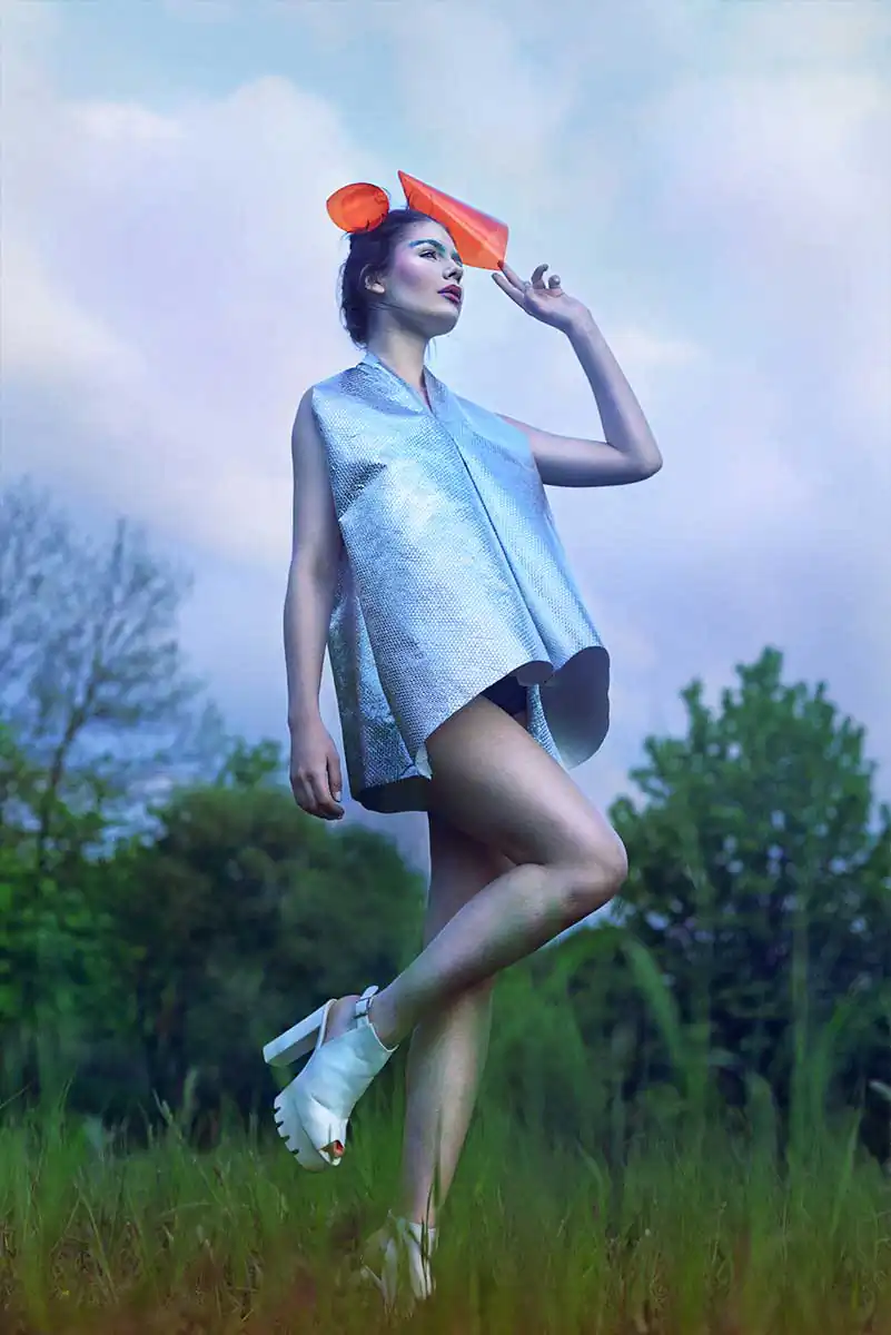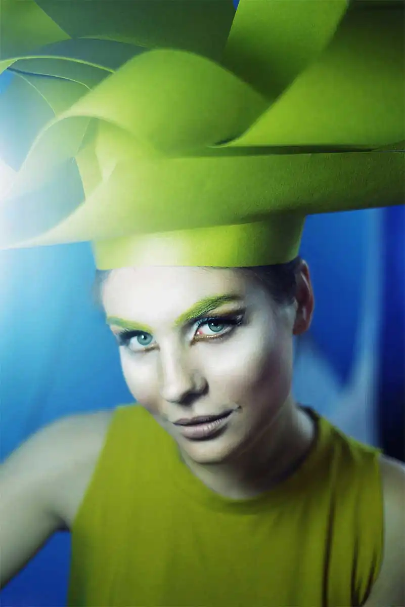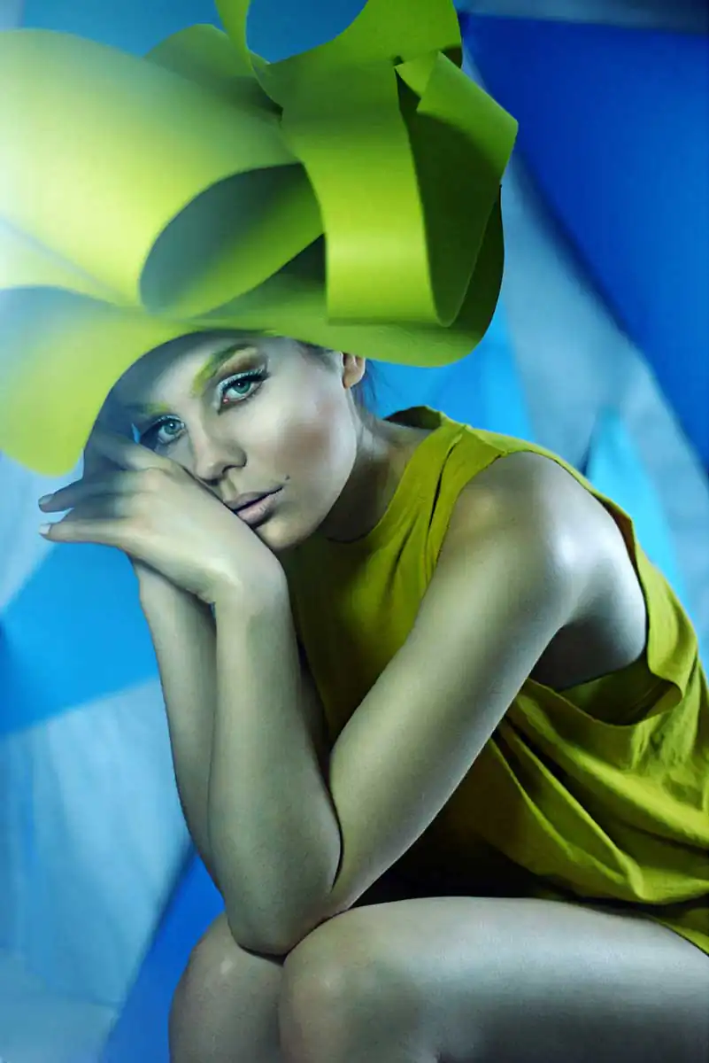on different levels of the picture – their composition and used shapes, colours; Which should affect the viewers mind, without refering to associations with popculture and lifestyle. I created manually headpieces: Yellow and Red one, silver earrings and silver foil costume, and blue background elements in Yellow-Blue part of series.
