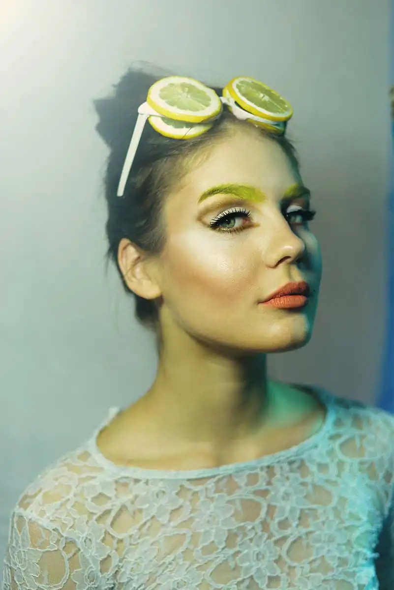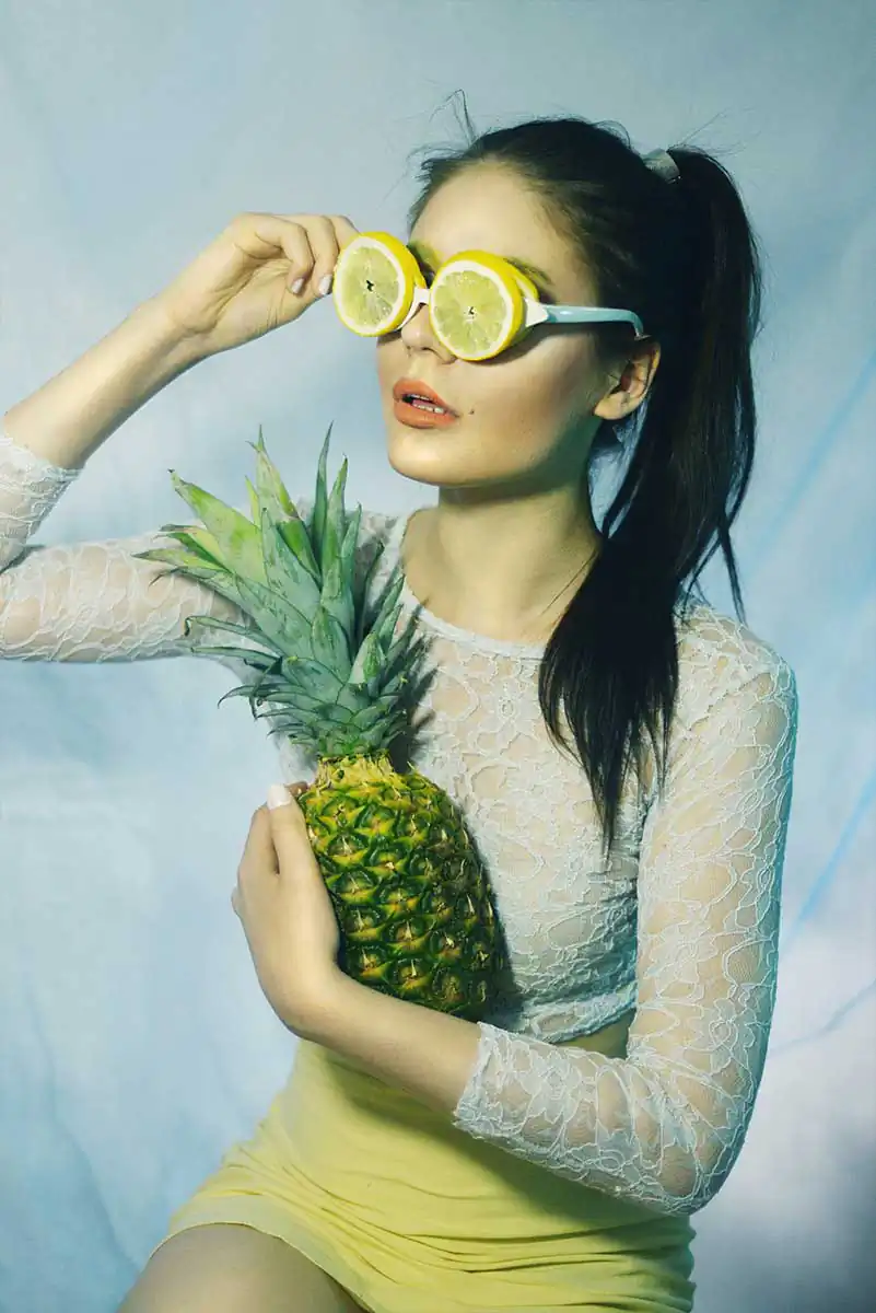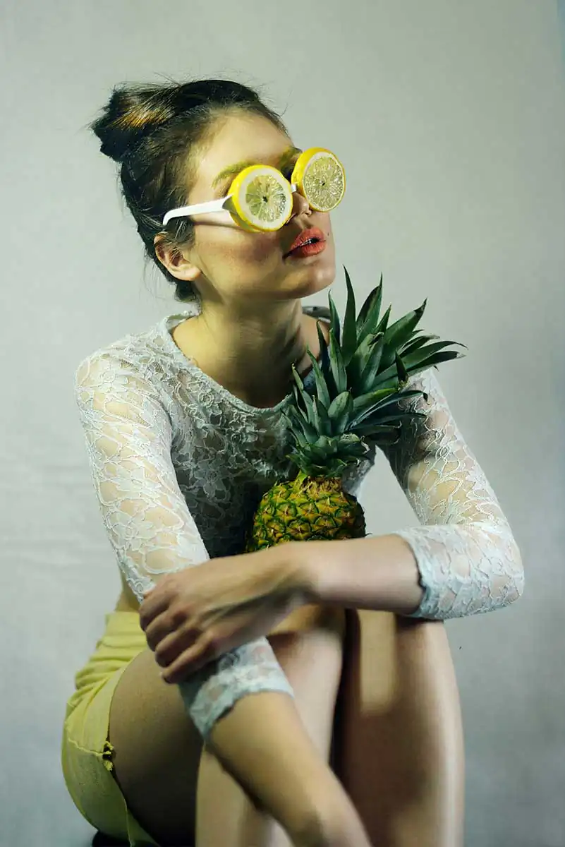 -Second part is basing on pastel bright colours, using elemnts of nature – juicy yellow fruits, which give a nice atmosphere of summer days, holidays, pleasure, warmth. It’s also some kind of play with objects – using lemon slices as an atribute of styling. Model is confident and playful.