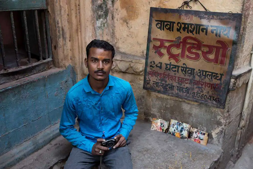 Photographing the dead is his job. Niraja, 20 year old, runs one of the photo-studios in the busiest streets of Varanasi, the oldest living city in the world.