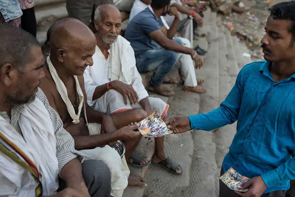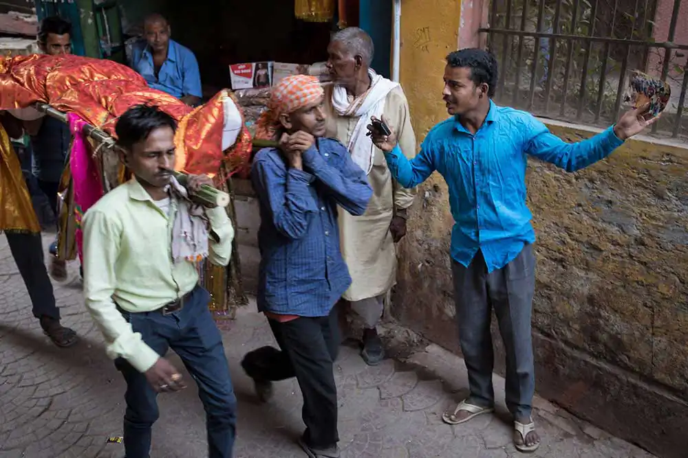 Naraja is one of them for more than five years, a job that has been passed down to him and in his family for generations. He has two cameras, both broken. With one he’s able to get the shots but not to visualize the photos because of the damaged lcd screen. To see the images, then, he needs to transfer the memory card on the other camera that, instead, has a broken lens. Photographing a person on the death bed may seem awkward to most of us, but for the death photographers of Varanasi, it is just another way to earn a livelihood. And if somebody wonders why people would want pictures of the dead body, there are many explanations. Families want them for different needs. For family members who cannot attend and would like to see the final moments and show it to the coming generations. Or to prove that the person is dead for government records and inheritance. At this crematorium, families don’t get death certificates, so the photographs work as a proof. With the date and time printed on the photograph, people use them to claim their share in the deceased’s property.