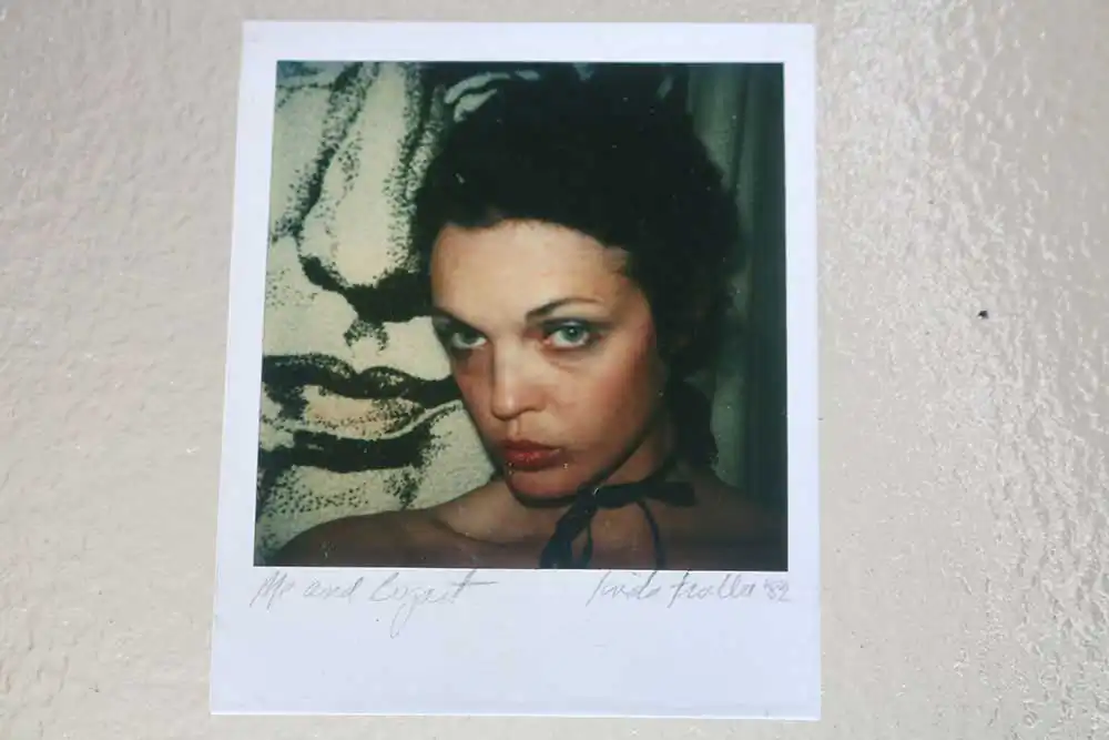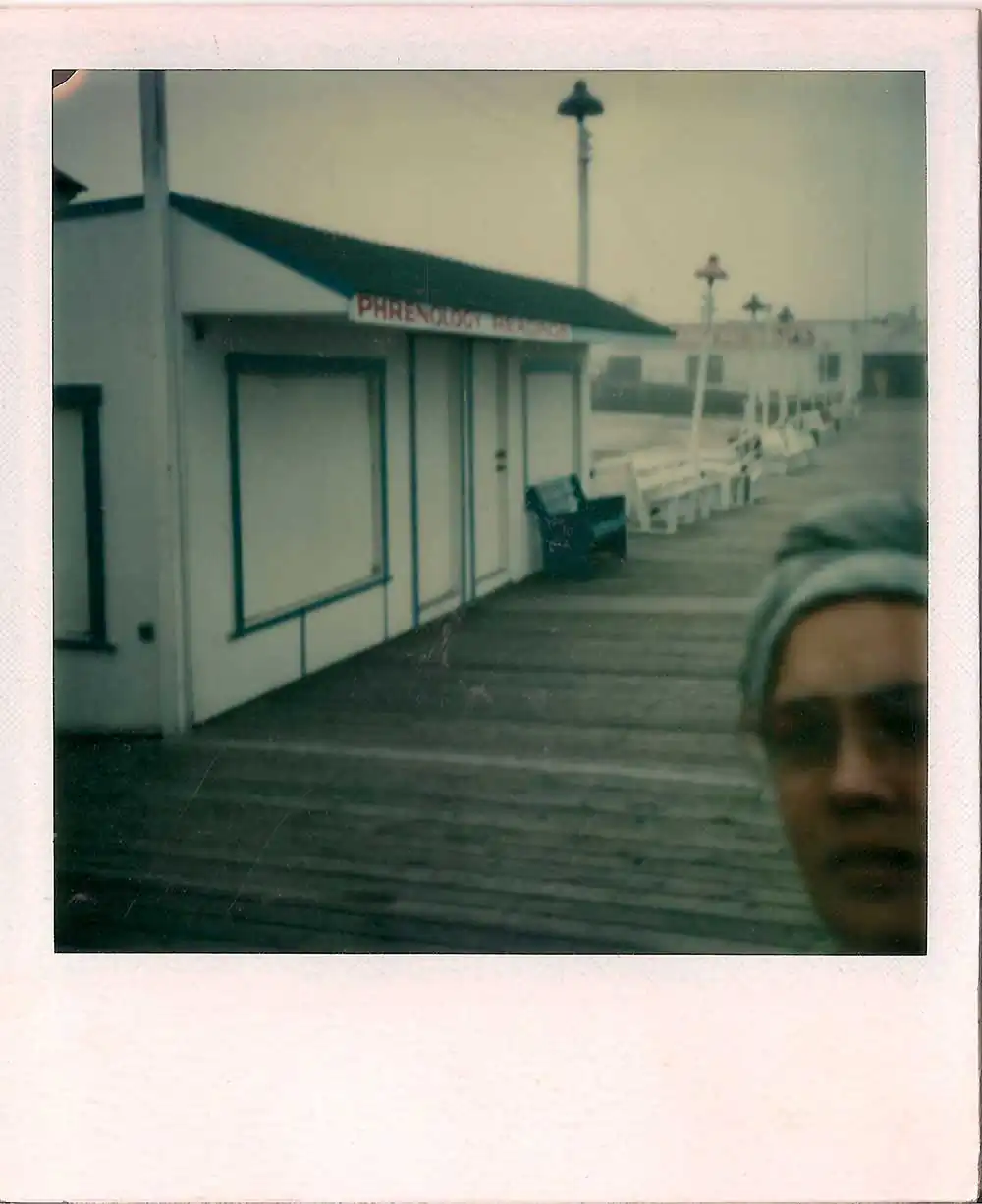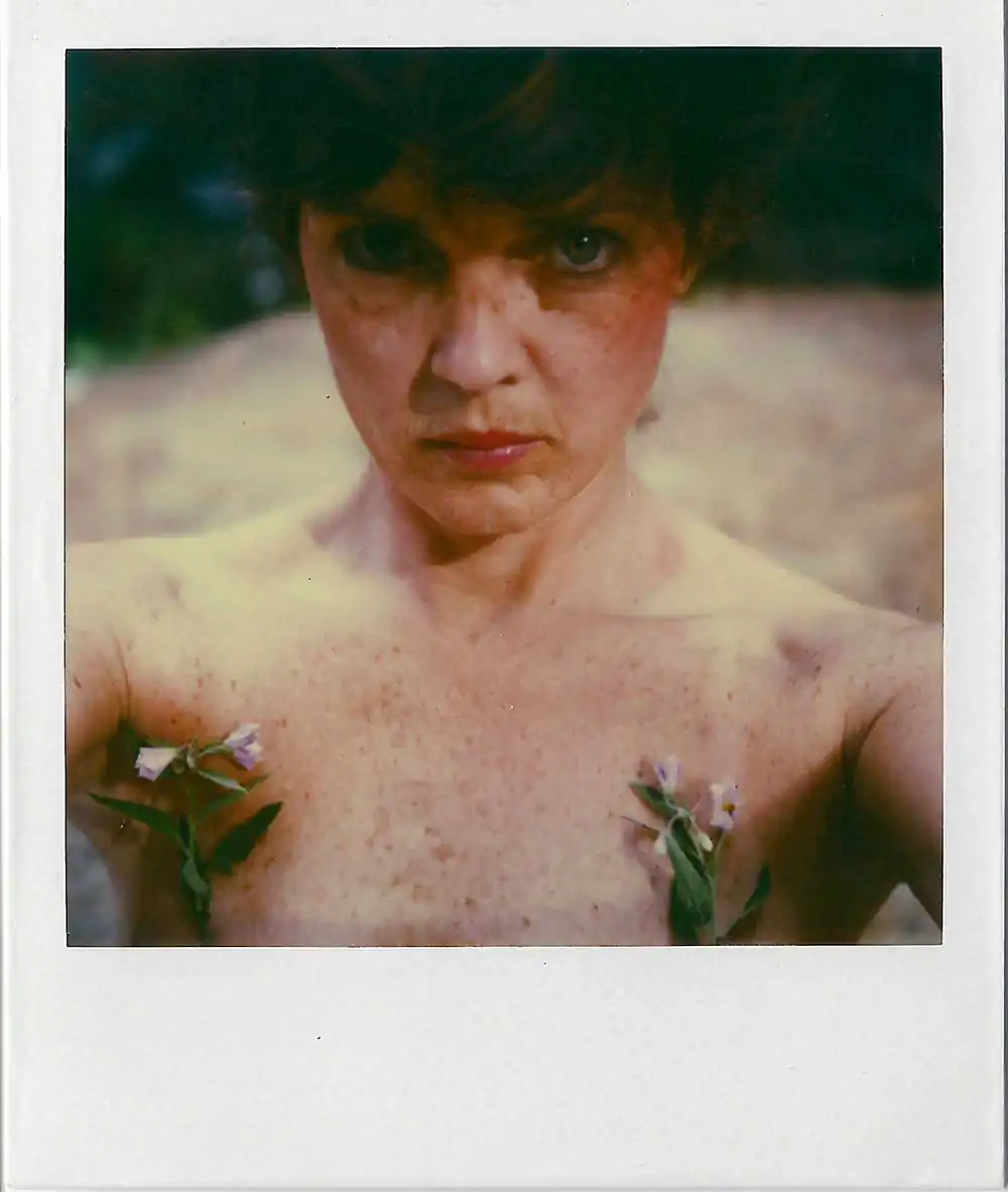 The result was surprising and I reached for my camera and then scratching and remaking my image on the Polaroid’s malleable surface. I wanted to distort my pretty face to find a new self.   This film’s properties let me penetrate it with a match and pen point to further explore interior longings. Seeing the effects such as dents and bubbles, is transforming.  I gained some distance from my visual look that had at one time sustained me.  I gained new control. Living in Hollywood on the same street as the photographer, Robert Frank when he was in town I sometimes imagined his shadow hovering though I never saw him. His road trip images beckoned me to find my own map. I made myself into a woman with an aura over my head, totally removed my face at one point, and crumbled the plastic surface of a self-portrait  expressing the void I was feeling during my divorce. . Experiments with Polaroid offered an imprint, a fissure, and a moment of exchange.