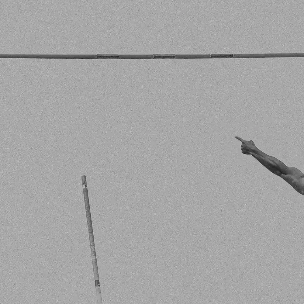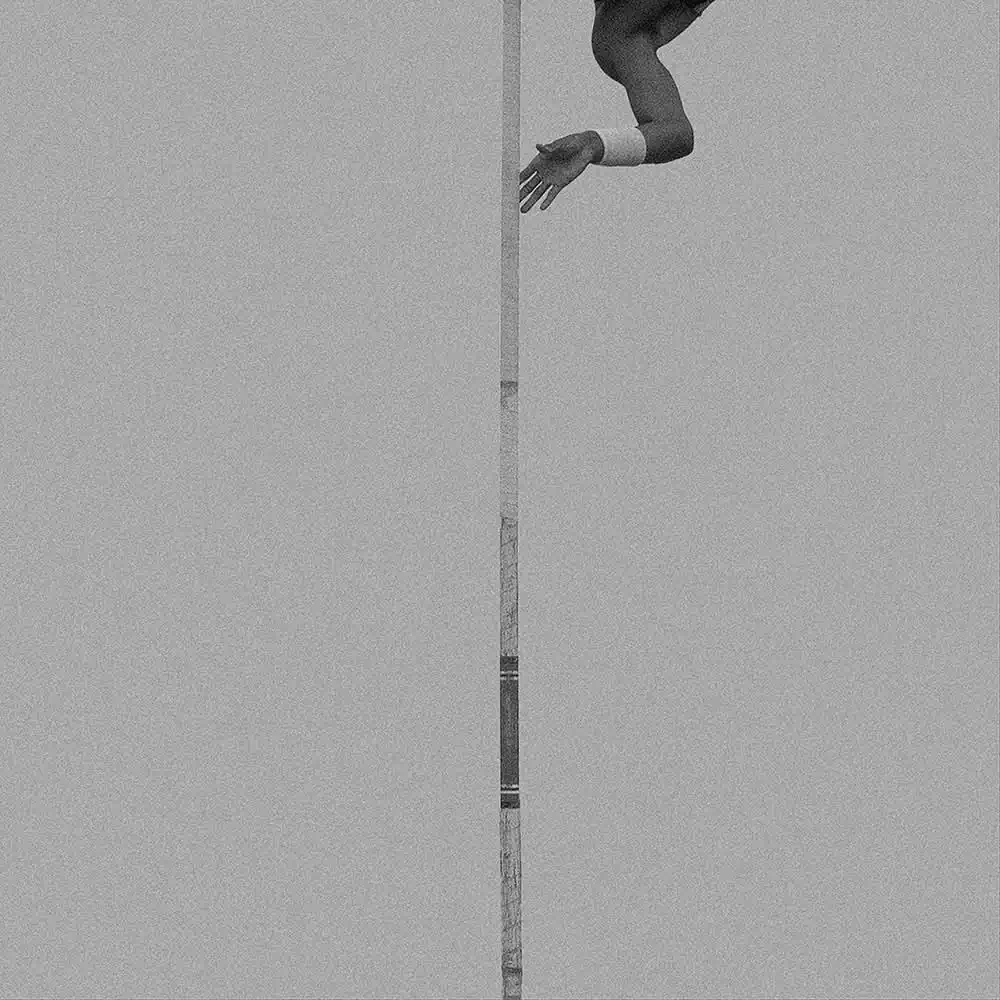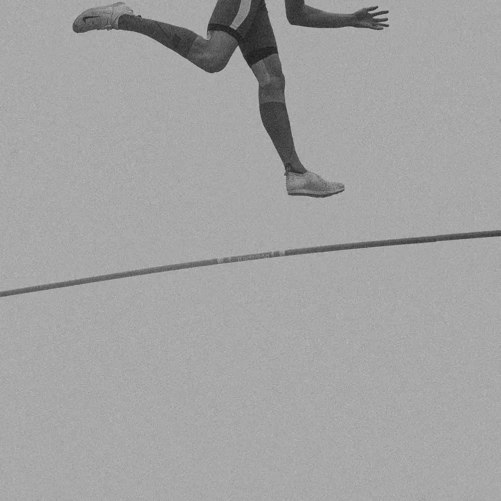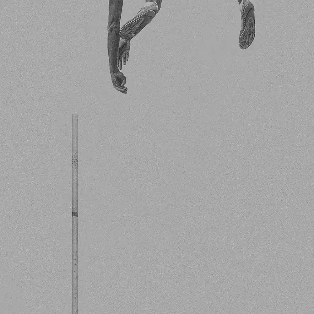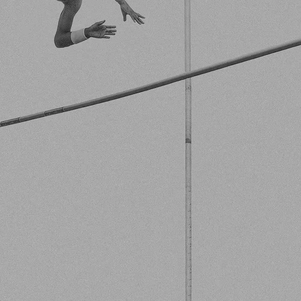 In doing so, he has chosen a very minimalist, artistic composition. His image details of the body and the pole indicate the flight. We see arms, legs, feet, the pole bar, but never do we see a face. The motion of the pole vaulters is captured as their bodies fly through the air, as the athletes stretch and glide, seeming to gracefully defy gravity. Without ever showing a whole body or action, it thus excites the viewer’s imagination. The minimalist presentation is enhanced by the deliberate choice of grainy tones of middle grey.