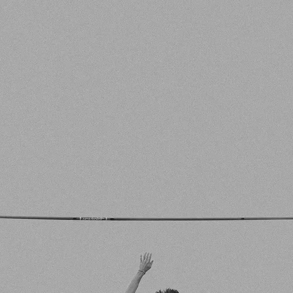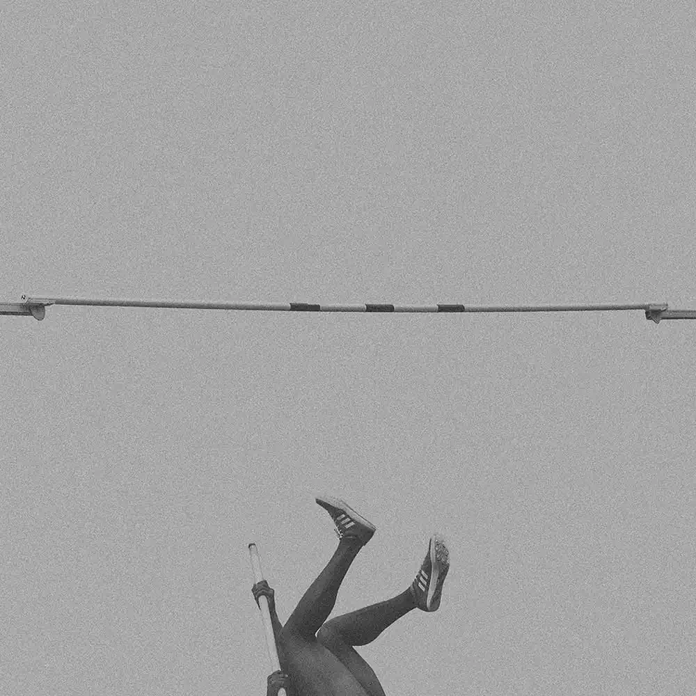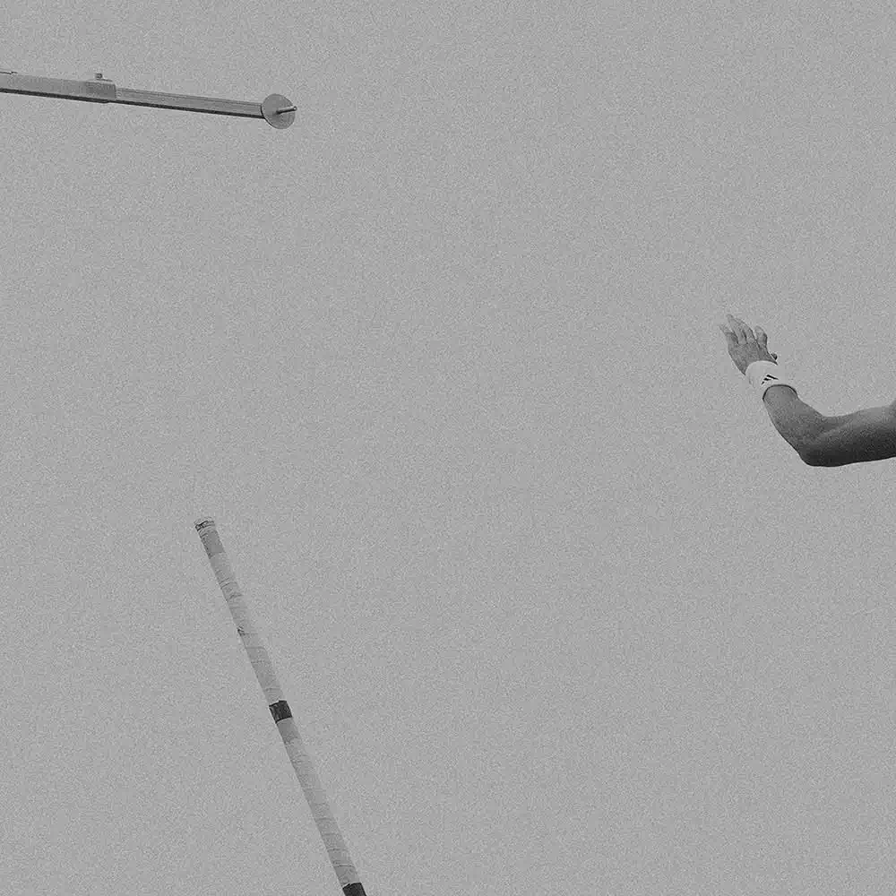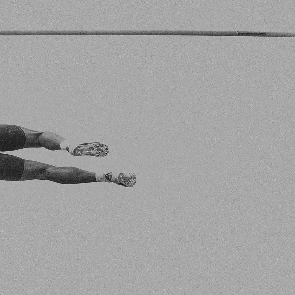 In doing so, he has chosen a very minimalist, artistic composition. His image details of the body and the pole indicate the flight. We see arms, legs, feet, the pole bar, but never do we see a face. The motion of the pole vaulters is captured as their bodies fly through the air, as the athletes stretch and glide, seeming to gracefully defy gravity. Without ever showing a whole body or action, it thus excites the viewer’s imagination. The minimalist presentation is enhanced by the deliberate choice of grainy tones of middle grey.