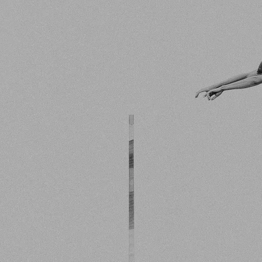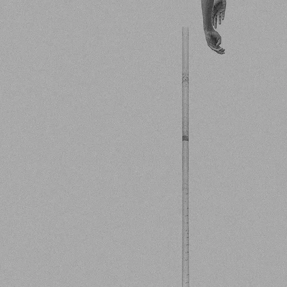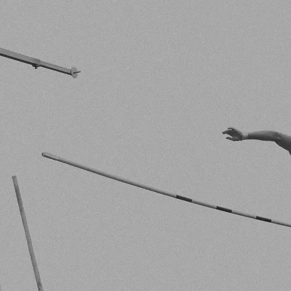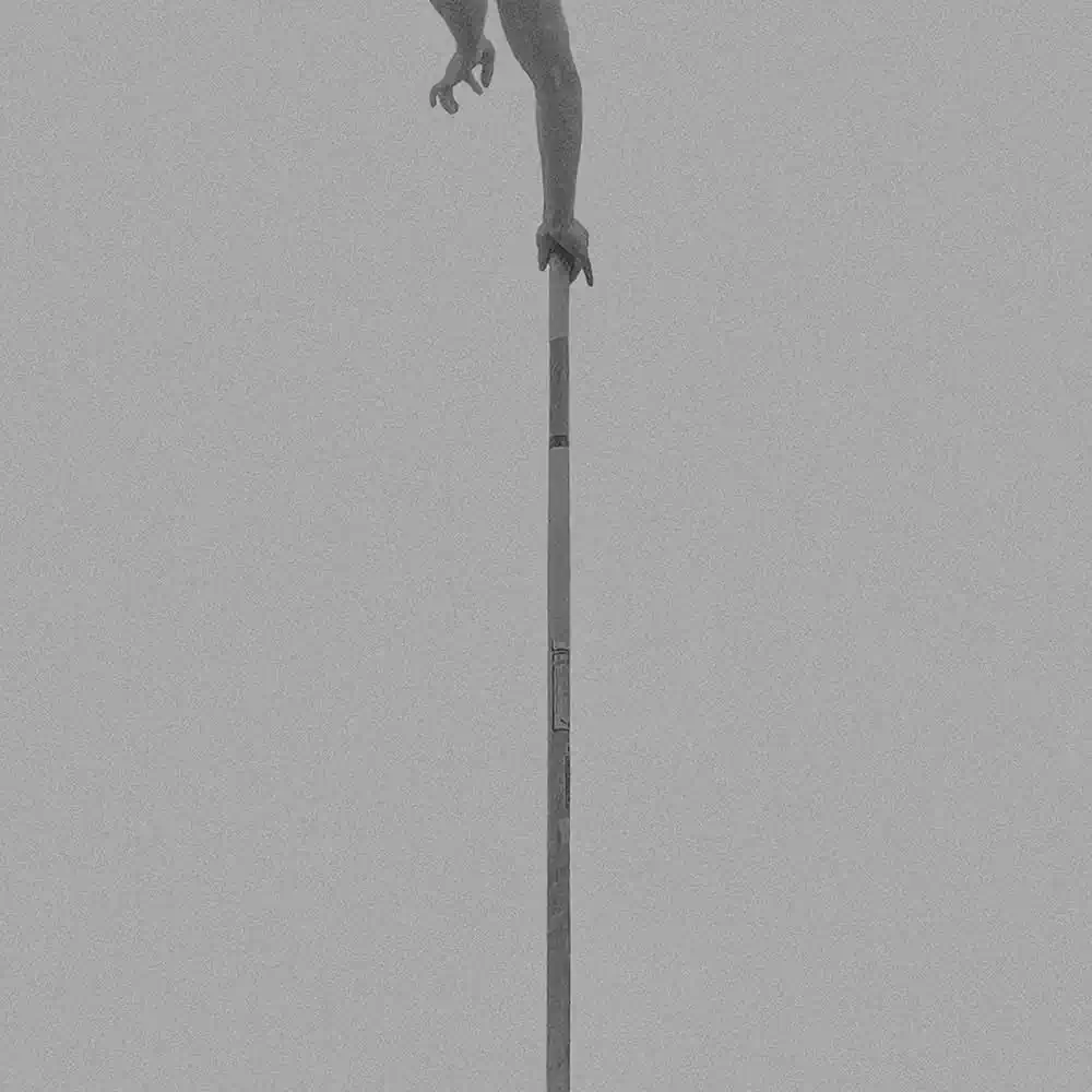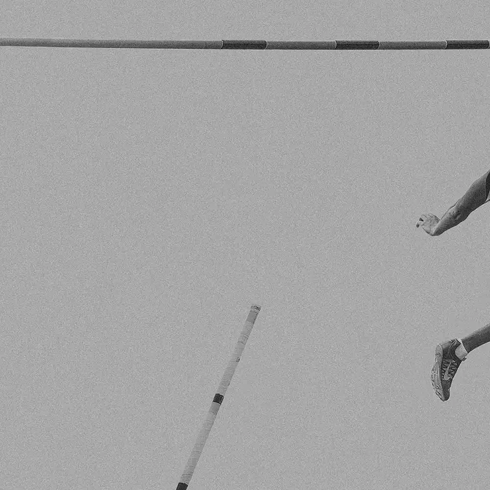 In doing so, he has chosen a very minimalist, artistic composition. His image details of the body and the pole indicate the flight. We see arms, legs, feet, the pole bar, but never do we see a face. The motion of the pole vaulters is captured as their bodies fly through the air, as the athletes stretch and glide, seeming to gracefully defy gravity. Without ever showing a whole body or action, it thus excites the viewer’s imagination. The minimalist presentation is enhanced by the deliberate choice of grainy tones of middle grey.