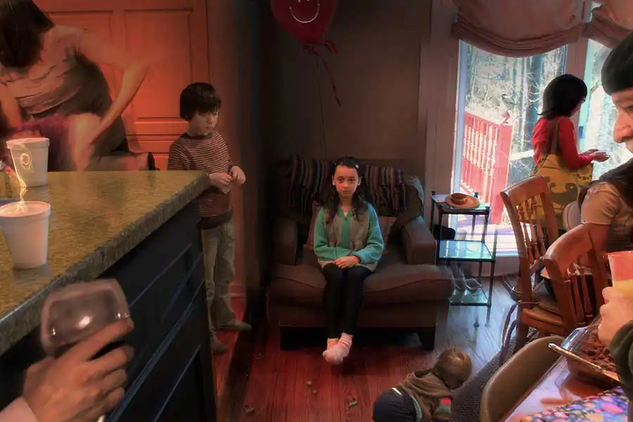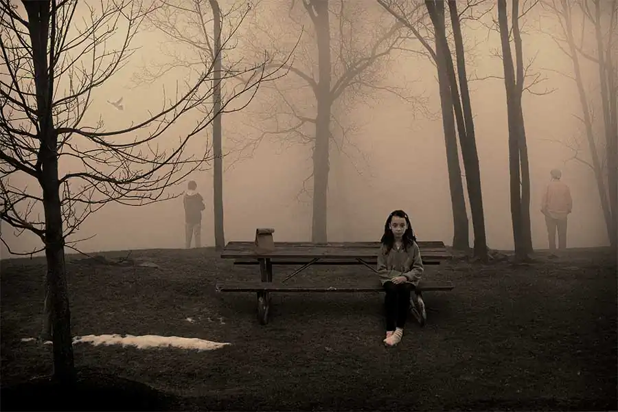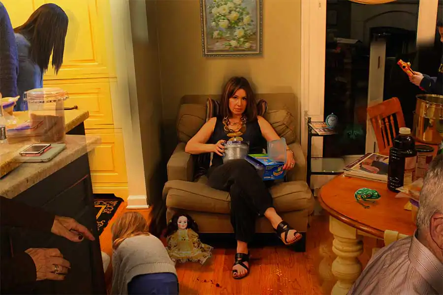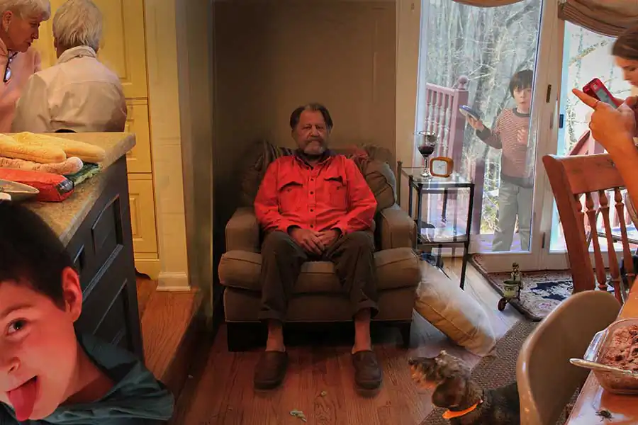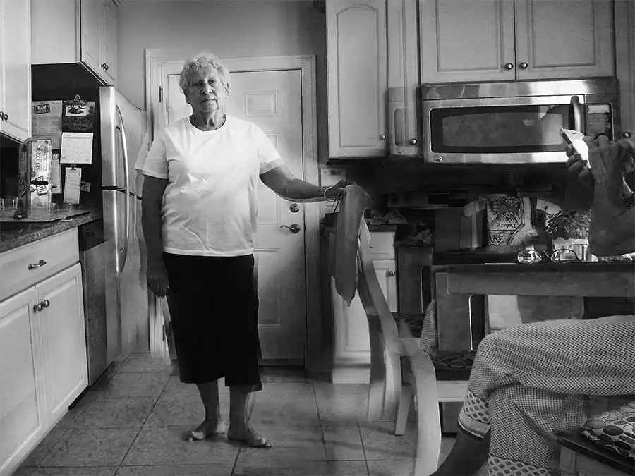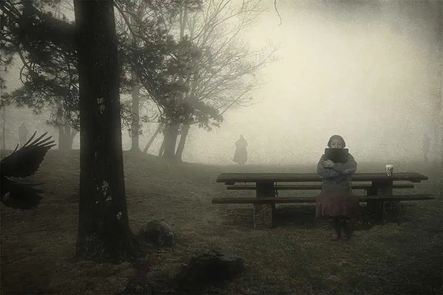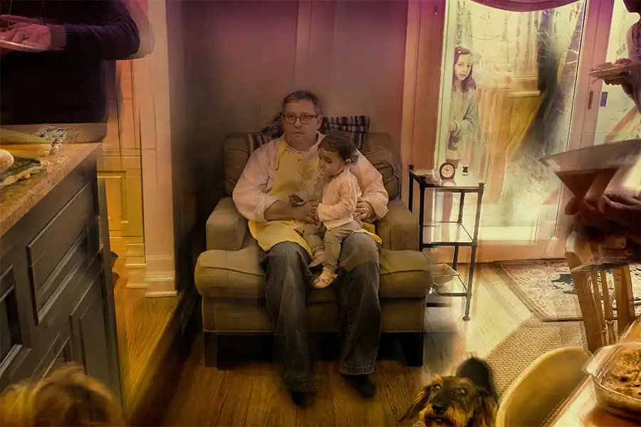 Each portrait in this photographic series—“Portraits”— is a cinematic narrative photomontage, a fictional representation meant to seem like snapshots of “reality.”