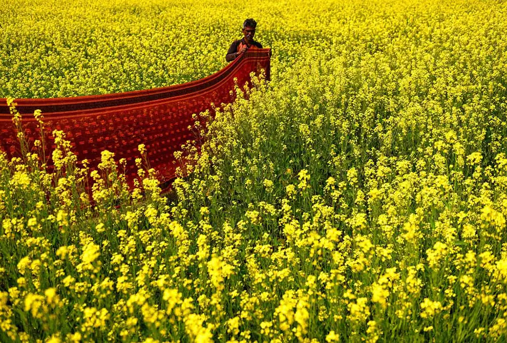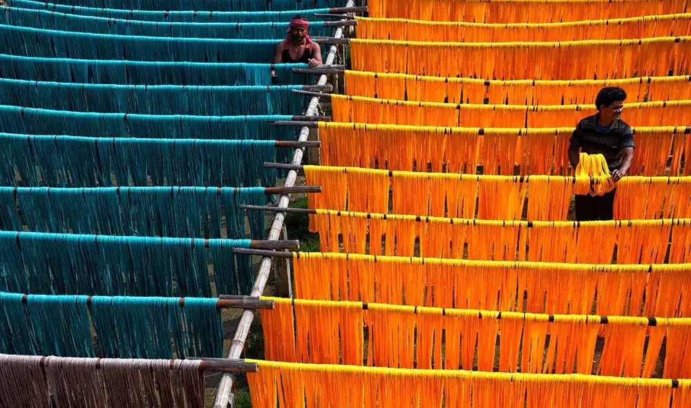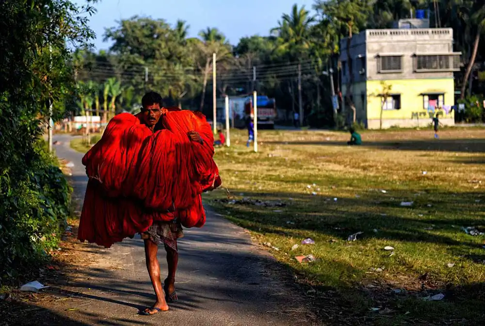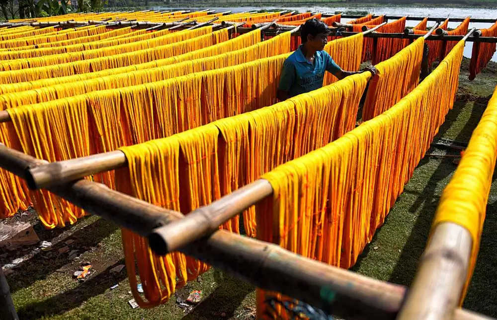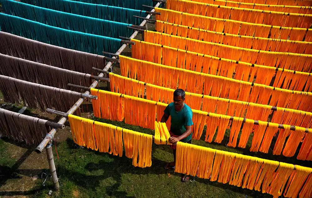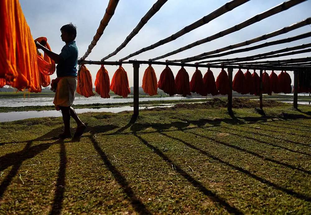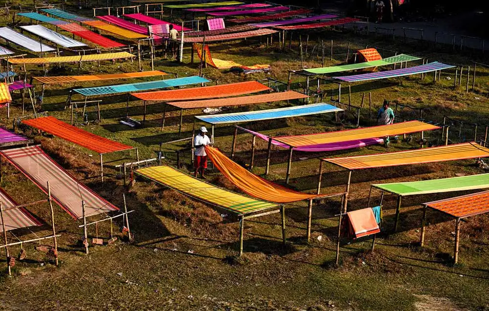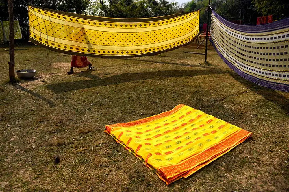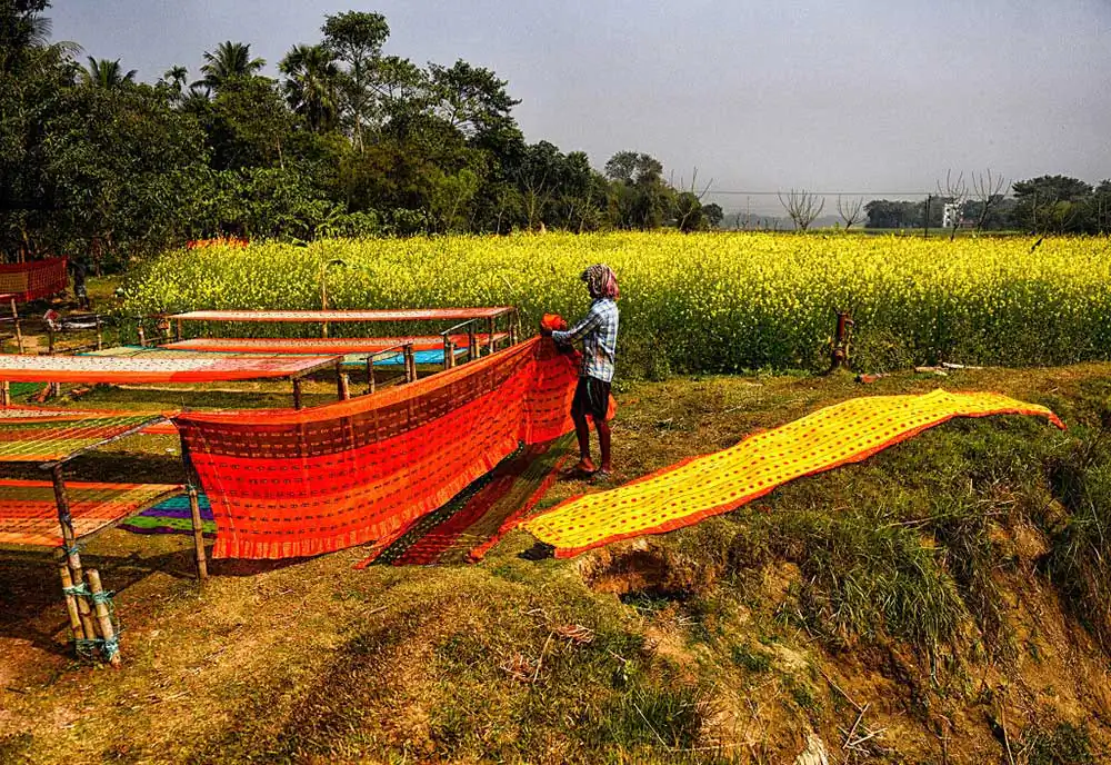 Once the weaving is complete it is again getting dried under Sunlight in an open space where weavers are making final polish to made them ready for the market. The prices of these sarees range between 200 – 2000 ( 3 $ – 30 $ ) to the market depend on the quality , textures and design .Durga Puja is the best time in West bengal when markets are having huge demand of these sarees and the average production time by hand made woven is around 12 to 14 hours means 1 – 2 Saree / day .