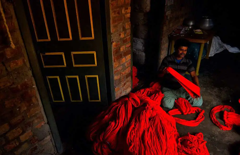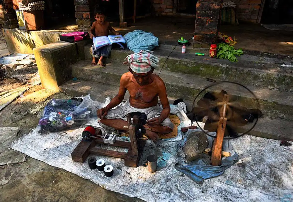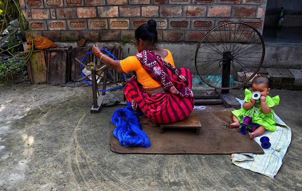 It is said that this culture of hand woven sarees are coninuing from 15th Century and still going on , though due to very low wages and high production cost many of the weavers have switched to machine made Tant , but still almost 5000 + people from these 2 areas are still attached with this profession. During partition of Indian & Bangladesh many of the weavers from Tangail district of Bangladesh are now settled down at Fulia district who are the founder of Dhakai Jamdani which is one of the Classic traditional woman wear during the British period , but after migration with the latest technology and great skills the people from Fuila also made their own creation which is called Fulia Tangail or Bengali Tant Sarees which resembles their past .The process of being made for all these sarees are having many steps , like drying the fibers jute’s in chemical with required color for making the shades and make them proper dry under sunlight for minimum 2 to 3 days . Once this is being done they send the same to different weavers families who basically made the assembling of threads into bobbins from this jute fibers .