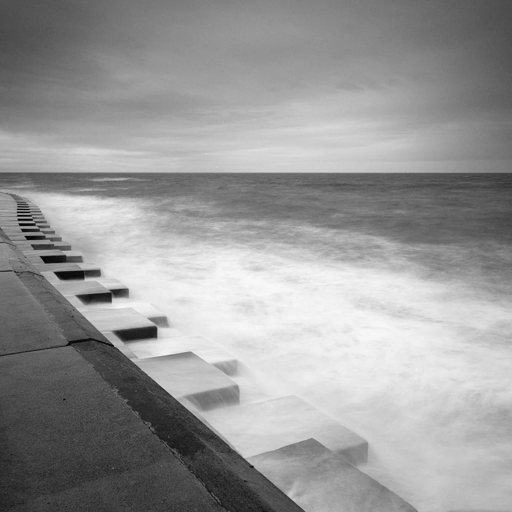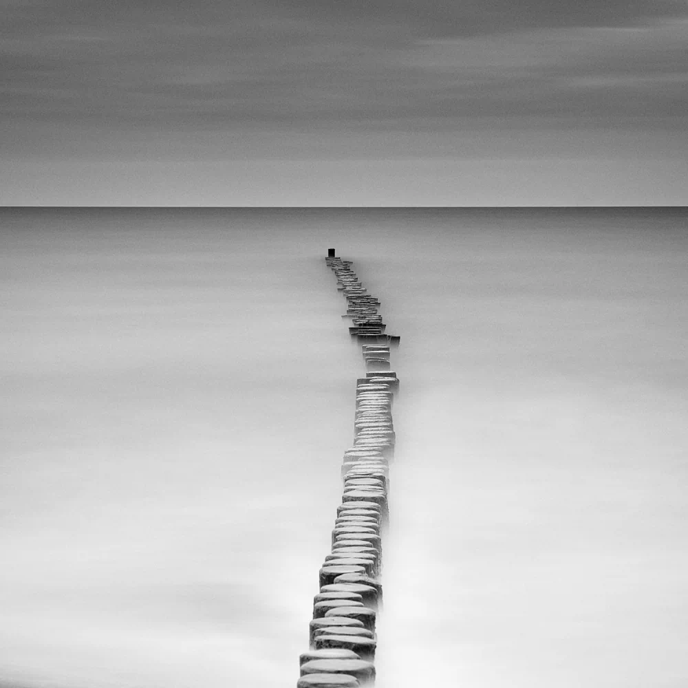 The choice of subjects for the project can best be described by the phrase: “Anything that is lapped by the water.” The spectrum is wide-ranging. Sometimes these are natural elements such as massive rocks standing a hundred metres out in the water, or rugged cliffs against which the surf crashes. Often, however, it is human traces in nature that catch his attention. Piers stretching far out into the sea, or wooden groynes used for coastal protection, provide a strong visual structure.