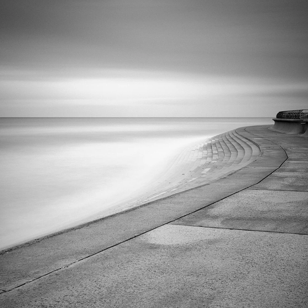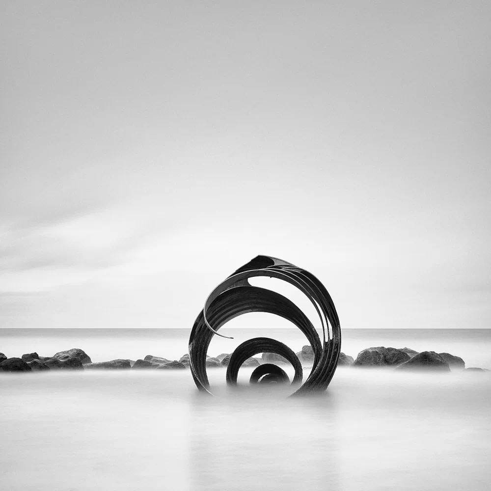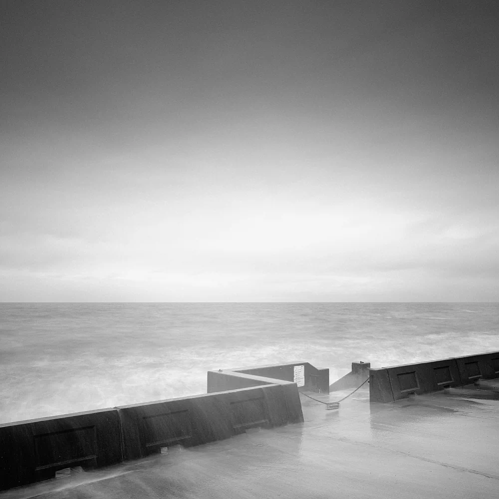 To achieve this reduction technically, he often resorts to long exposures. Time becomes a creative tool. An exposure time of two minutes is almost standard in his working method, as it smooths the water and transforms fleeting movements into an aesthetic surface. However, when the sea is rougher and he does not wish to eliminate the energy of the waves entirely, he shortens the exposure time to a few seconds. This deliberate adjustment helps to authentically capture the true atmosphere of a stormy day without compromising the project’s minimalist character.