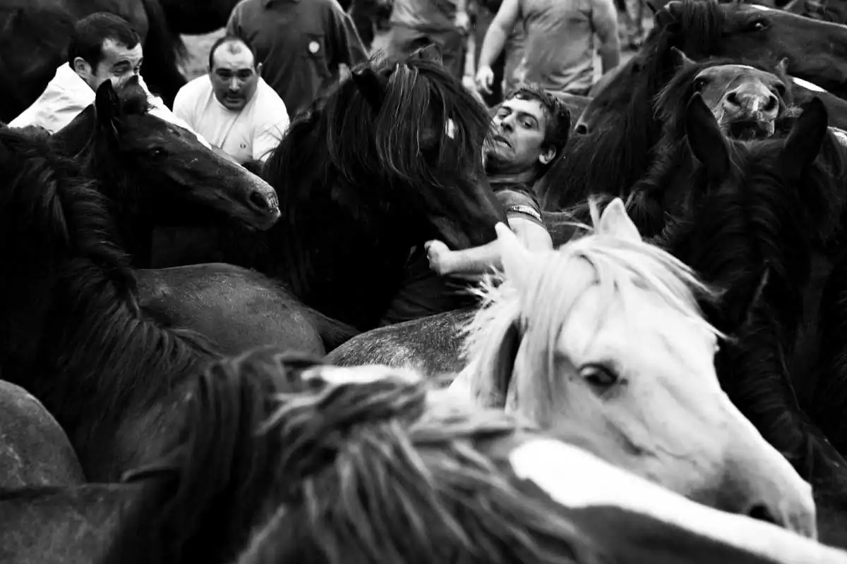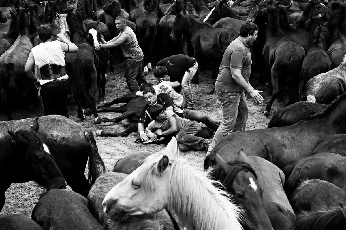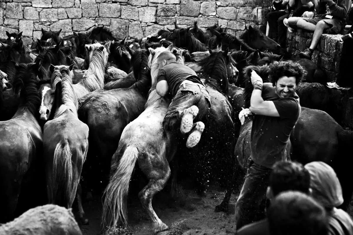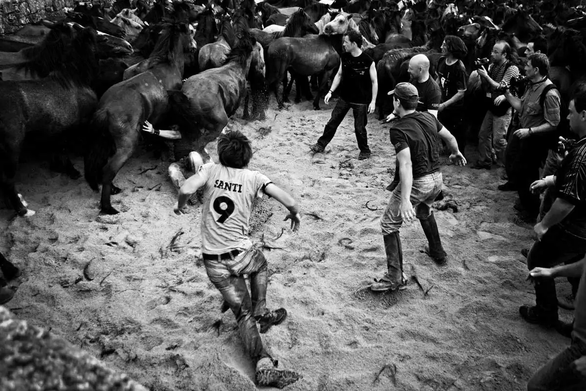 This harmless to the horses fight is barehands and it’s done always with three aloitadores against a horse. It all begins when one of the aloitadores ride the selected horse, then other two take the horse’s head and the third one picks its horse tail so the other two can make the horse fall, where the three aloitadores will held the horse while some other cuts its horsehair. Then, the horse is released and another three aloitadores choose another horse to cut its hair. At the end of the day, the horse are released free back to the mountains where they belong. These shots were taken on one of the oldest documented rapas in Sabucedo (A Coruña, Spain).