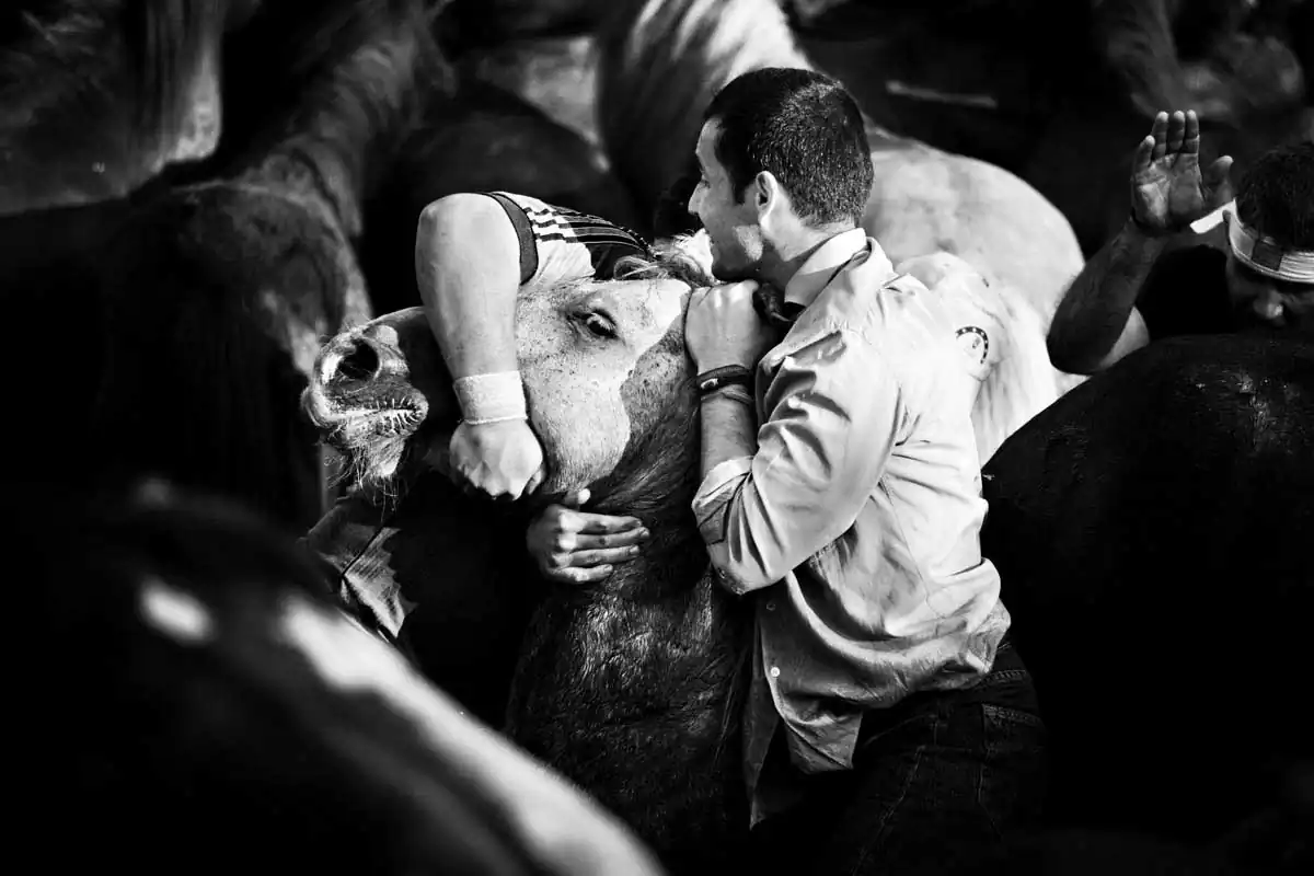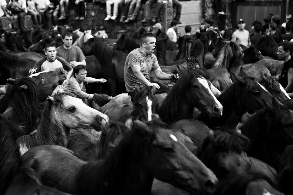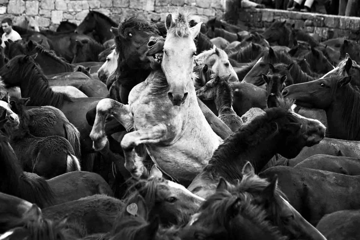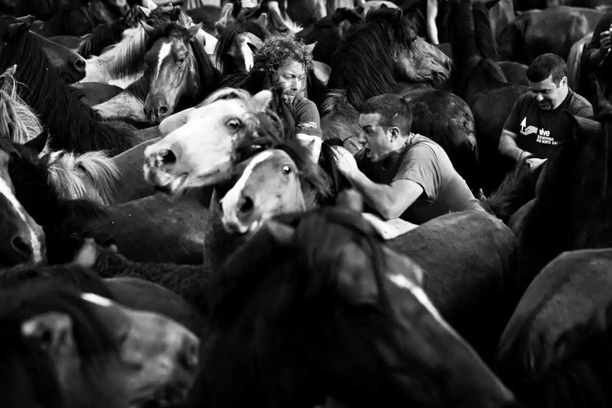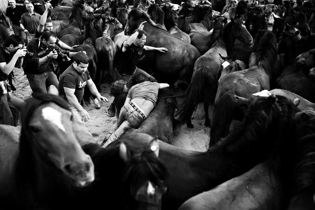 This harmless to the horses fight is barehands and it’s done always with three aloitadores against a horse. It all begins when one of the aloitadores ride the selected horse, then other two take the horse’s head and the third one picks its horse tail so the other two can make the horse fall, where the three aloitadores will held the horse while some other cuts its horsehair. Then, the horse is released and another three aloitadores choose another horse to cut its hair. At the end of the day, the horse are released free back to the mountains where they belong. These shots were taken on one of the oldest documented rapas in Sabucedo (A Coruña, Spain).