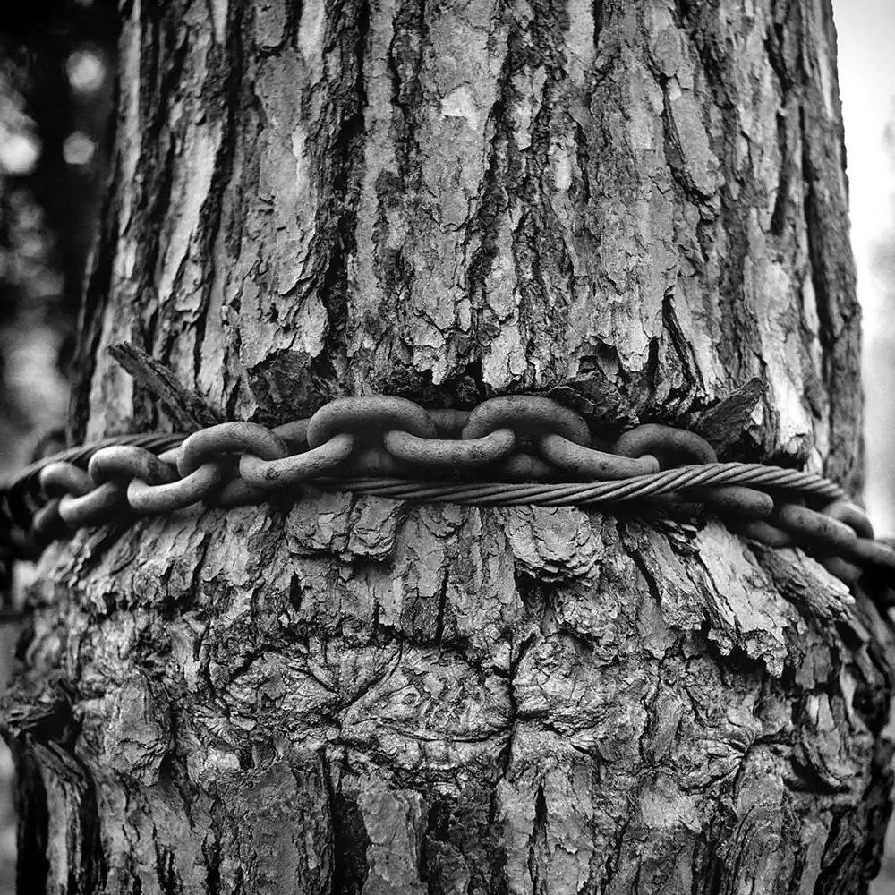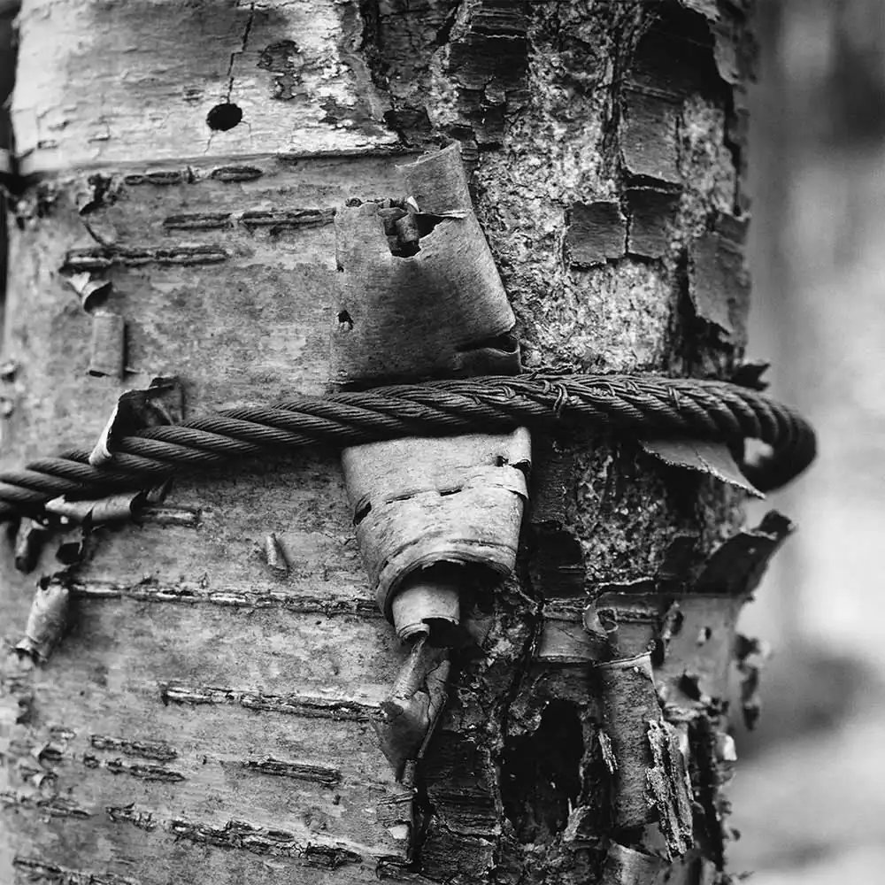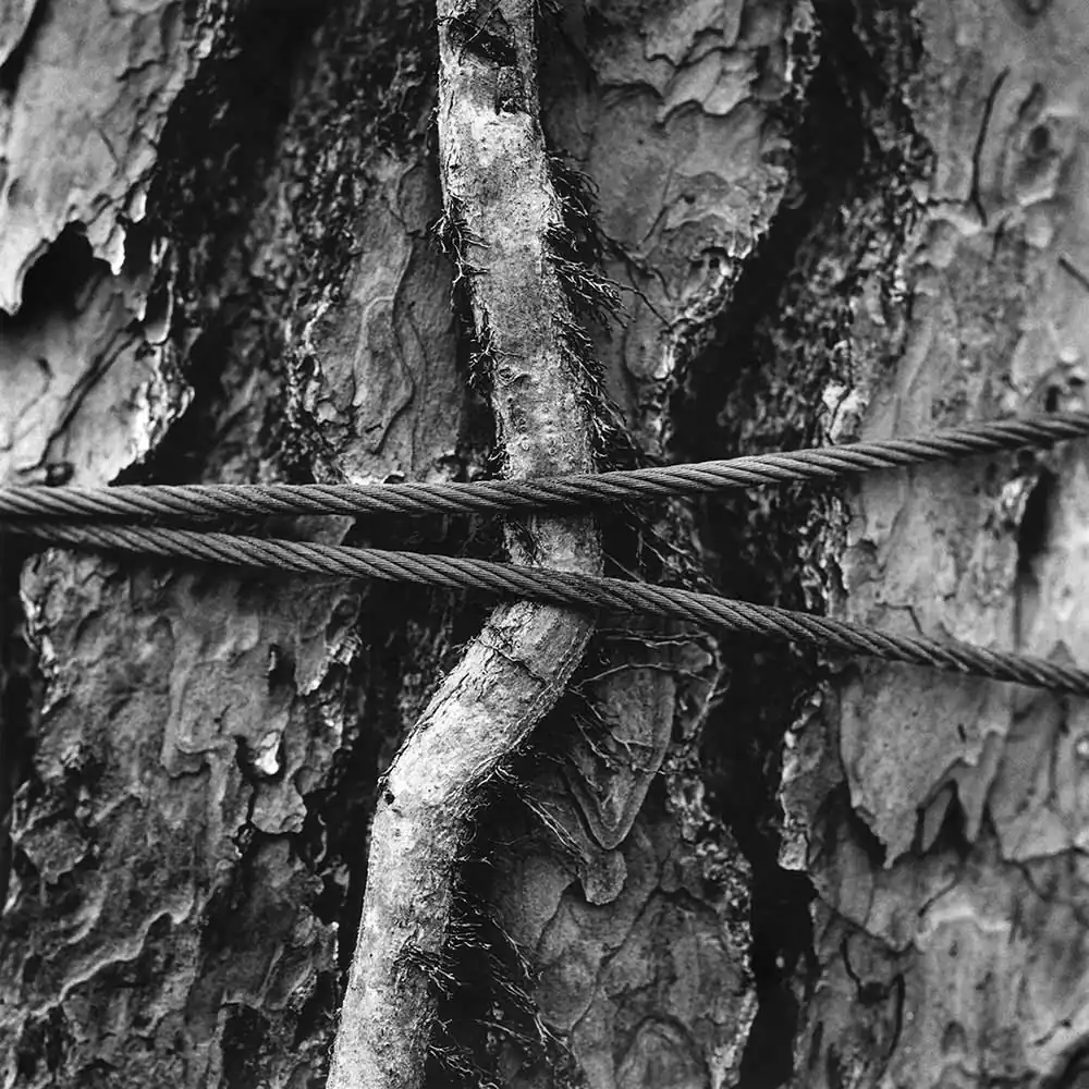 Over time, as these trees continue to grow with these constricting bands of material, the dialectical tension between man and nature builds to a particular emotional pitch. As the wires, cables, and chains cut into the trunks of the trees (a process literally called ‘strangulation’), the organic vegetal response seems to embody human, visceral feelings of pain, emotional constriction, and dogged survival.
