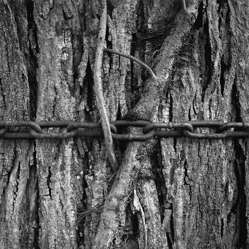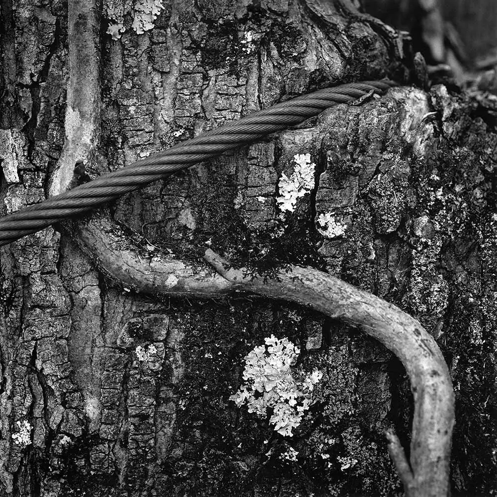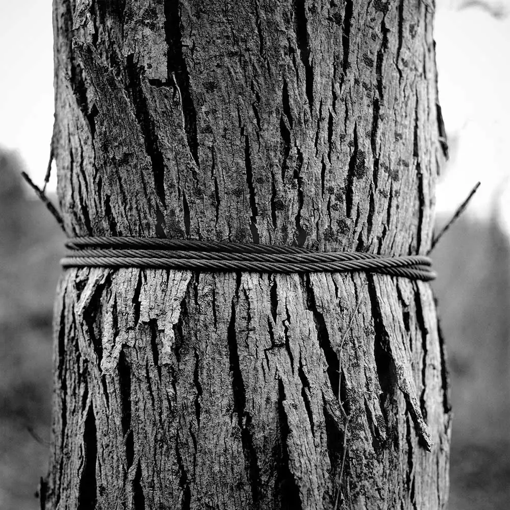 Used to restrict access to the landowner’s property, this series of photographs focuses on trees that have been used as supports for a variety of chains, cables, or sections of fencing.