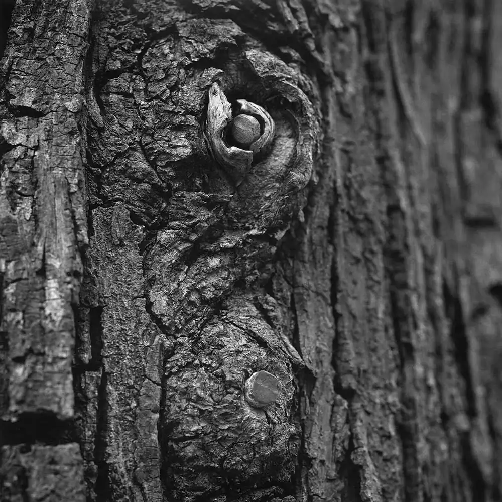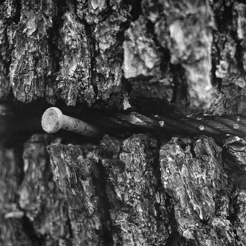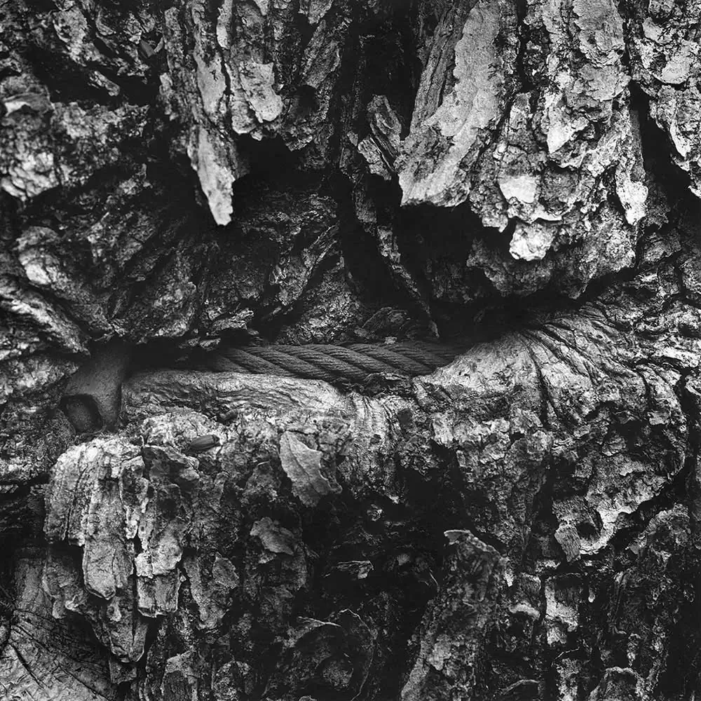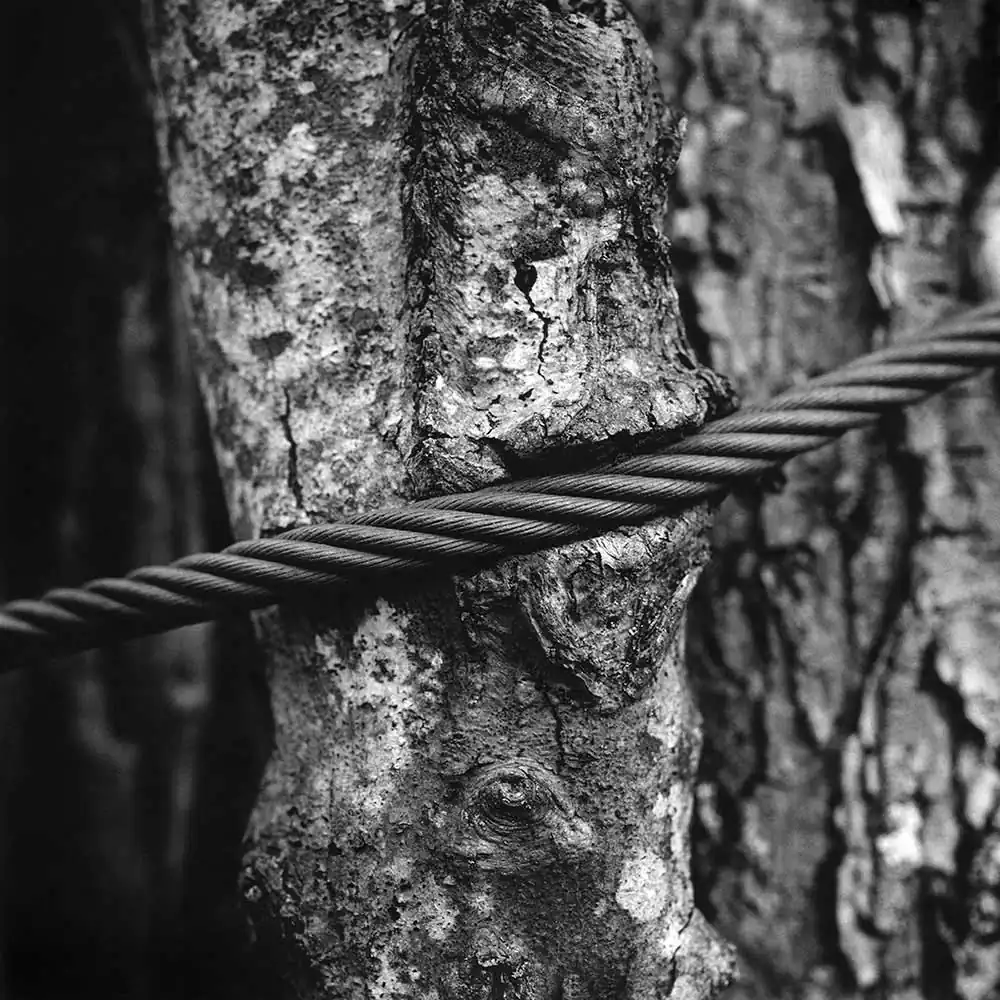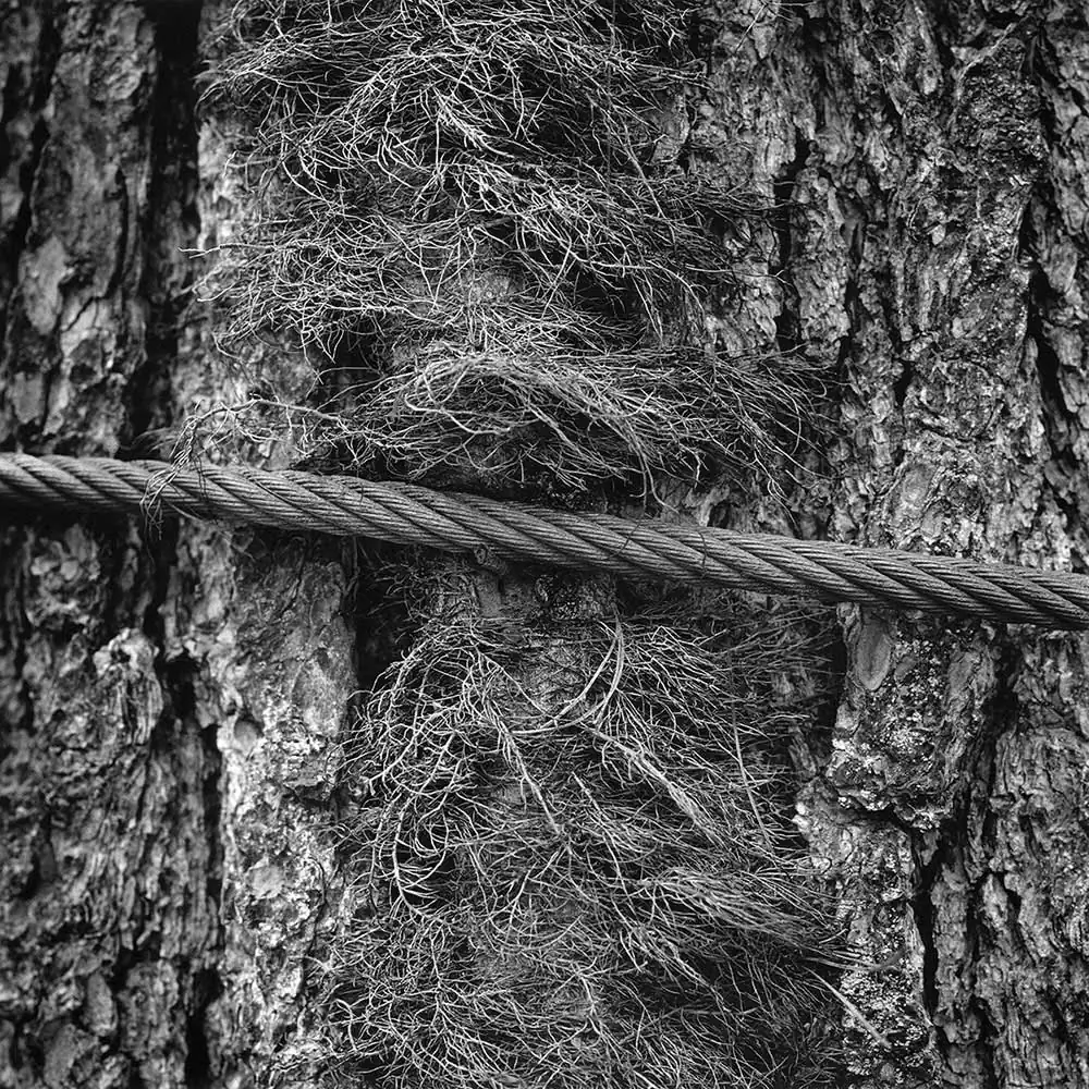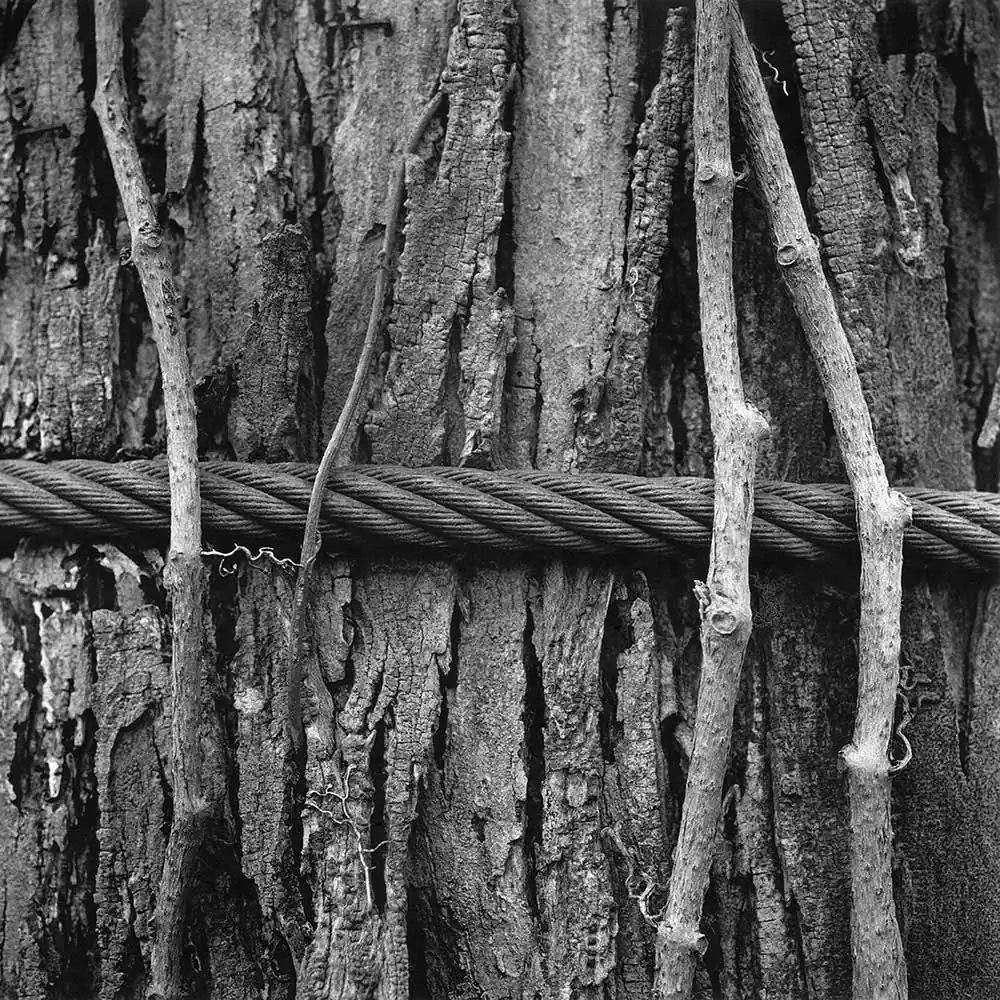 Before setting out to photograph this series of trees with the constricting cables and chains wrapped around them, I had pre-envisioned the printed images to be presented in a grid format rather than side-by-side in a single line. The tightly spaced, stacked grouping would be symbolic of the intense anxiety relentlessly preoccupying my mind.