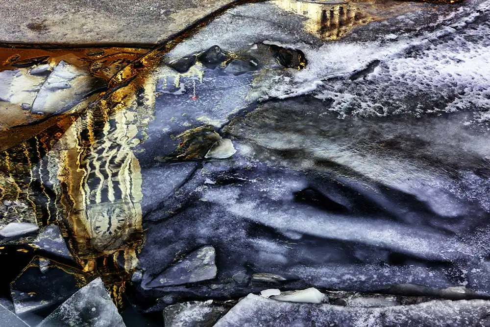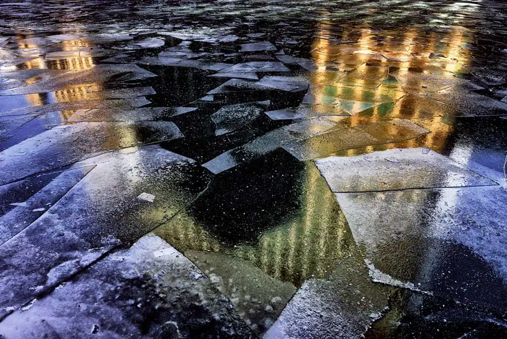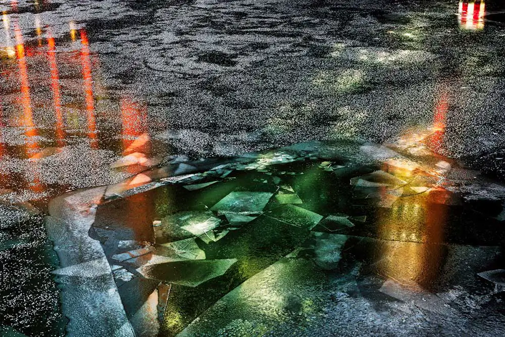 Each year I look forward to this transformation of the Chicago River. It does not freeze often, and when it does, it does not remain frozen for long. Usually just a few days before the water warms by one or two degrees and the ice melts. While it lasts, the floating ice is always in motion, and the compositions formed by its broken sheets and irregular polygons are forever changing. The appearance of the textured surface also changes with the light as clouds come and go and, as the day progresses, the color palette varies from fiery-heat to frigid-cold. I could spend the whole day photographing the varying colors and abstract forms of the frozen river. In fact, I have spent much of several winter days doing just that, giving up only when the cold has penetrated too far into flesh and bone.