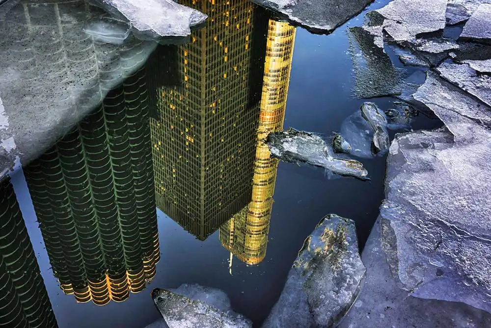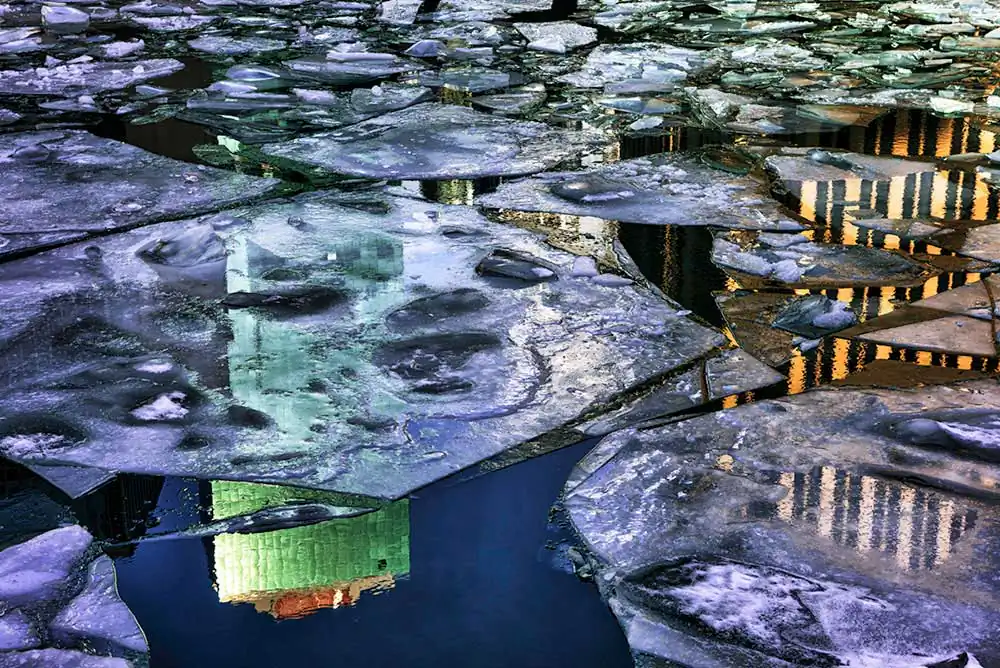 Deep in the winter, after the water has lost its summer heat, the river that flows through the center of Chicago freezes. Not the whole river, just the top layer which becomes decorated with broken ice.