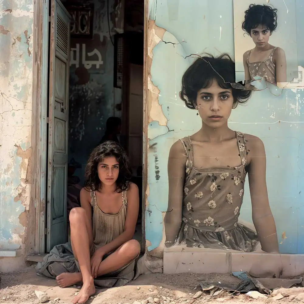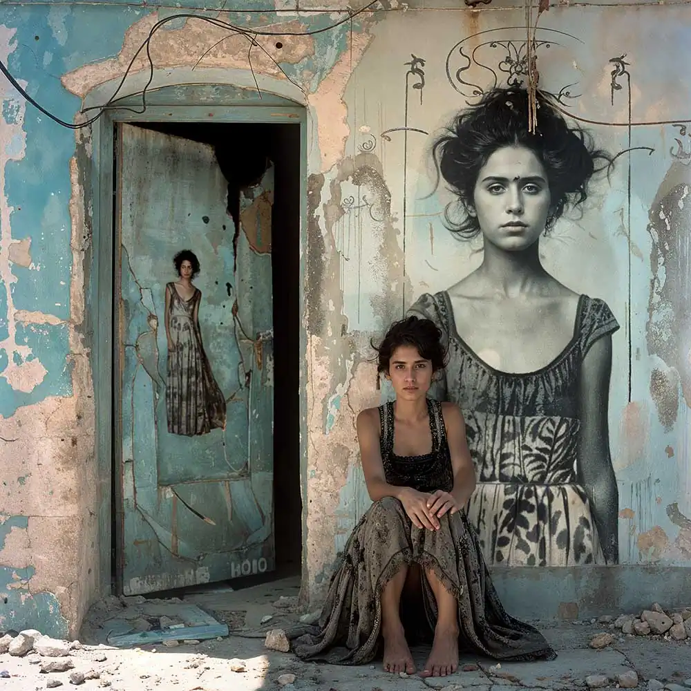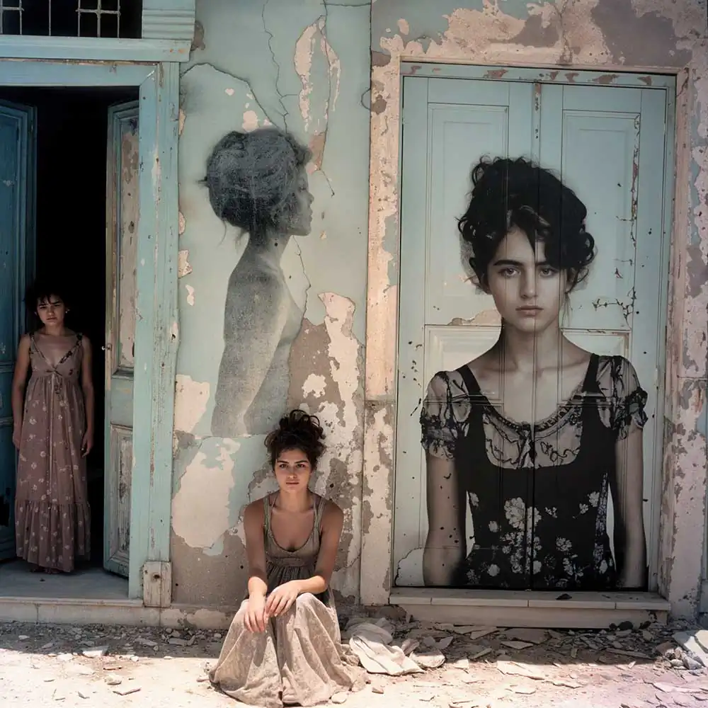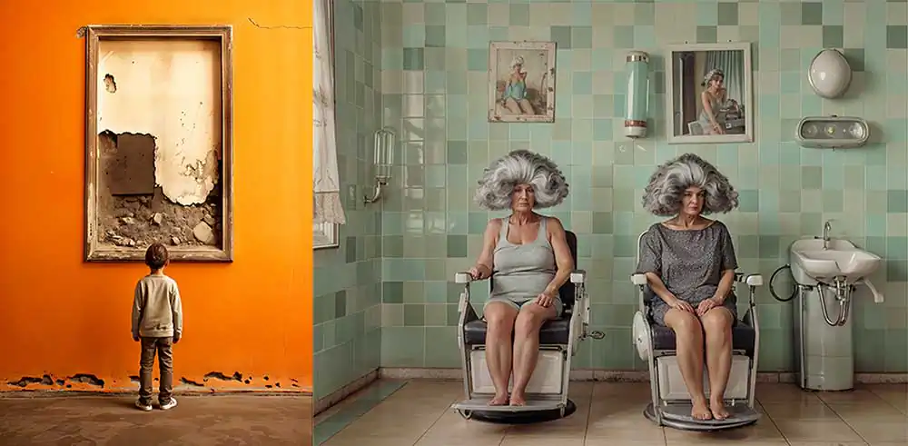 The fact is that that day, the algorithm began to propose images of worlds that resemble our own, but slightly distorted. Women in improbably wigs appeared; decadent scenes inhabited by replicated female figures on murals hidden in niches and doorways; still but familiar landscapes that I felt belonged to me. And most of all, a little girl dressed in orange or living in an orange world, which strongly reminded me of the massacre perpetuated nowadays.