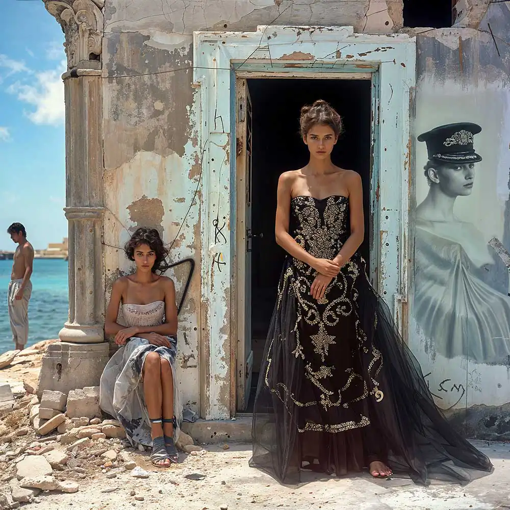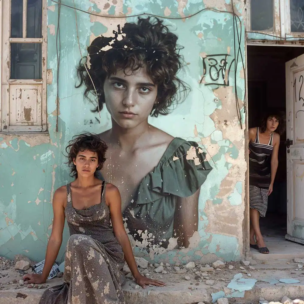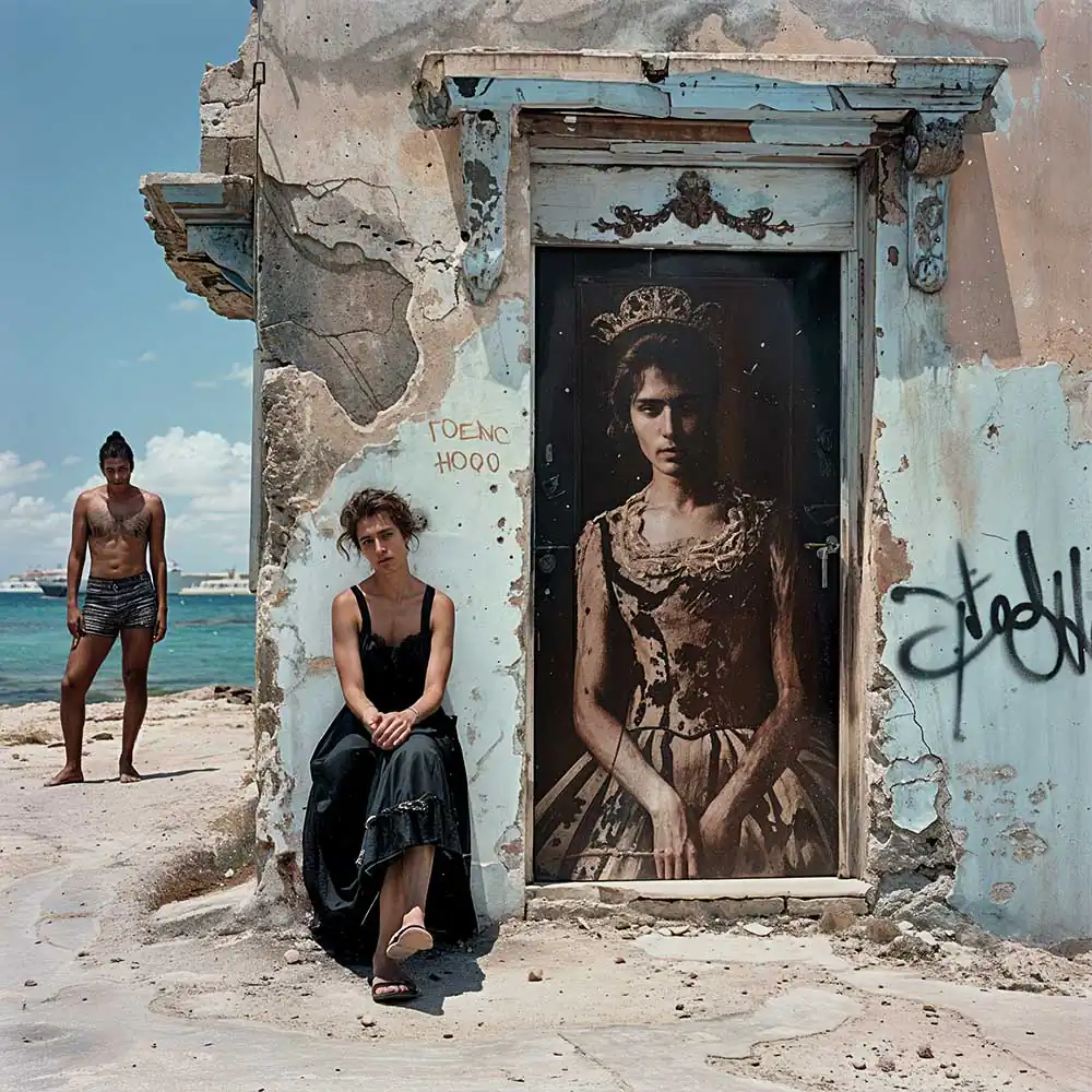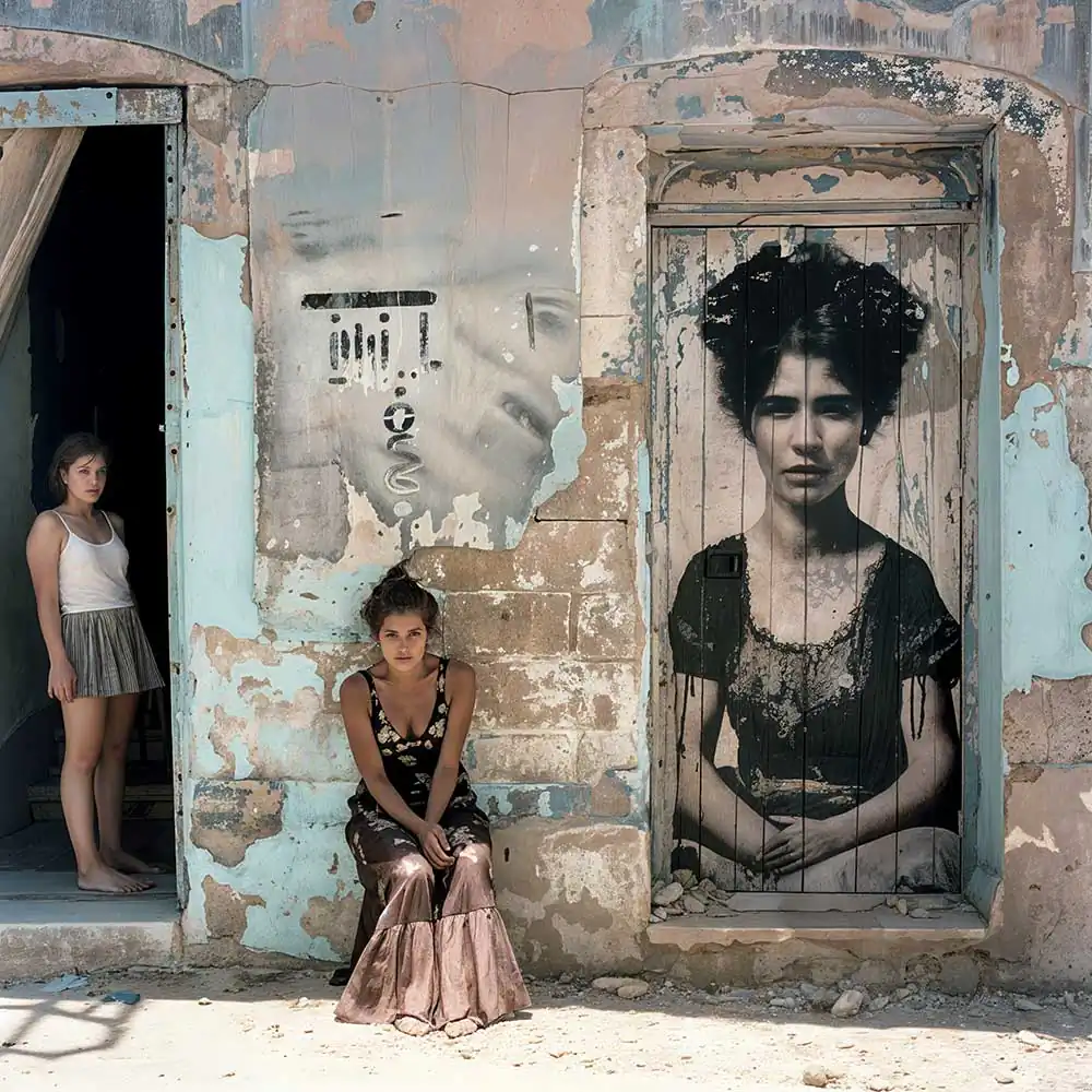 The fact is that that day, the algorithm began to propose images of worlds that resemble our own, but slightly distorted. Women in improbably wigs appeared; decadent scenes inhabited by replicated female figures on murals hidden in niches and doorways; still but familiar landscapes that I felt belonged to me. And most of all, a little girl dressed in orange or living in an orange world, which strongly reminded me of the massacre perpetuated nowadays.