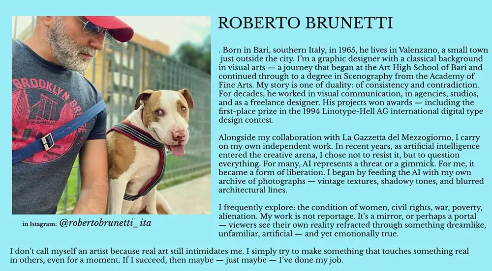 His curious and experimental spirit meant that when AI appeared in the artistic sector, he quickly took possession of it, seeing it as one more tool in his palette of possibilities. For Brunetti, AI is not a fashion to chase, nor an enemy to fight. It is a medium, a filter, a catalyst. A powerful tool for telling stories that need new forms. ‘I am not looking for photographic truth, but emotional truth,’ he says.