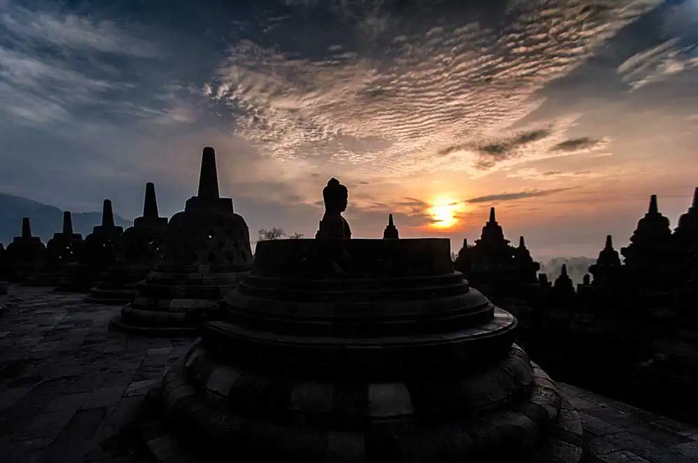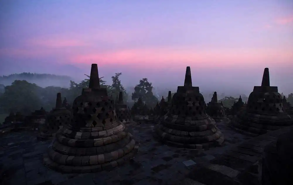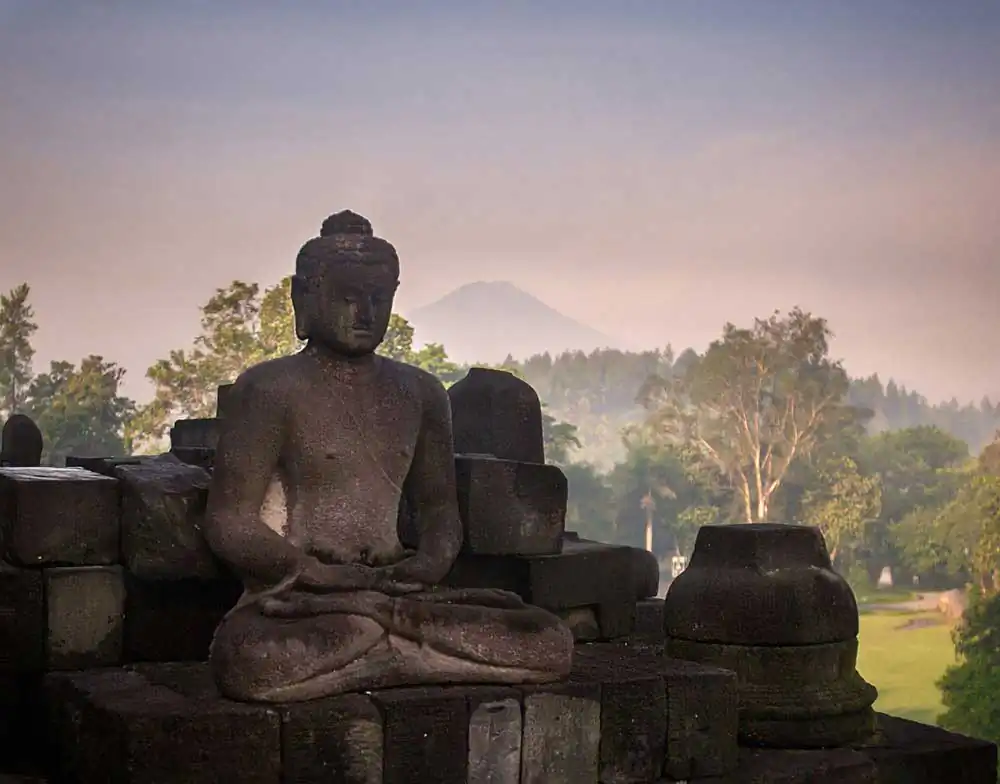 I close my eyes, deeply breathing in scent of jungle and lyrical call of Adhan, calling faithful to a Morning Prayer. Borobudur is slowly casting a spell on me with syncretistic blend of Hinduism, Buddhism, and Sufi-influenced mystical Islam, further amplifying feelings of reverence. Slowly, pilgrims with their heads down low, deep in prayers are beginning their solemn procession around each level to the top. There is no incense burning at Borobudur, just peace, serenity, and mystical magnificence of the ancient temple.