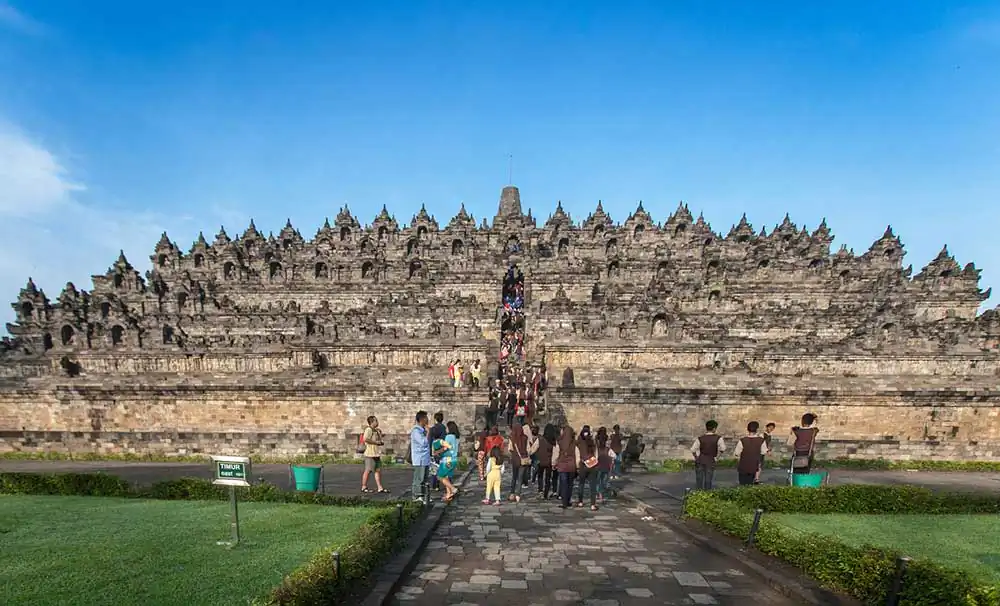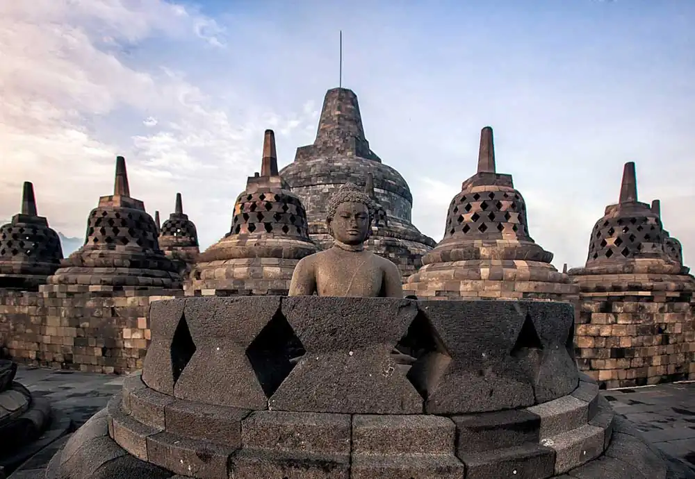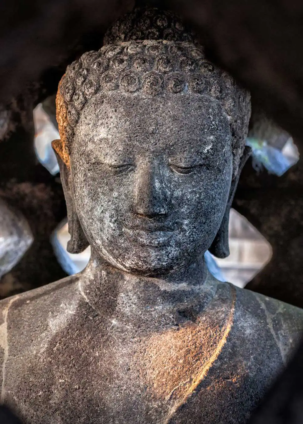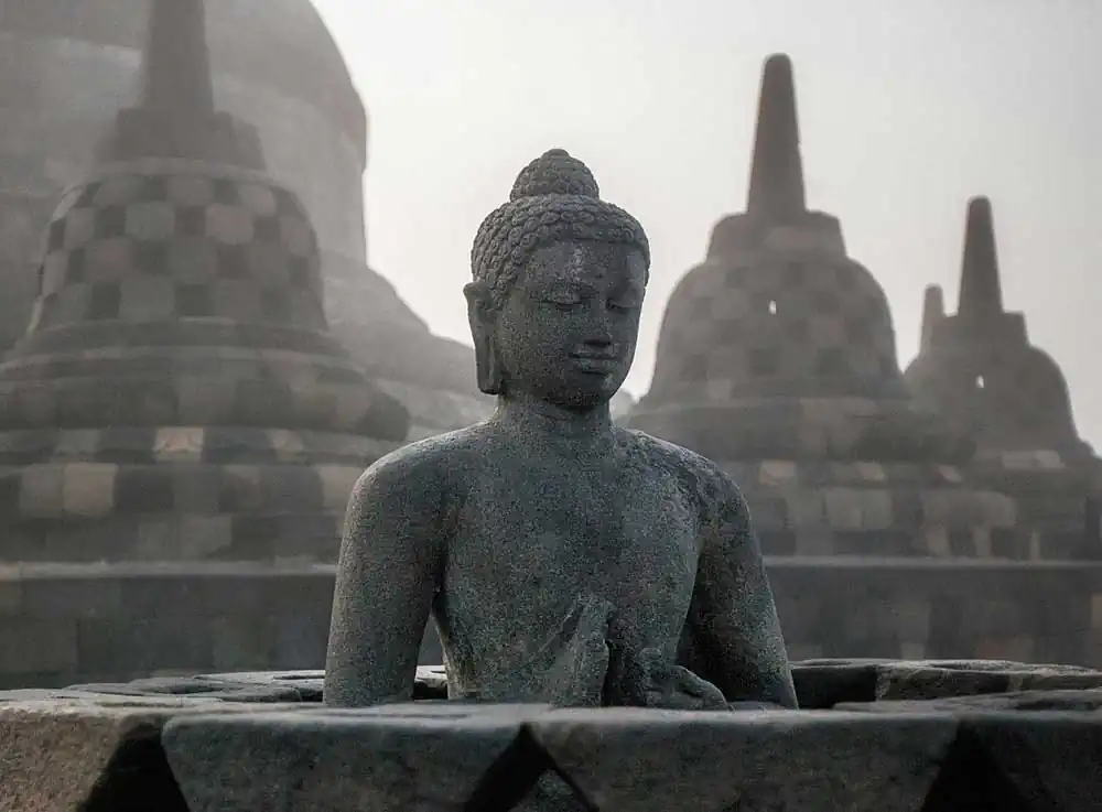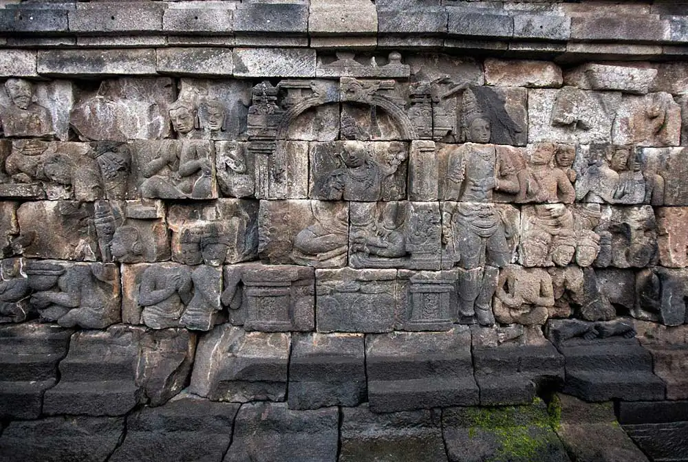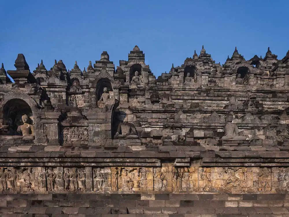 For over 1,200 years, pilgrims ago have traveled to Borobudur to worship and marvel at the thousands of sculptured figures carved into the lower tiers of Borobudur. In their solemn narrative carvings, convey the insights of faith in a sequential storytelling framework. Meticulously carved relief sculptures facilitate meditation on a physical and spiritual journey, which guides pilgrims progressively toward higher states of consciousness.