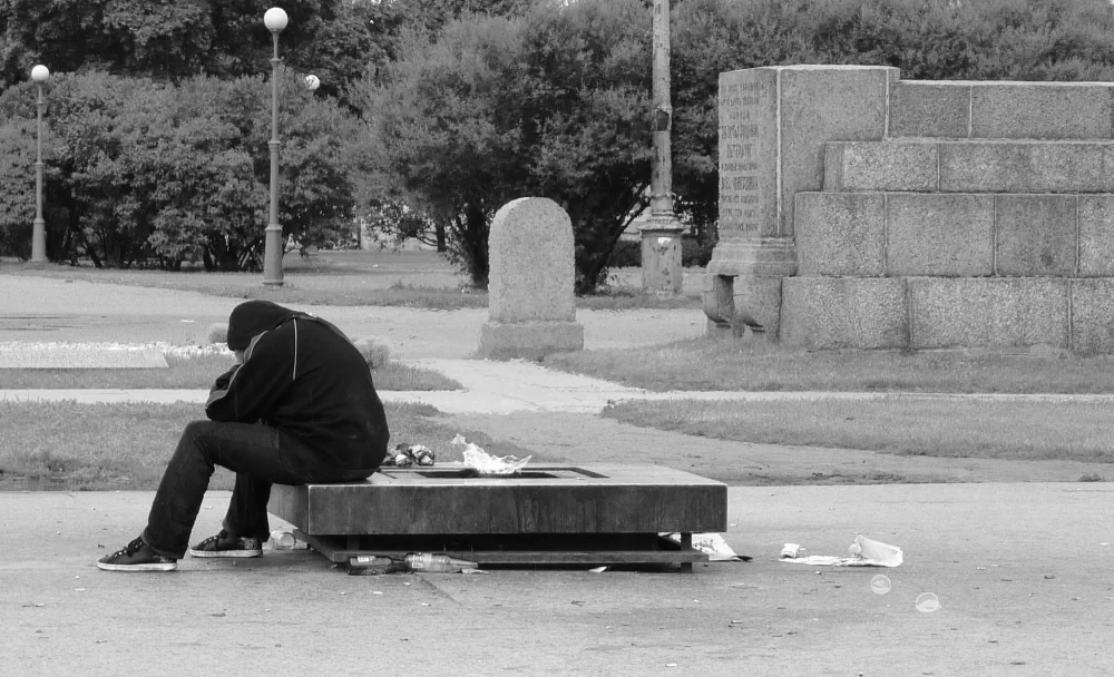 There is a photograph of a man in a cemetery, sitting on the edge of a platform that contains the eternal flame. While his face is not visible, the slouch of his body and his head in his hand convey sadness. At his feet are empty beer bottles and garbage, adding a sense of despair.