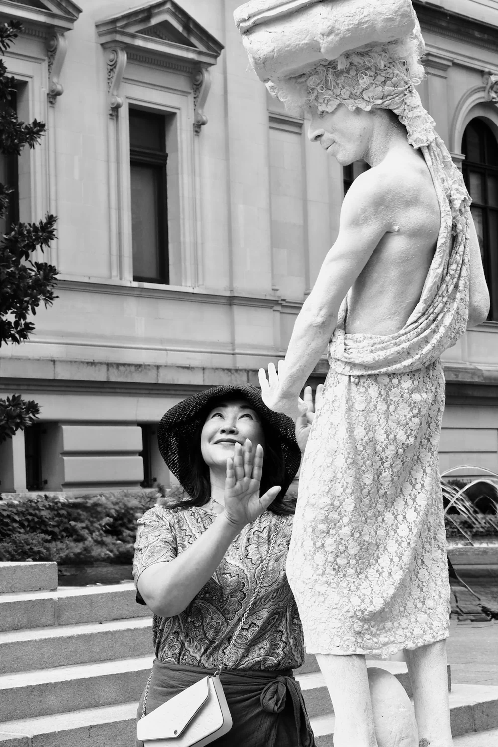 Some people connect in a less personal way to engage and entertain, playing music in public spaces or dressing as a living statue.