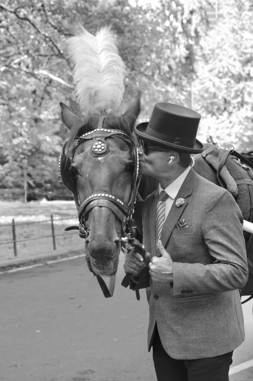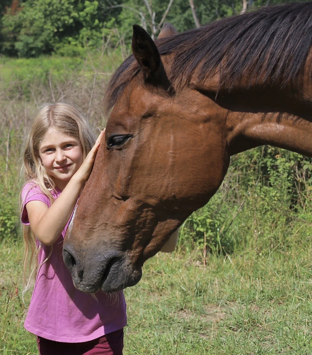 There are two photographs that show the loving relationship people can have with animals. A child places her hand on the face of a horse, which relaxes under her touch. A horse stands calmly on a loose rein while the carriage driver gently kisses its face.