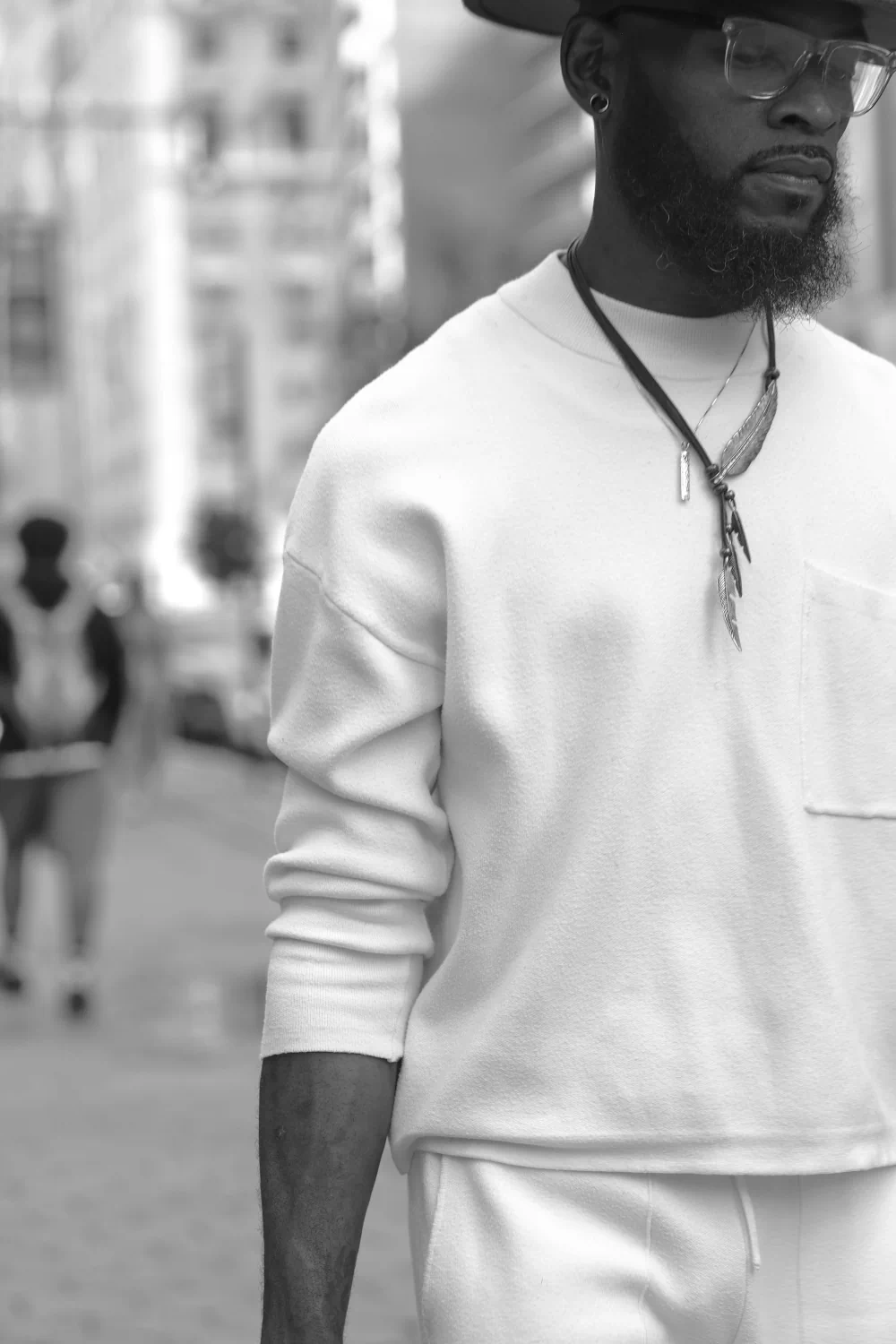 Some of the photographs represent the solitary aspect of life, both the times one is truly alone and the feeling of being alone in a crowd. A young woman applies makeup in a public bathroom. An old woman sits on a park bench. A man dressed entirely in white walks down the street, averting his eyes from the crowd.