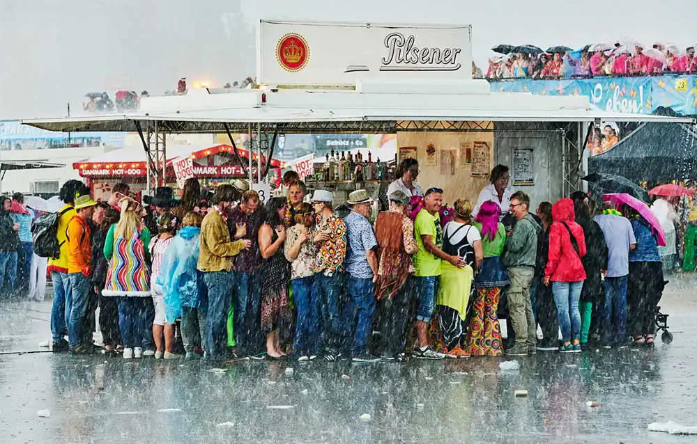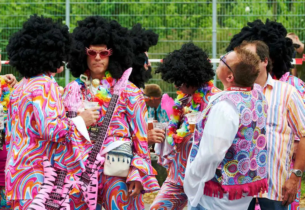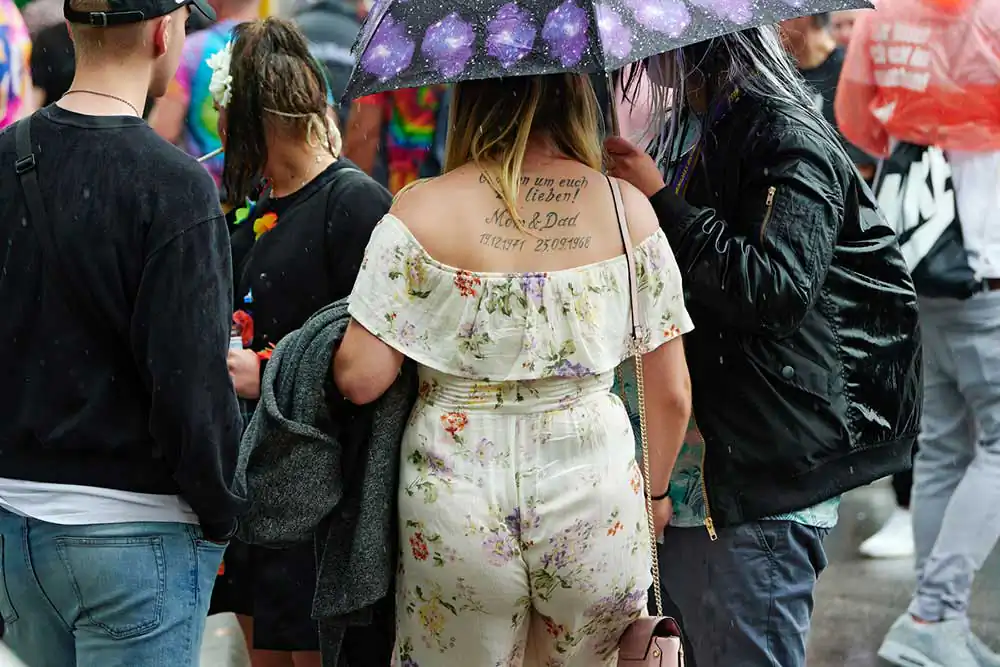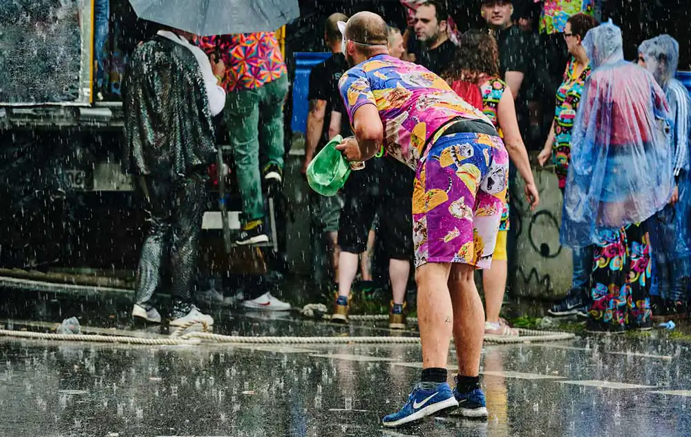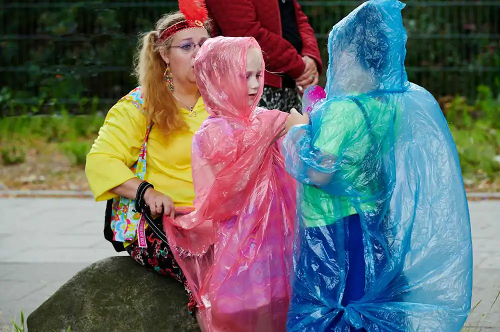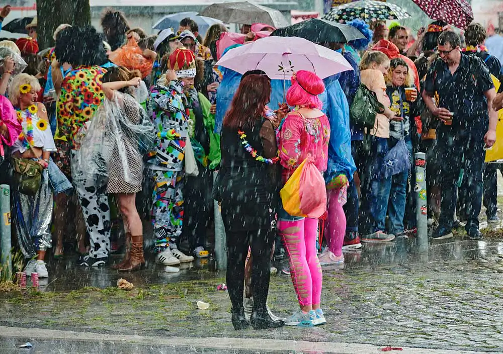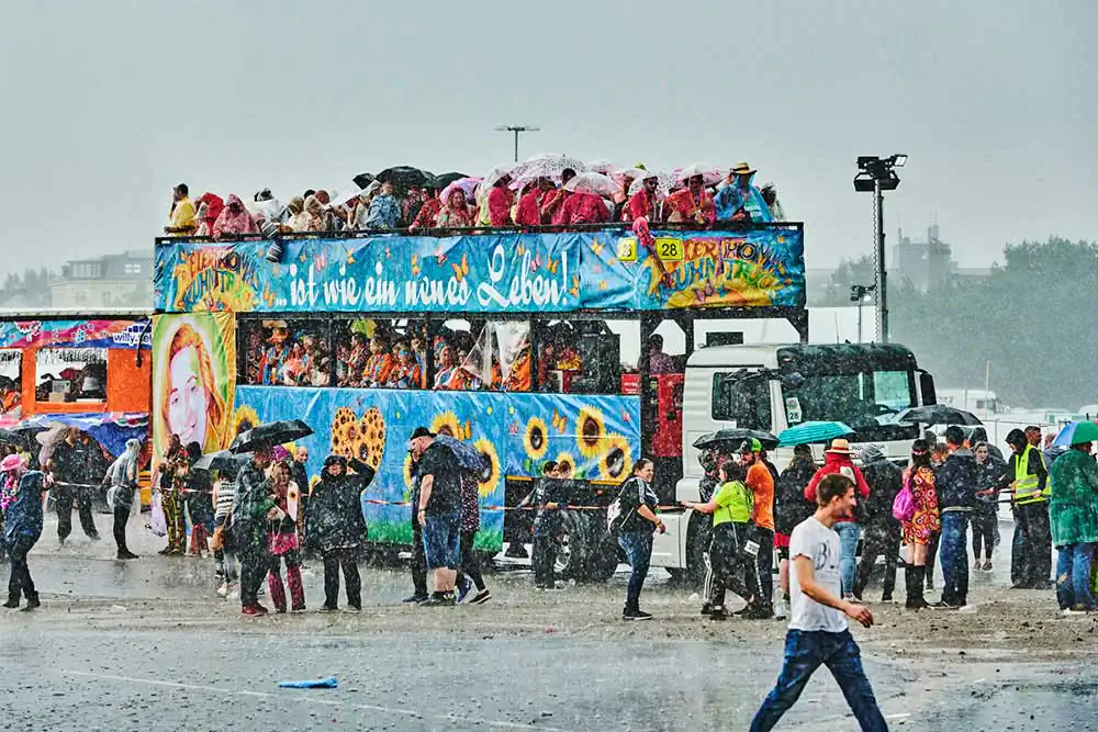 The participants gather on a large square in the middle of the city to take a seat on one of the “festively and eye-catchingly” decorated trucks and dance to the pop music. Here you also meet with like-minded people with whom you would like to experience this event together. Of course, the participants dressed, or better said dressed up, in an appropriate outfit. And this colorful and sometimes bizarre disguise gives this event a certain cheerful touch. There are young women who have dressed up as “King of pop”, a “boy group” with guitar, self-indulgent teens, a large group of smurfs, imaginative make-up, other meaningful disguises and people who still have to check important messages quickly. What made this event so special that day, before the actual “move” on the trucks began, was a powerful, intense sudden rain shower that lasted for over half an hour, and for which, of course, very few participants were prepared. Children were quickly wrapped in “foils”, others squeezed together under an umbrella, some simply ignored the rain and then had a rather wet costume. The snack and beverage pavilions set up on the square quickly became a “last resort” for many participants and crowded under the narrow roofs. Some of them were already sitting in the two-story trucks and those on the lower floor were much more “cheerful” than those on the upper floor. The whole place changed very quickly into a “landscape” with many water areas. But this downpour did not discourage the participants, on the contrary. It gave the impression that it had become a particularly funny touch to this “Schlagermove” (“Hit song-Move”). (Official Website)