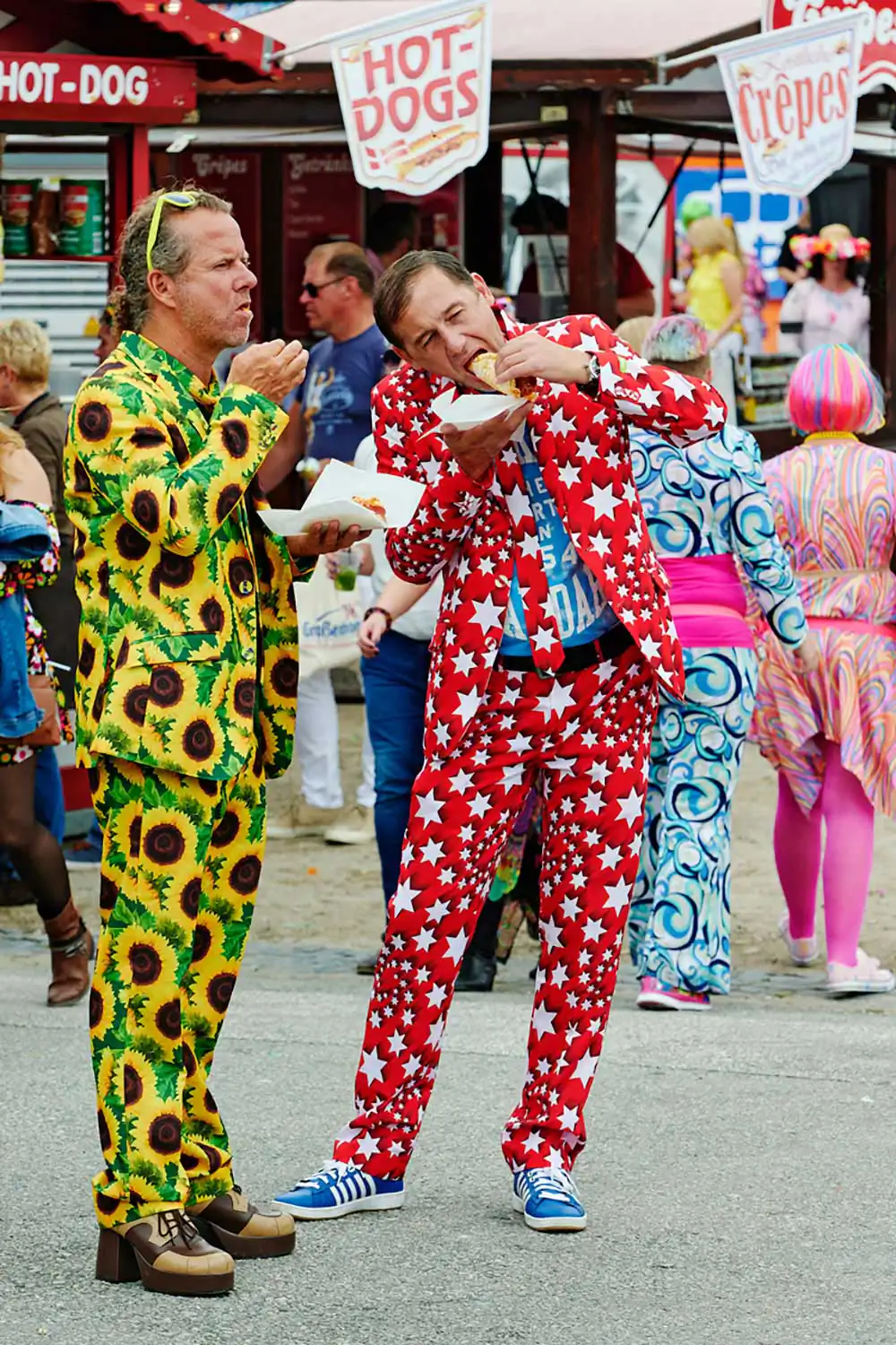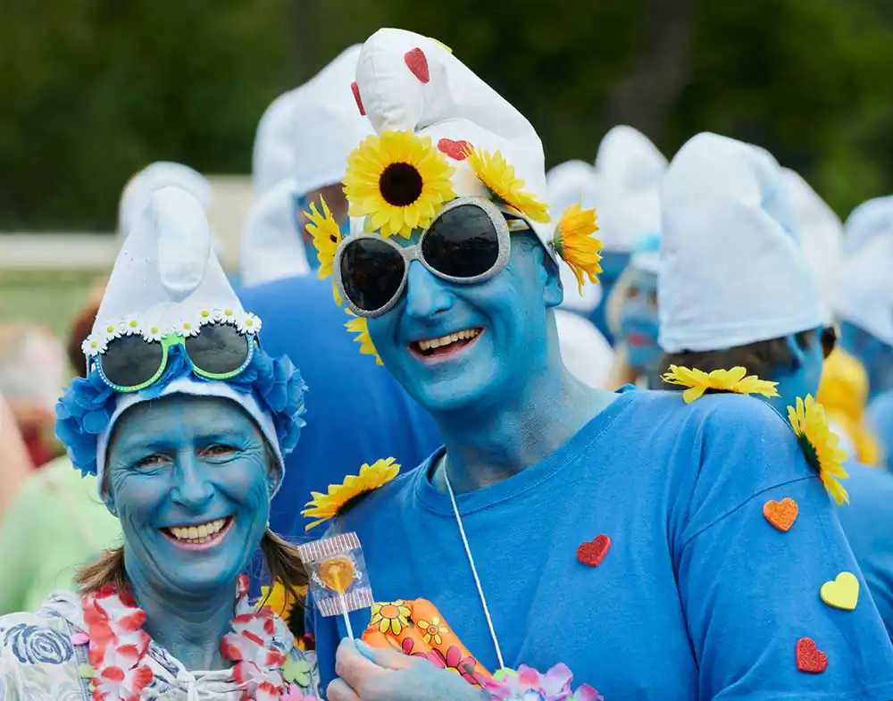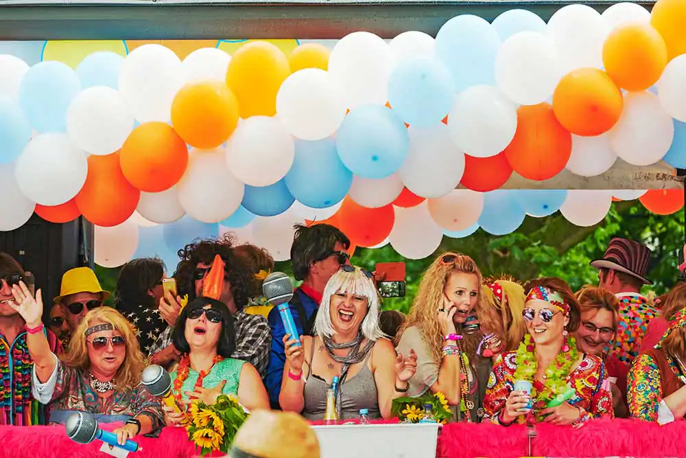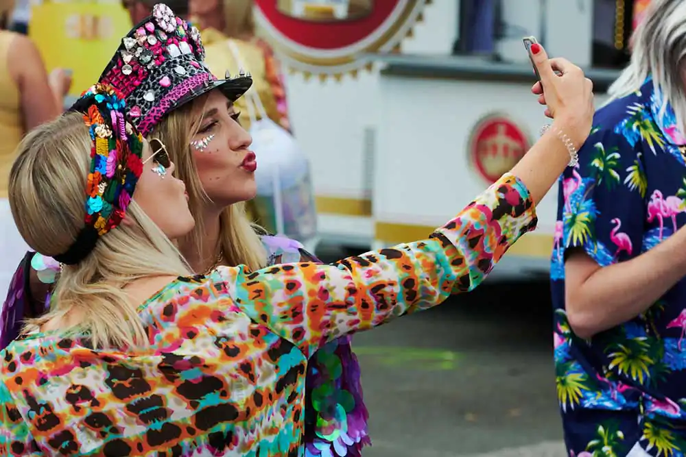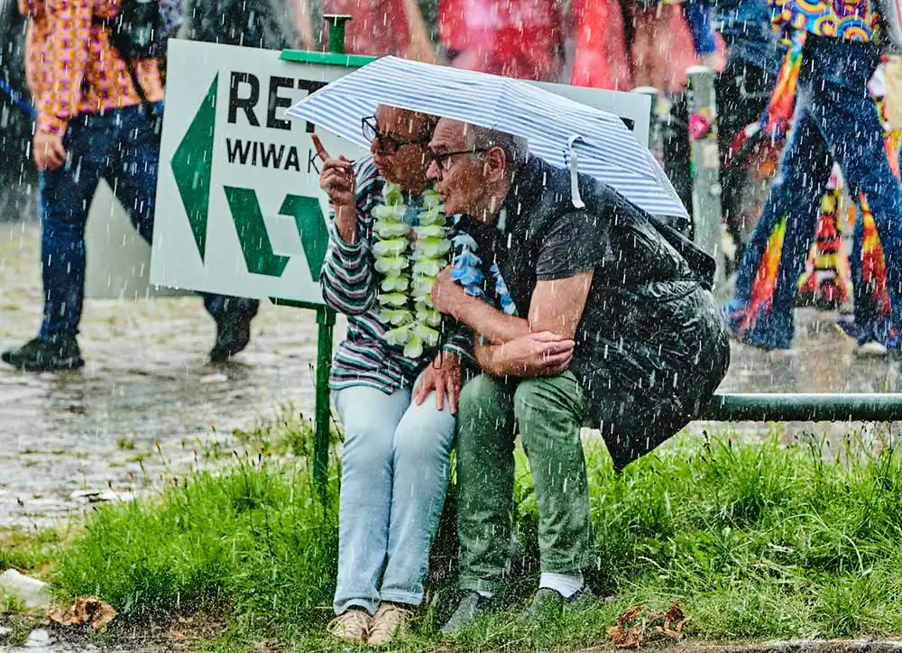 The participants gather on a large square in the middle of the city to take a seat on one of the “festively and eye-catchingly” decorated trucks and dance to the pop music. Here you also meet with like-minded people with whom you would like to experience this event together. Of course, the participants dressed, or better said dressed up, in an appropriate outfit. And this colorful and sometimes bizarre disguise gives this event a certain cheerful touch. There are young women who have dressed up as “King of pop”, a “boy group” with guitar, self-indulgent teens, a large group of smurfs, imaginative make-up, other meaningful disguises and people who still have to check important messages quickly. What made this event so special that day, before the actual “move” on the trucks began, was a powerful, intense sudden rain shower that lasted for over half an hour, and for which, of course, very few participants were prepared. Children were quickly wrapped in “foils”, others squeezed together under an umbrella, some simply ignored the rain and then had a rather wet costume. The snack and beverage pavilions set up on the square quickly became a “last resort” for many participants and crowded under the narrow roofs. Some of them were already sitting in the two-story trucks and those on the lower floor were much more “cheerful” than those on the upper floor. The whole place changed very quickly into a “landscape” with many water areas. But this downpour did not discourage the participants, on the contrary. It gave the impression that it had become a particularly funny touch to this “Schlagermove” (“Hit song-Move”). (Official Website)