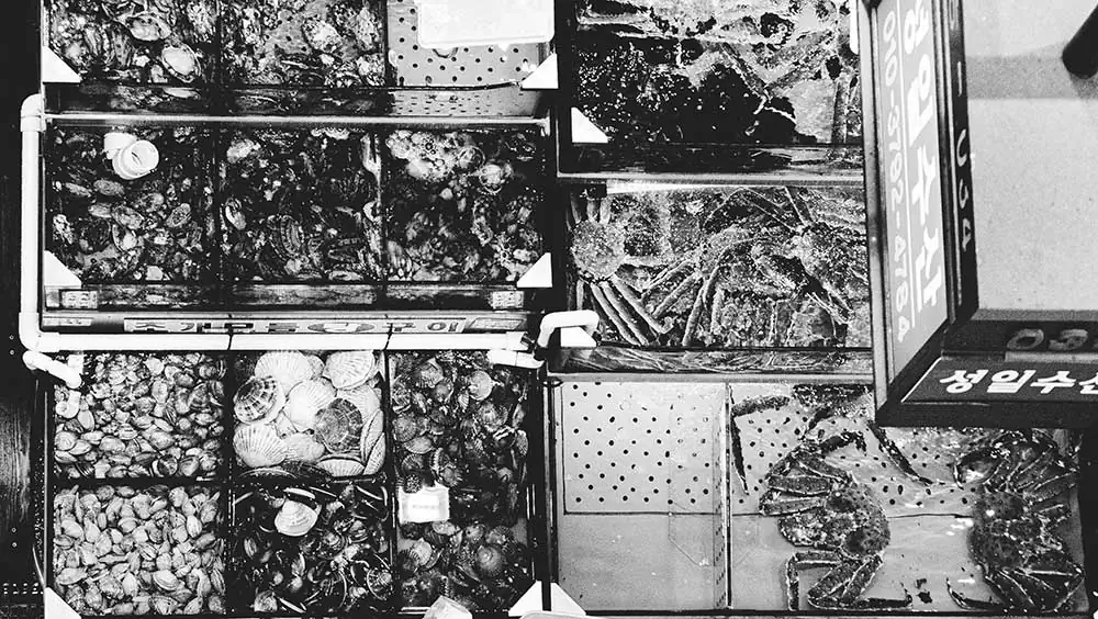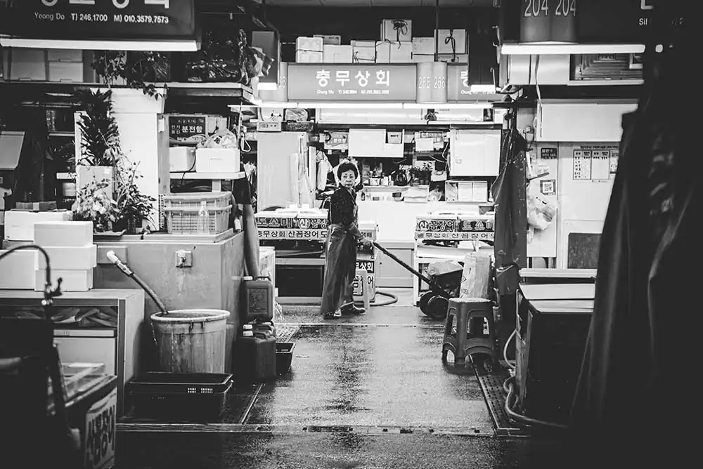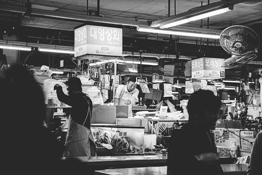 Soaked floors, endless rows of tanks full of busy waters, and an unmistakable pungent smell invades the senses; the crisp welcome of a fish market in Korea.