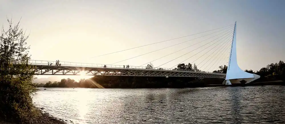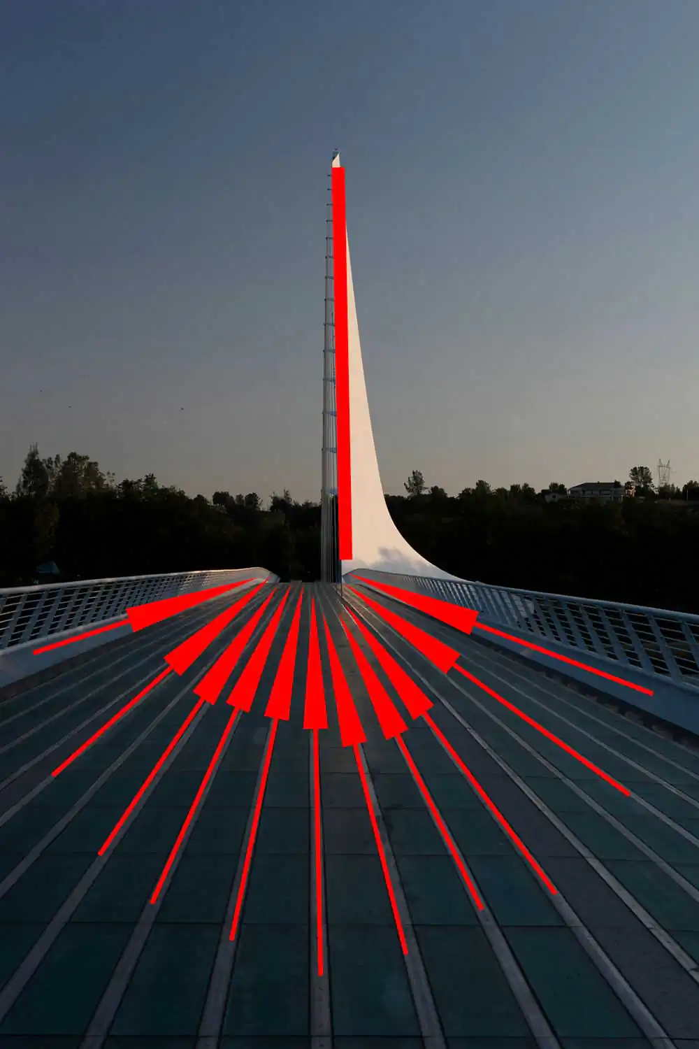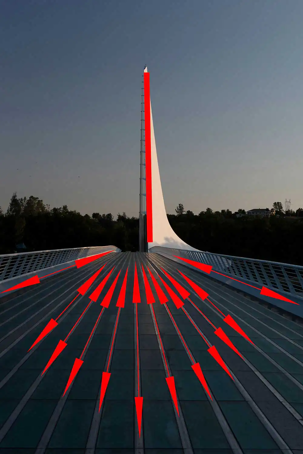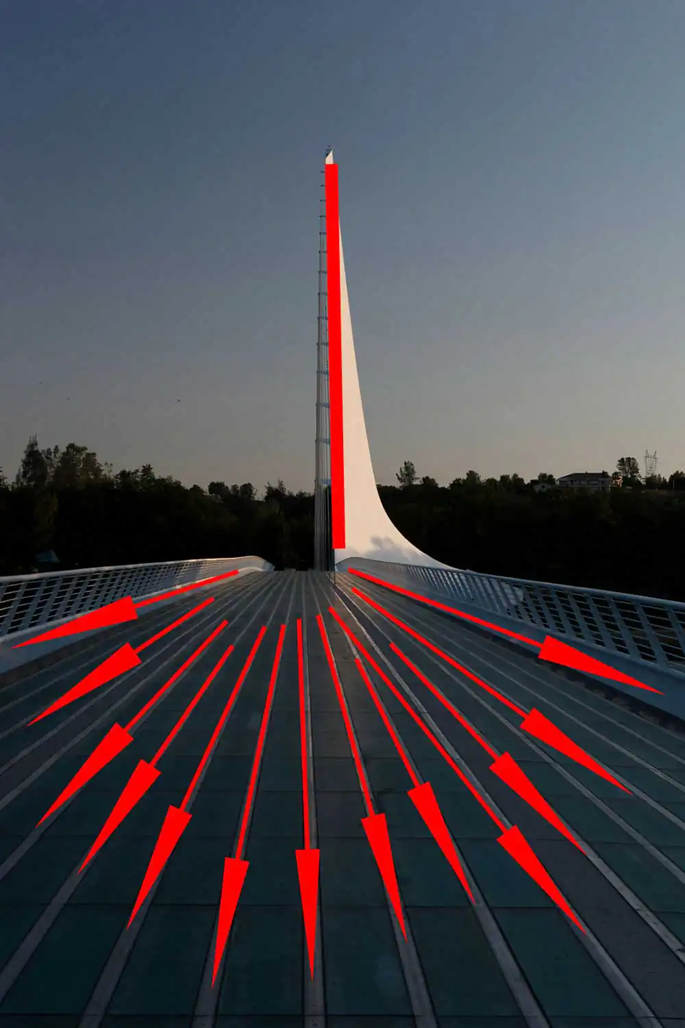 The Sundial Bridge: designed to cross the river exactly north to south with the main pylon located on the north bank of the Sacramento River. The image above depicts a postcard photo of the bridge; the challenge was to show the bridge in an original and artistic way.