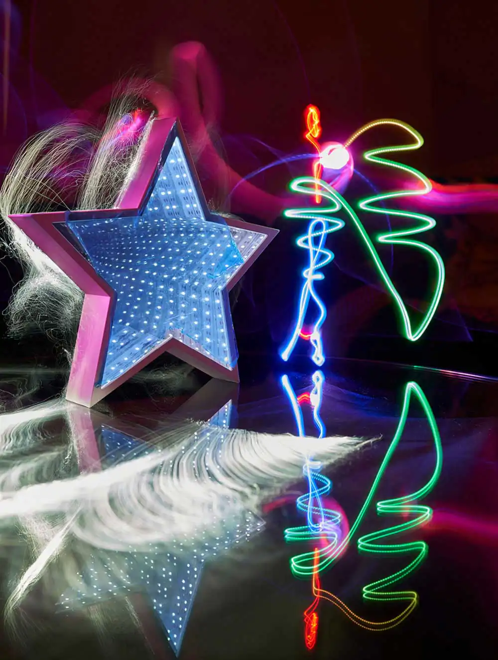 Big cities, special light installations of festivities and buildings, objective light, conceptional paintings with handmade lightpainting tools and spectacular light shows in nature are the basic tools Angelica works with to visualize AngelsView light paintings.