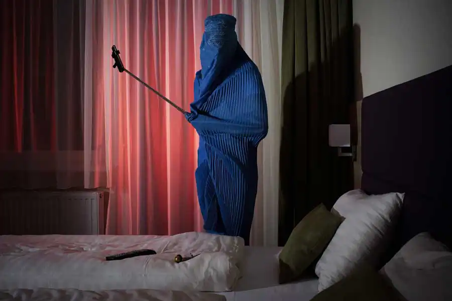 In “Hotel Room Selfie” the burka covered character is holding a selfie-stick in what appears to be a hotel room. The white translucent curtain is closed, and red light from the outside is shining through. In other words, it is a private act in a private space. However, the character is dressed for the public space, so the act is therefore at the same time not very private. The only presence of public space is the red light outside the room, which has connotations to “sinful” behaviour and nudity.