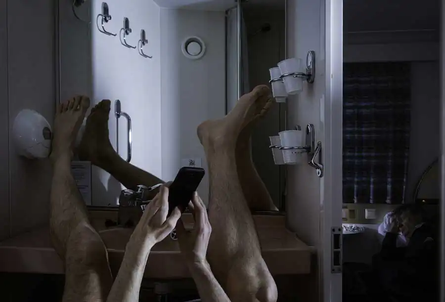 Characteristic for Eliassen ́s images is the duality they present us with: The images are fictional, but at the same time they pretend to be for real. In these particular photographs, this becomes evident when we become aware of how the images are aestheticized and professionally lit, at the same time as the characters are unaware of being photographed. They are only posing for them selves and their smartphones, and their focus is elsewhere, not directed towards us. The places represented in the photographs are both trivial (e.g. bathroom and hotel room) and typical (scenic landscapes), which creates connotations to both everyday life and more classical imagery, thus creating a paradoxical sphere of fiction and authenticity simultaneously.