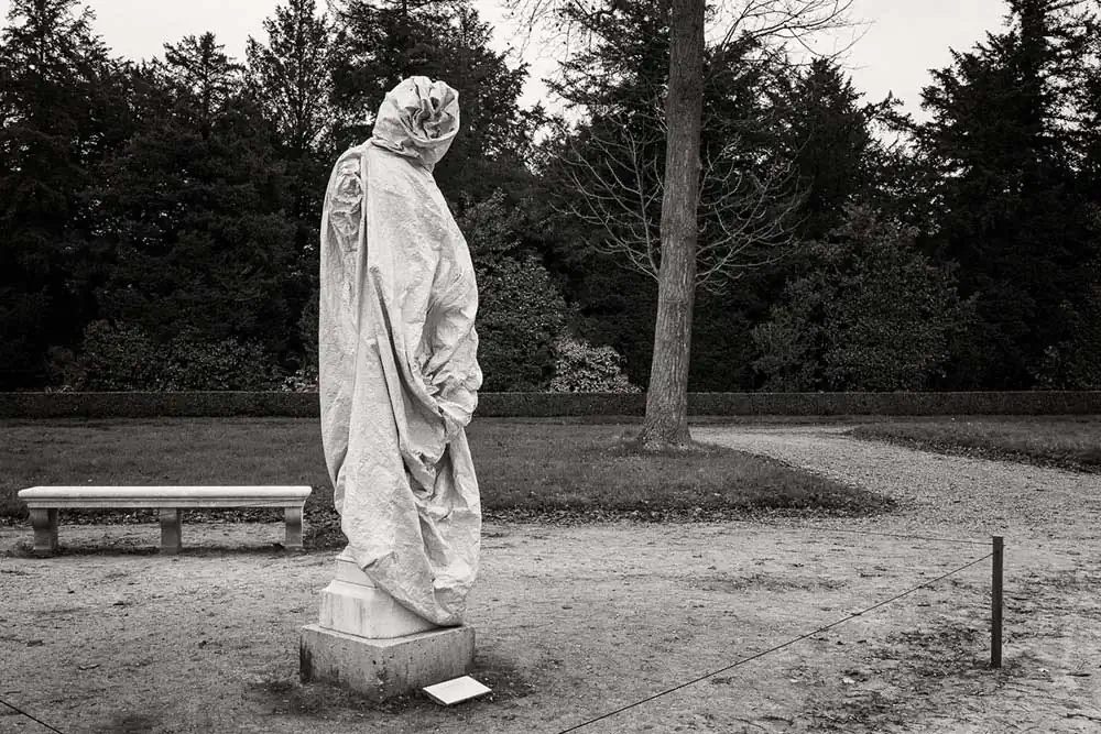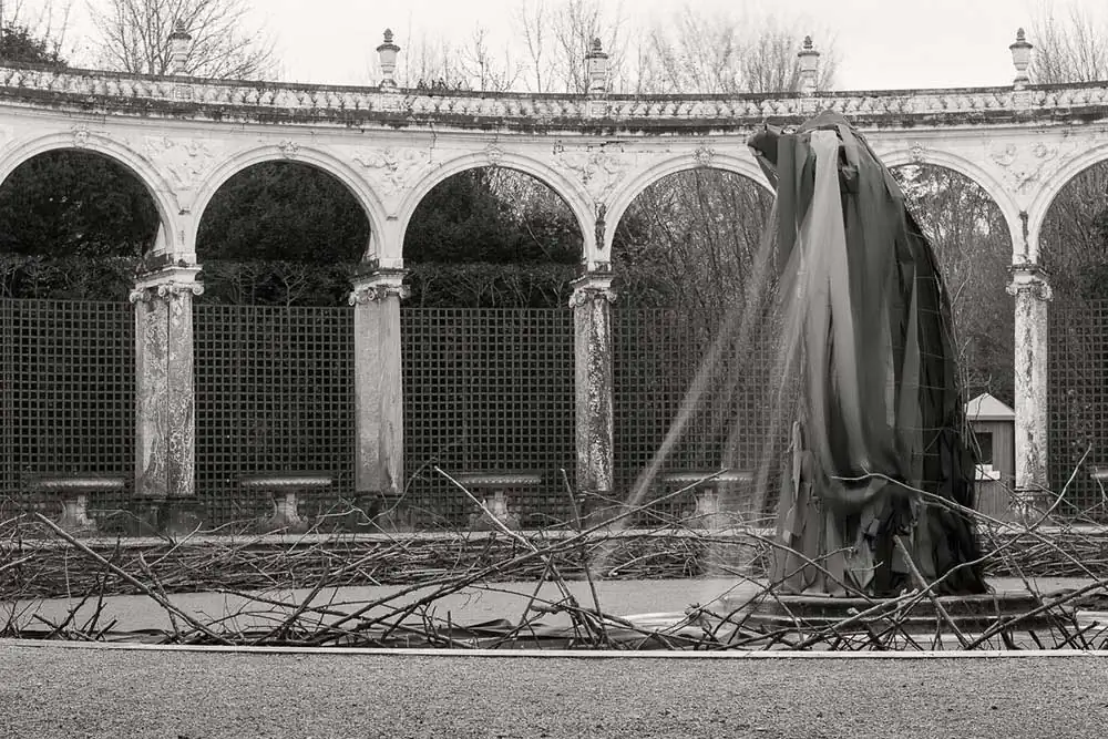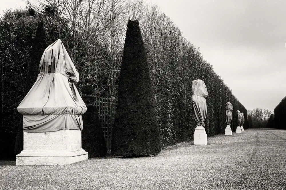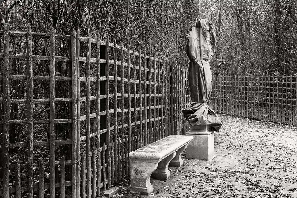 My motivation in this project was to bring out the symmetry and tranquil atmosphere of the gardens and to outline their stark elements with the subtle, yet so firm, Euclidean geometry of their shapes and lines.The foggy winter weather provided a suitable context. During winter the statues are wrapped up in order to be protected from rain and cold.When you watch the wrapped statues, you feel as if taking part in a theatrical performance, a mystery with enigmatic, unidentified characters.The vastness of the landscape is endowed with power and energy. The challenge was to recreate the awe caused by the topography of the place and reveal its substance, texture and coarseness.