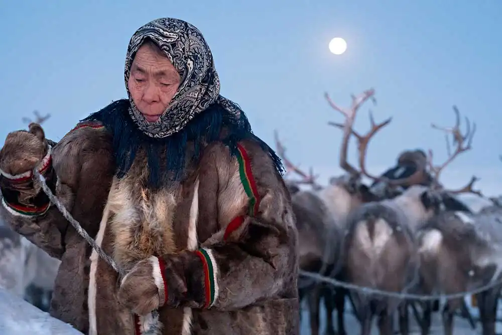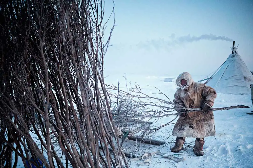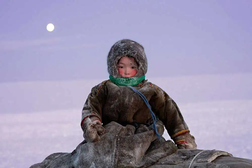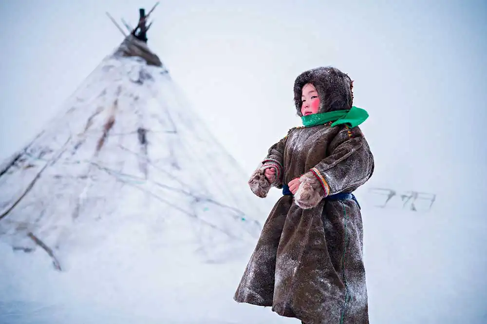 The main occupation of the Nenets is herding and when their reindeer decide to move to find other pastures, the family must follow them, the chum (the typical Arctic tents) must be dismantled and loaded onto the sleds. The path to follow has been the same for hundreds of years, every family knows when and how to move across the boundless polar tundra. Migration day is ideal for spending time and watching how laboriously they tidy up their things. It is interesting to study their movements made repeatedly at each change of outpost, they are figures wrapped up to withstand extreme temperatures, their cheeks are red like ripe apples, their movements made clumsy by the thick layer of fur. It is incredible to observe and share this day with them as the thermometer marks impossible temperatures.