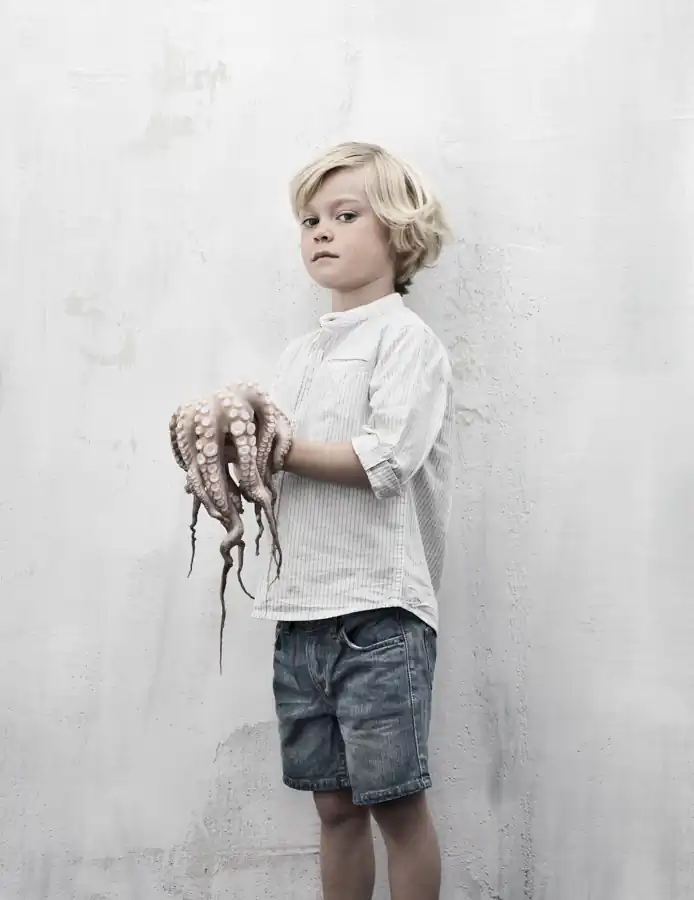 Again I wanted to create still life portraits of children and I wanted to add a special subject. I thought of marine life. And all the children had to be 5 years old, like my son. All of this was in an effort to challenge myself. The models are friends from school and children I know. I knew it would not be easy by getting all the children holding a fish or living lobster. Funnily enough, the children were very brave with the fish. The fish smelled and were very slippery and cold.