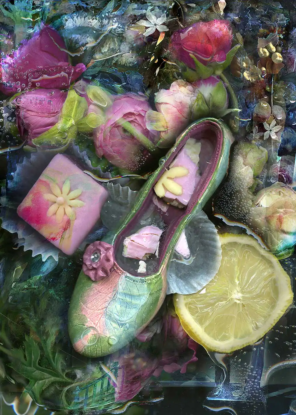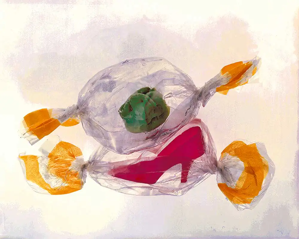 Over time, my protagonists in art have been old toys and trinkets from storage bins, discarded clothing, vintage photographs and objects found on beaches or city sidewalks. The first shoe I created was a pink Barbie pump stepping on a giant wad of gum. Gum on My Shoe was part of an early series which used sweets and fruit as surrogates for the fetishization of women. I then continued to take pictures of dolls and their accessories as stand-ins for girls, for childhood, for myself. But I often returned to the shoe and its allegorical possibilities.
