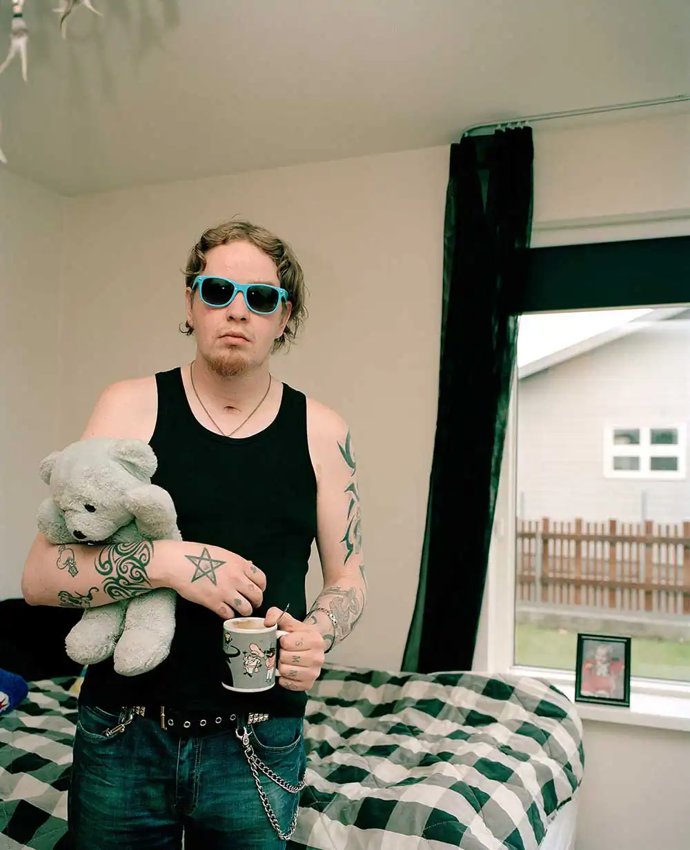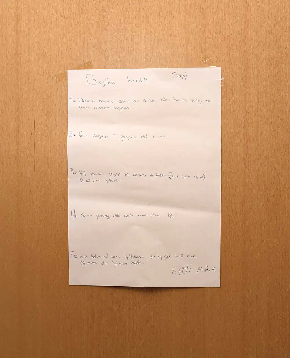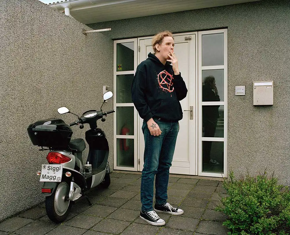 On our way back, at the end of the day, we go to have a coffee at Kristinn’s. Arrives a big fellow. He is with a friend. They both sit at a table to sip a hot drink. This big fellow with his hazardous gait looks like a regular and is completely at ease with everyone. He comes to greet us, Jeff and me. He speaks English perfectly. I listen to him. He tells me a lot of wacky stories. I wonder who he is. A young alcoholic, a drug addict? I don’t really know where he is bringing me with all those crazy stories. He proposes me to watch him playing characters: an old man, a pregnant man, an alien etc …I look at him. But who is he? Then, he tells me his story. Seven years ago, when he was 18 years old, Siggi had a serious car accident, after which he spent two and a half months in a coma. He miraculously got out but his life will not be the same. Promised for a great future, Siggi can not do much anymore because he has problems of balance, quickly forget what he is told or what he did the day before. In less than 15 minutes, he managed to break my prejudices, make me laugh and touch me so much that emotion and tears rise without restraint. I will stay for 10 days in Grindavík to hang out with Siggi, find out more. We play cards, we drink many cups of cold coffee, we smoke quite a lot of Camel, we laugh a lot together and we take pictures. I really admire him. For me, he is an indestructible Viking that nothing stops. I will spend another 2 weeks with him at the end of my 3 month trip in Iceland to complete the SIGGI’S WORLD serie.