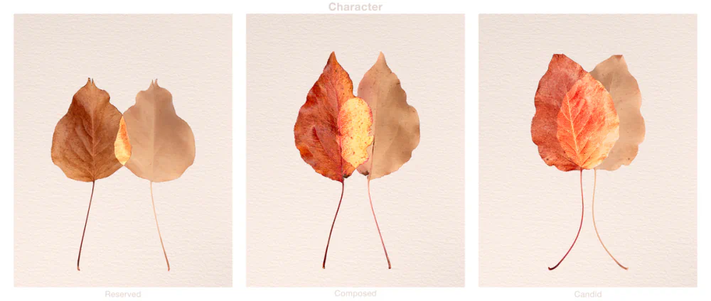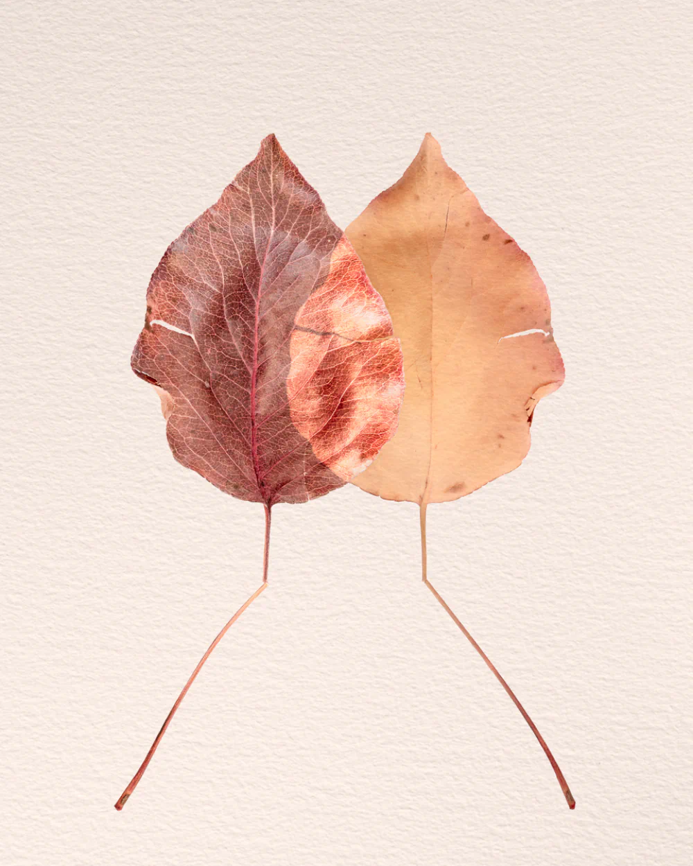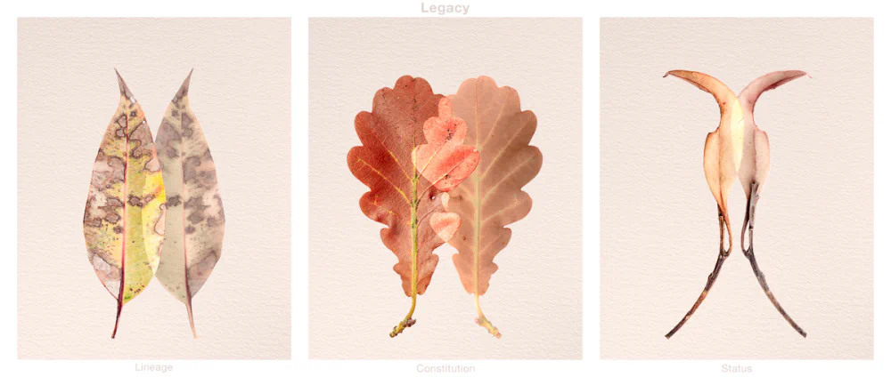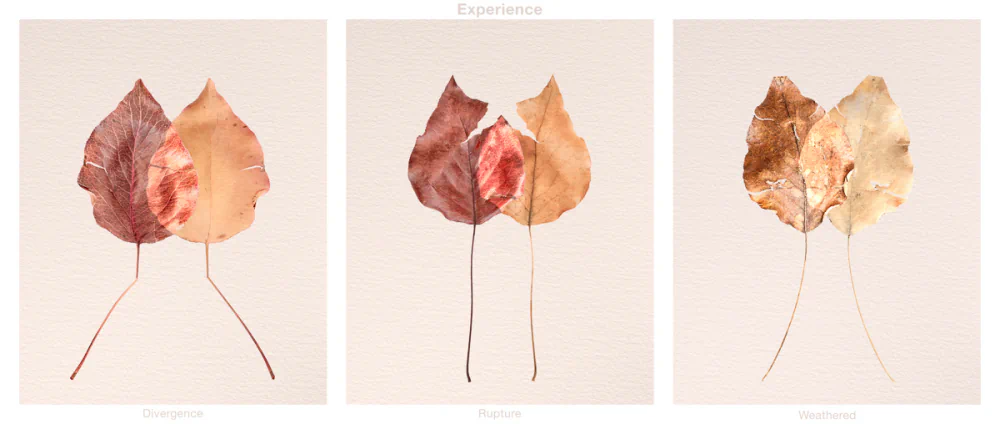 The remaining subjects extend this exploration into other aspects of human experience. In the group titled Experience, intersecting leaves suggest divergence, rupture, and the marks left by time. Across the series, the leaves act as quiet symbols of endurance. Though fragile and detached from the tree, they persist in altered form, echoing the ways identity adapts and survives through change.
